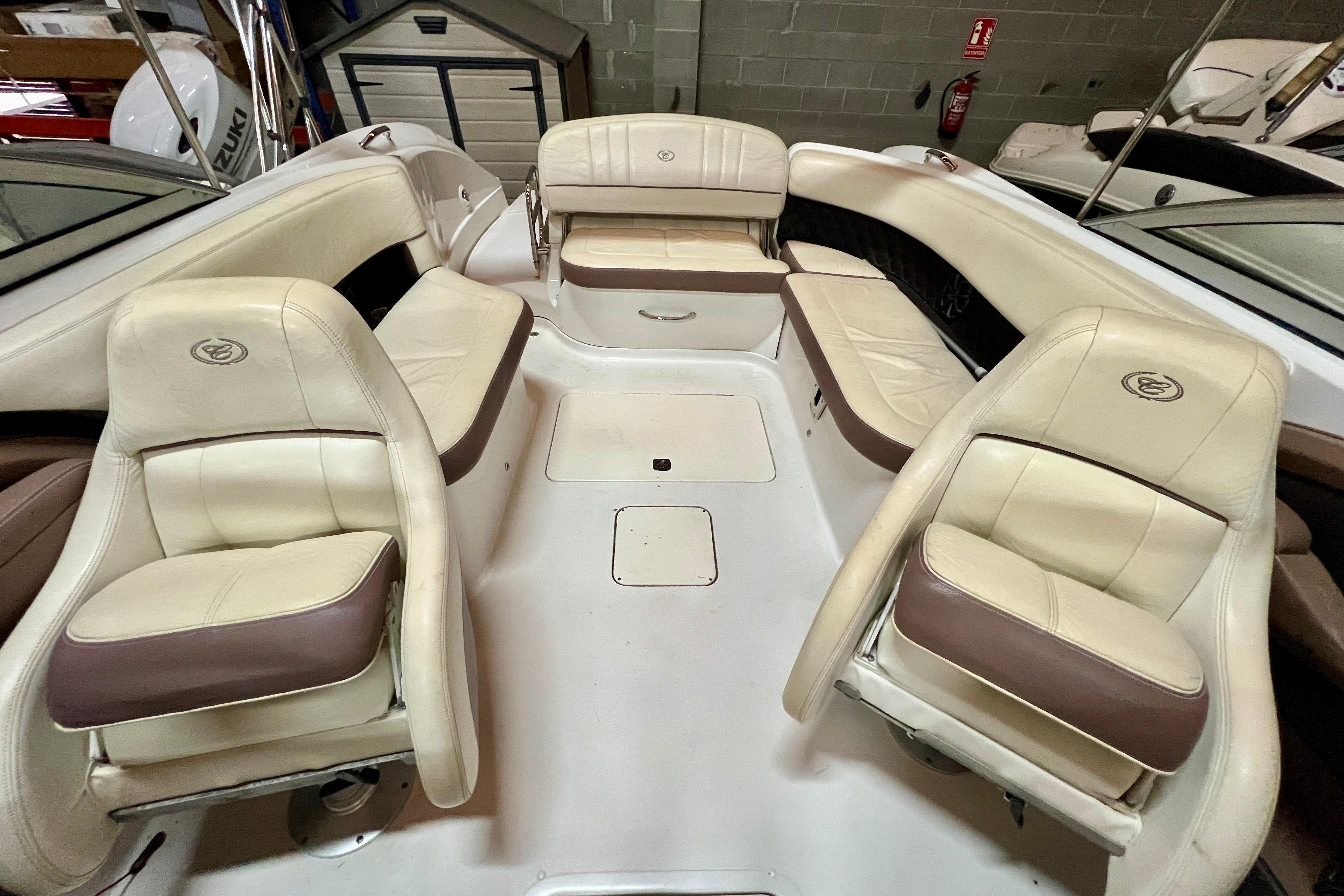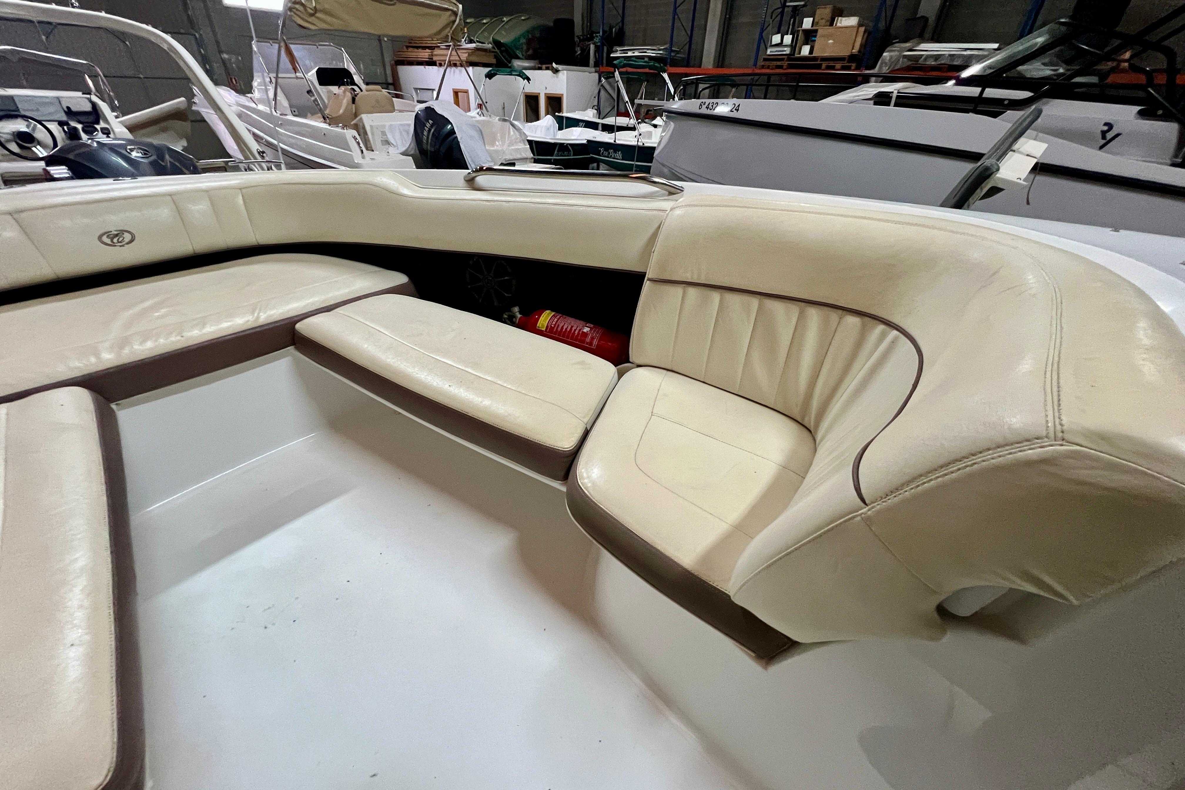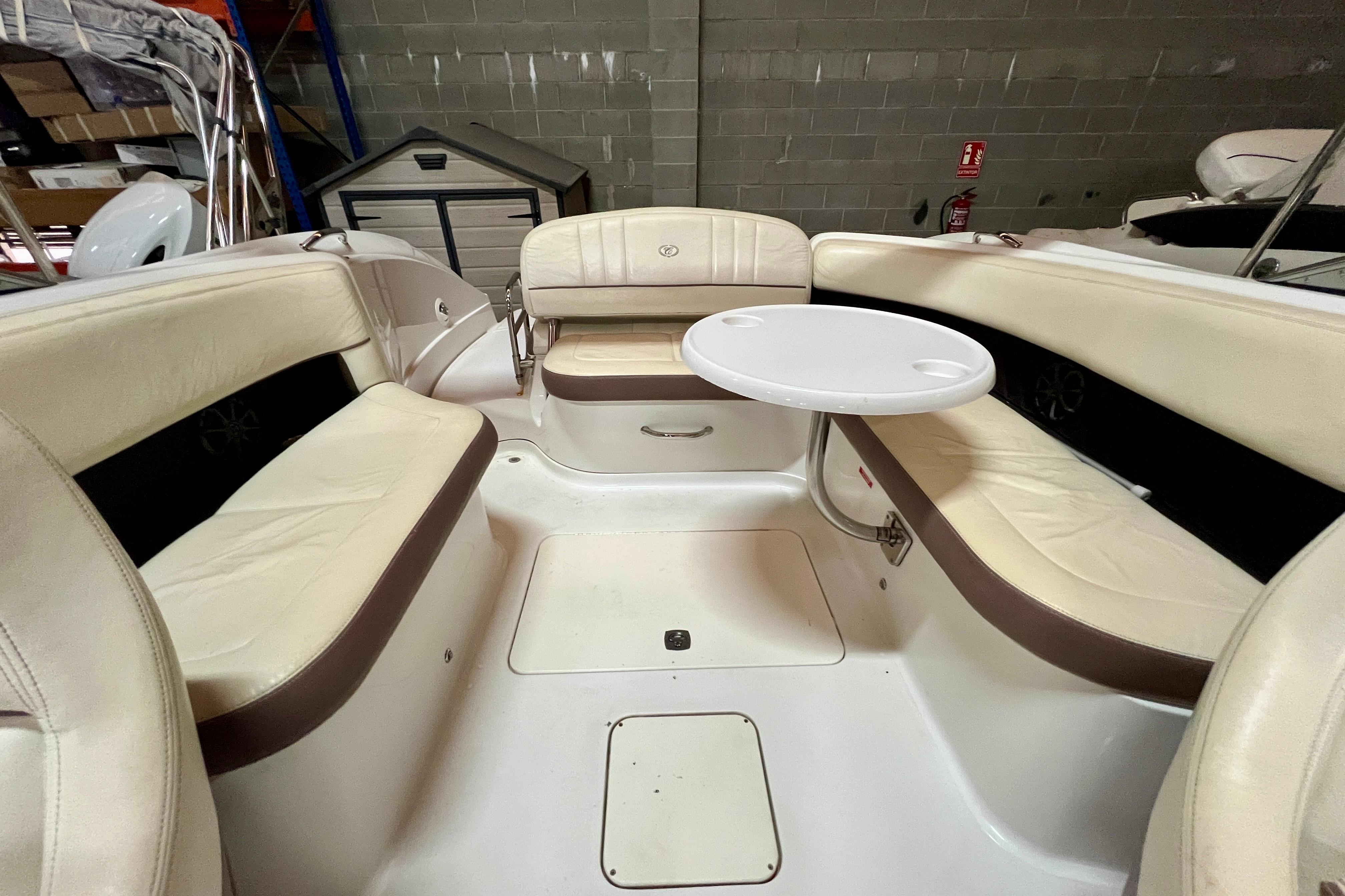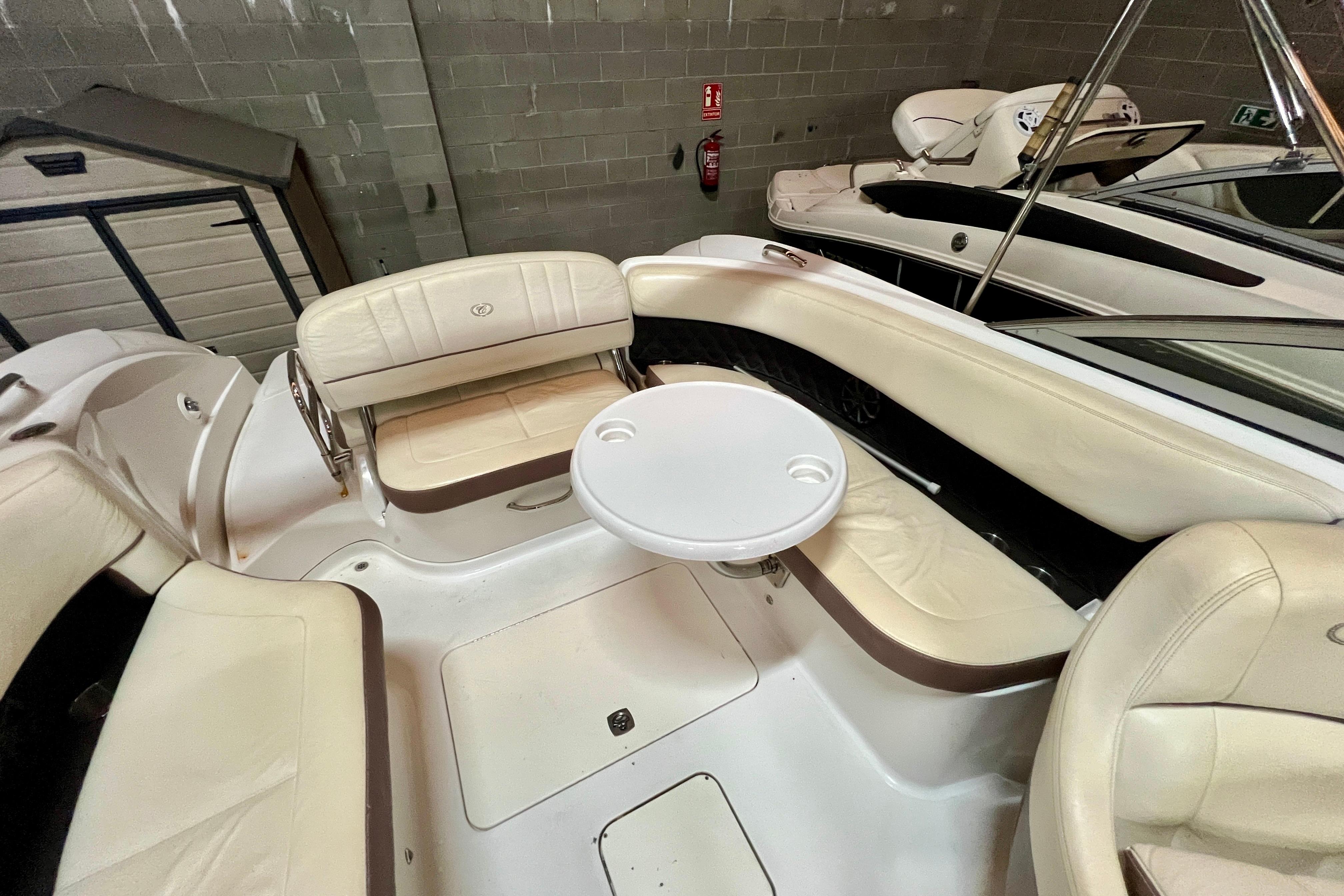 Su diseño interior destaca por un cockpit amplio, con asientos envolventes de gran calidad, zonas de estiba bien distribuidas y detalles pensados para el confort de los pasajeros. En proa encontramos una zona tipo bowrider muy versátil, perfecta tanto para relajarse como para disfrutar de la navegación en grupo. La plataforma de baño, amplia y cercana al agua, facilita el acceso para actividades acuáticas.