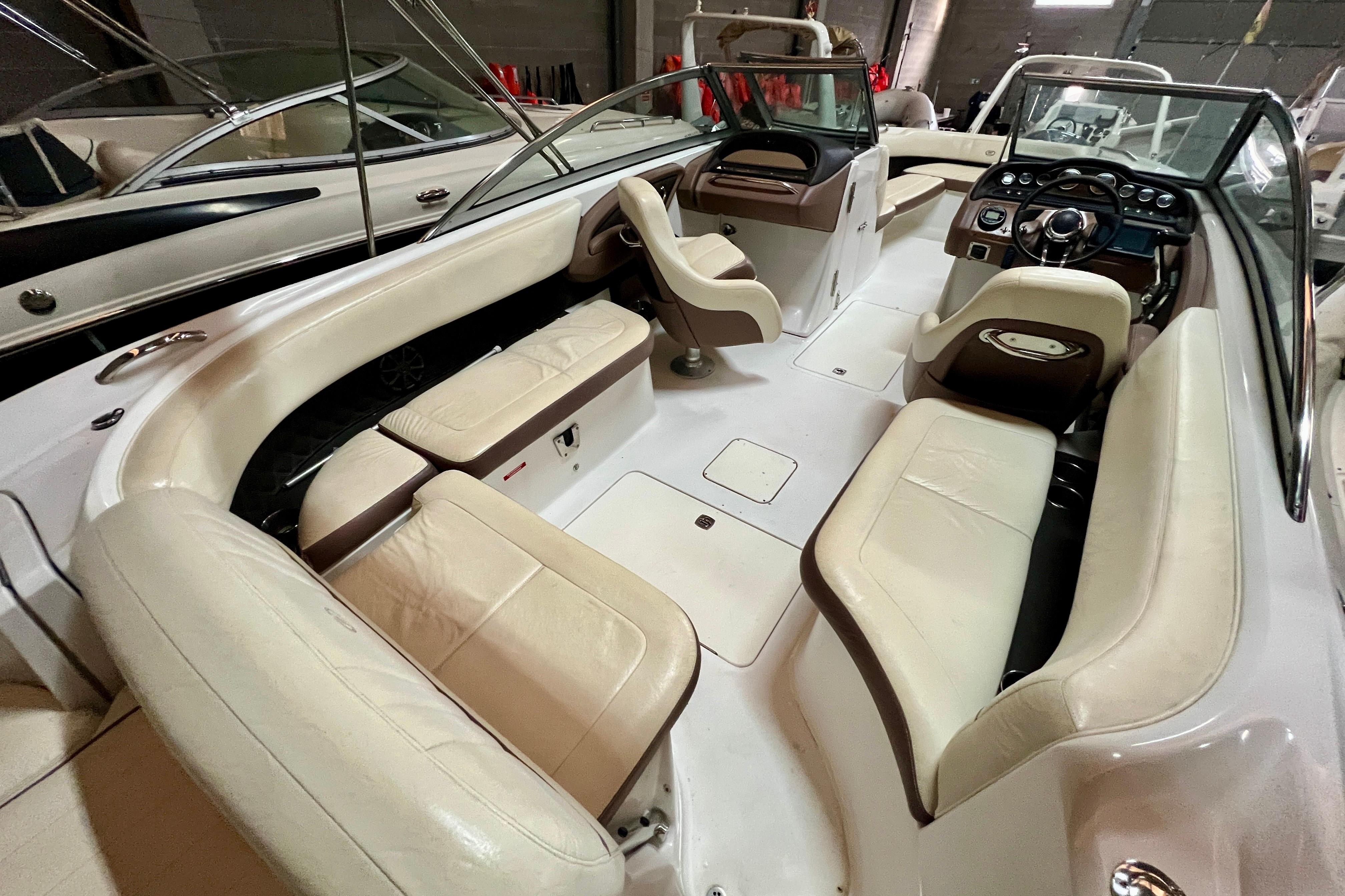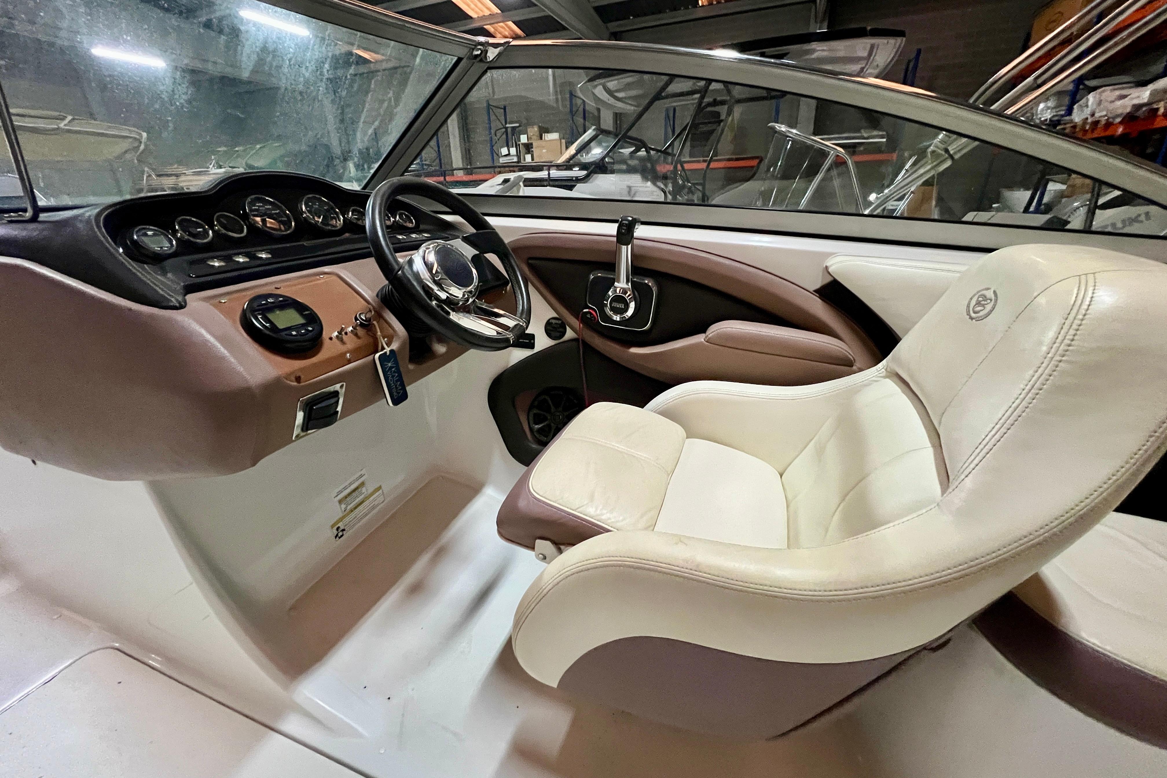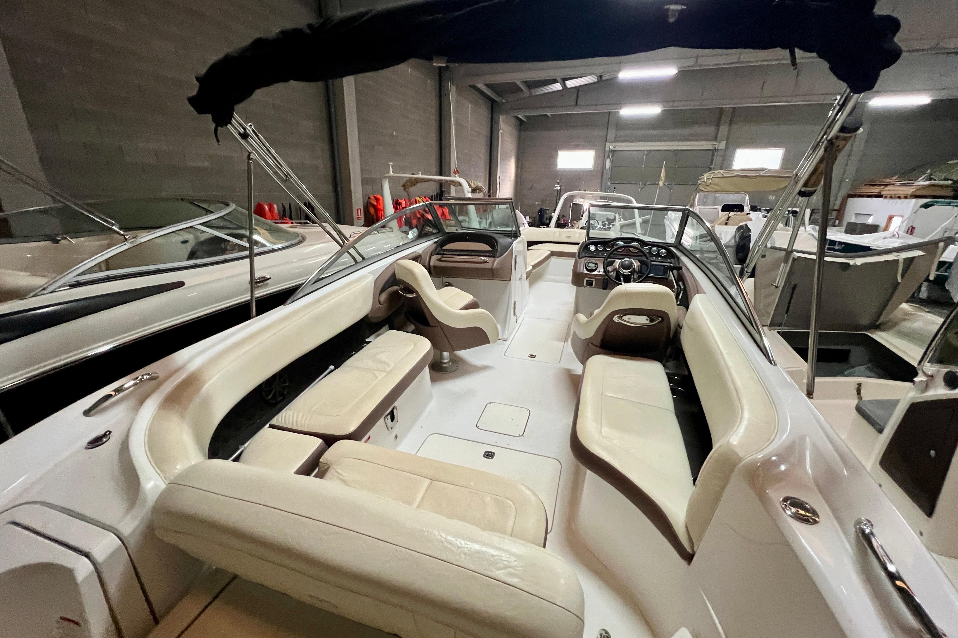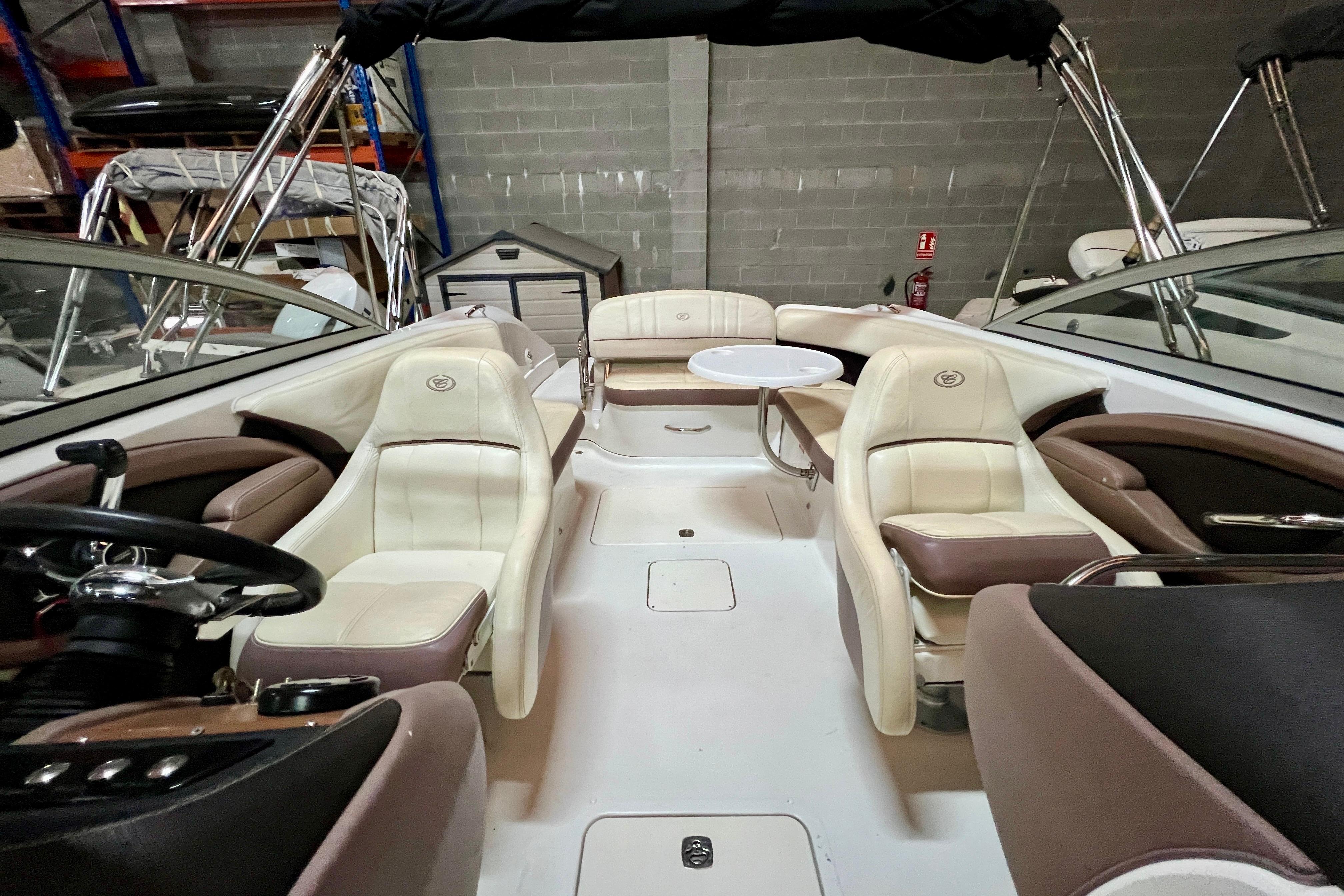 Su diseño interior destaca por un cockpit amplio, con asientos envolventes de gran calidad, zonas de estiba bien distribuidas y detalles pensados para el confort de los pasajeros. En proa encontramos una zona tipo bowrider muy versátil, perfecta tanto para relajarse como para disfrutar de la navegación en grupo. La plataforma de baño, amplia y cercana al agua, facilita el acceso para actividades acuáticas.