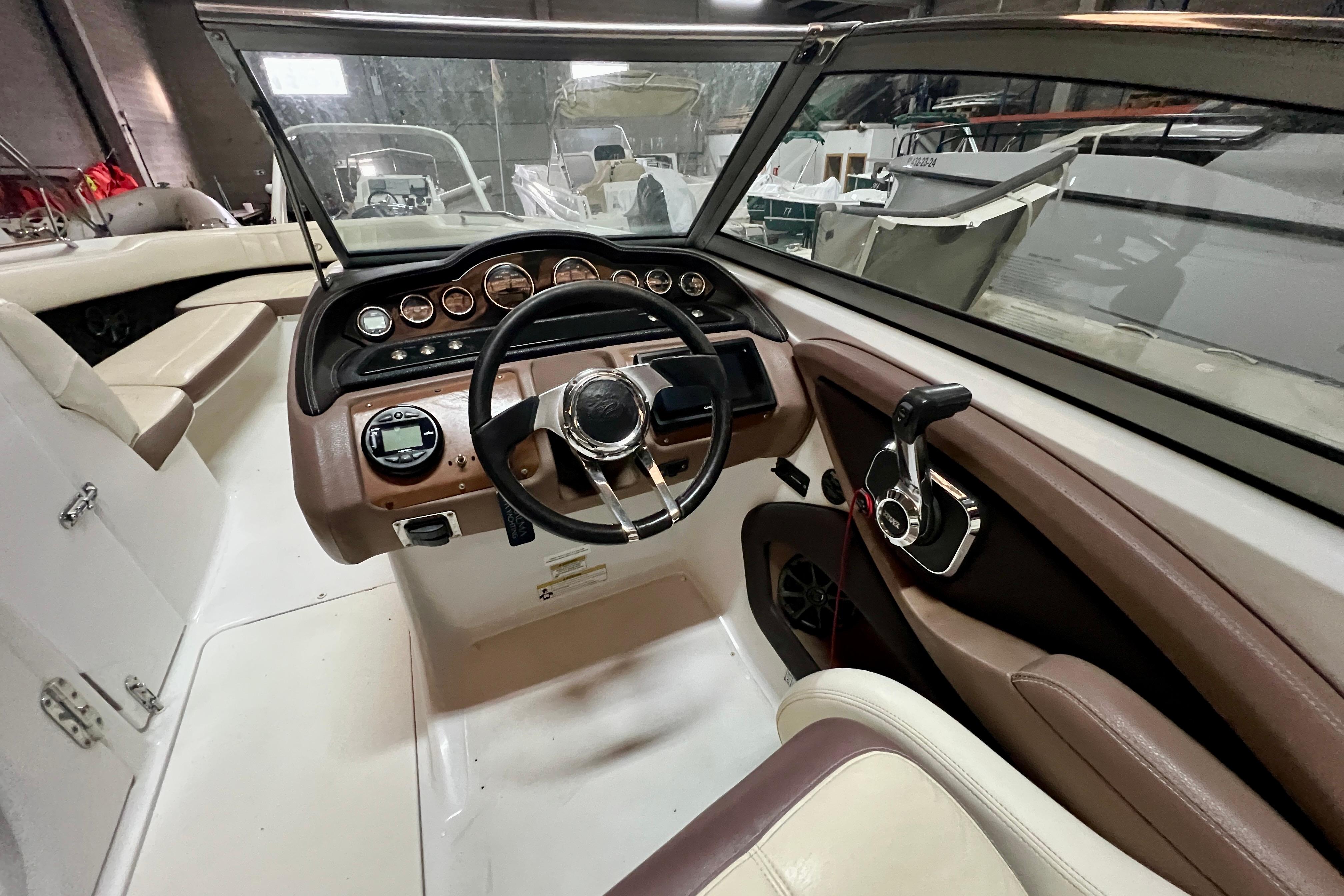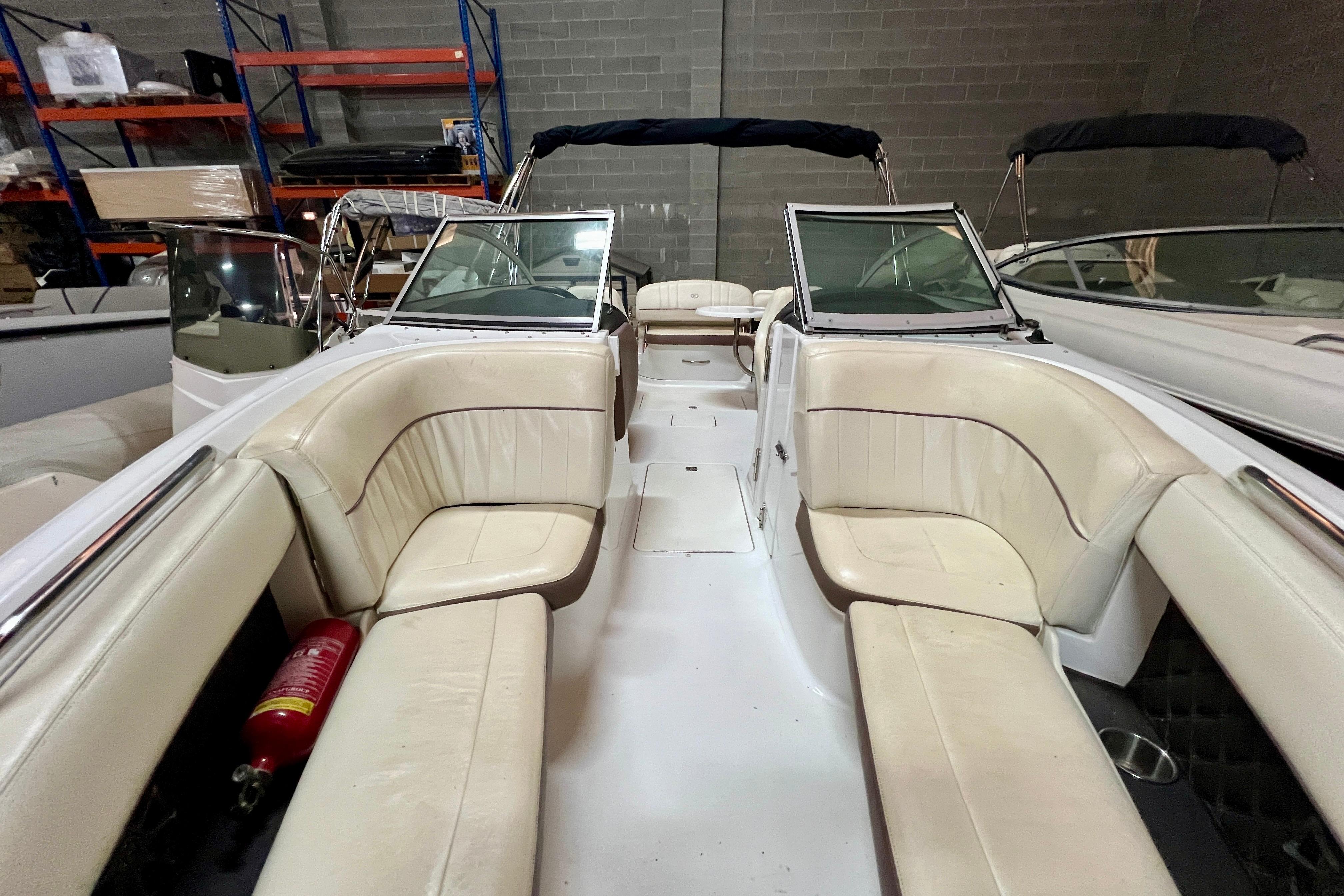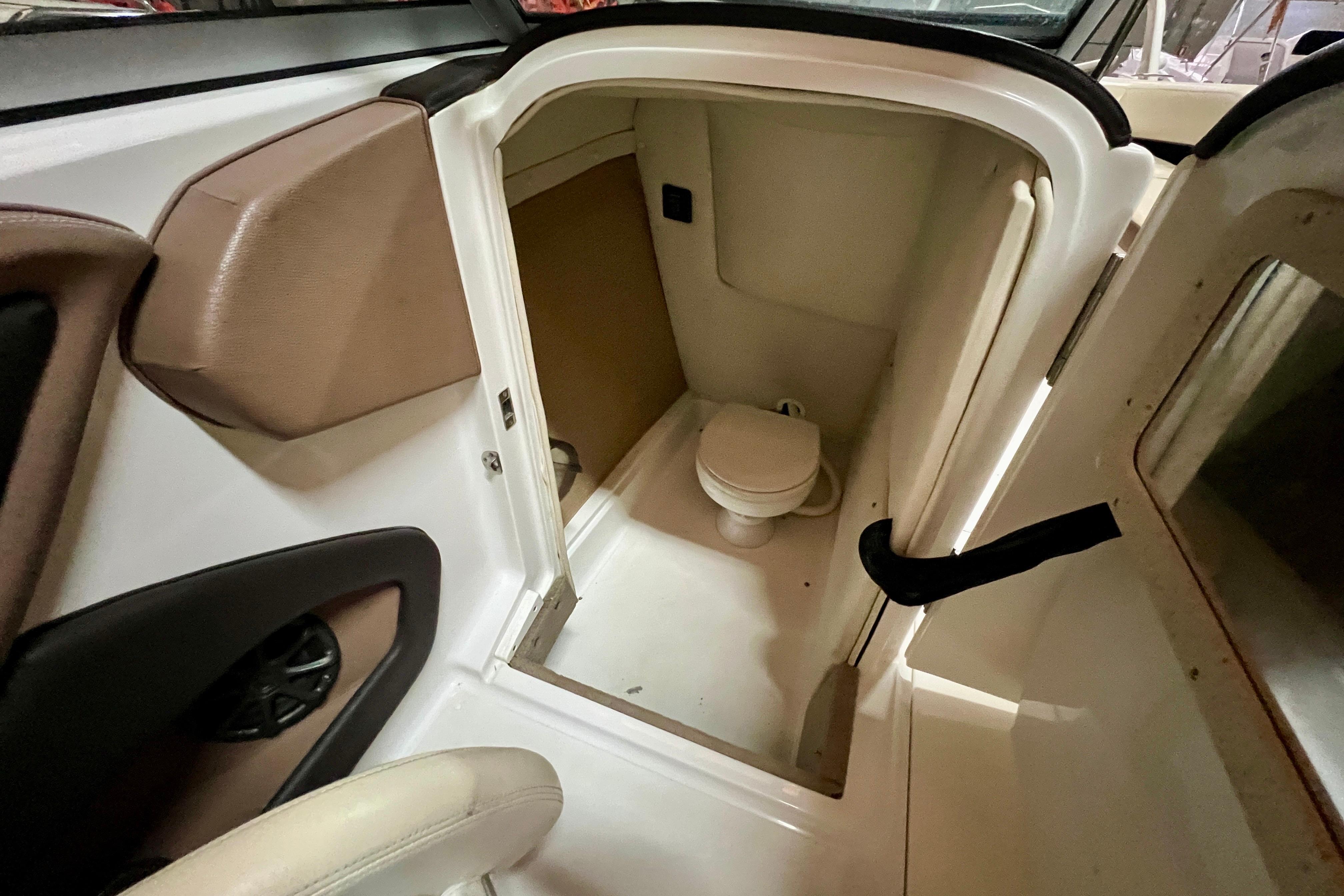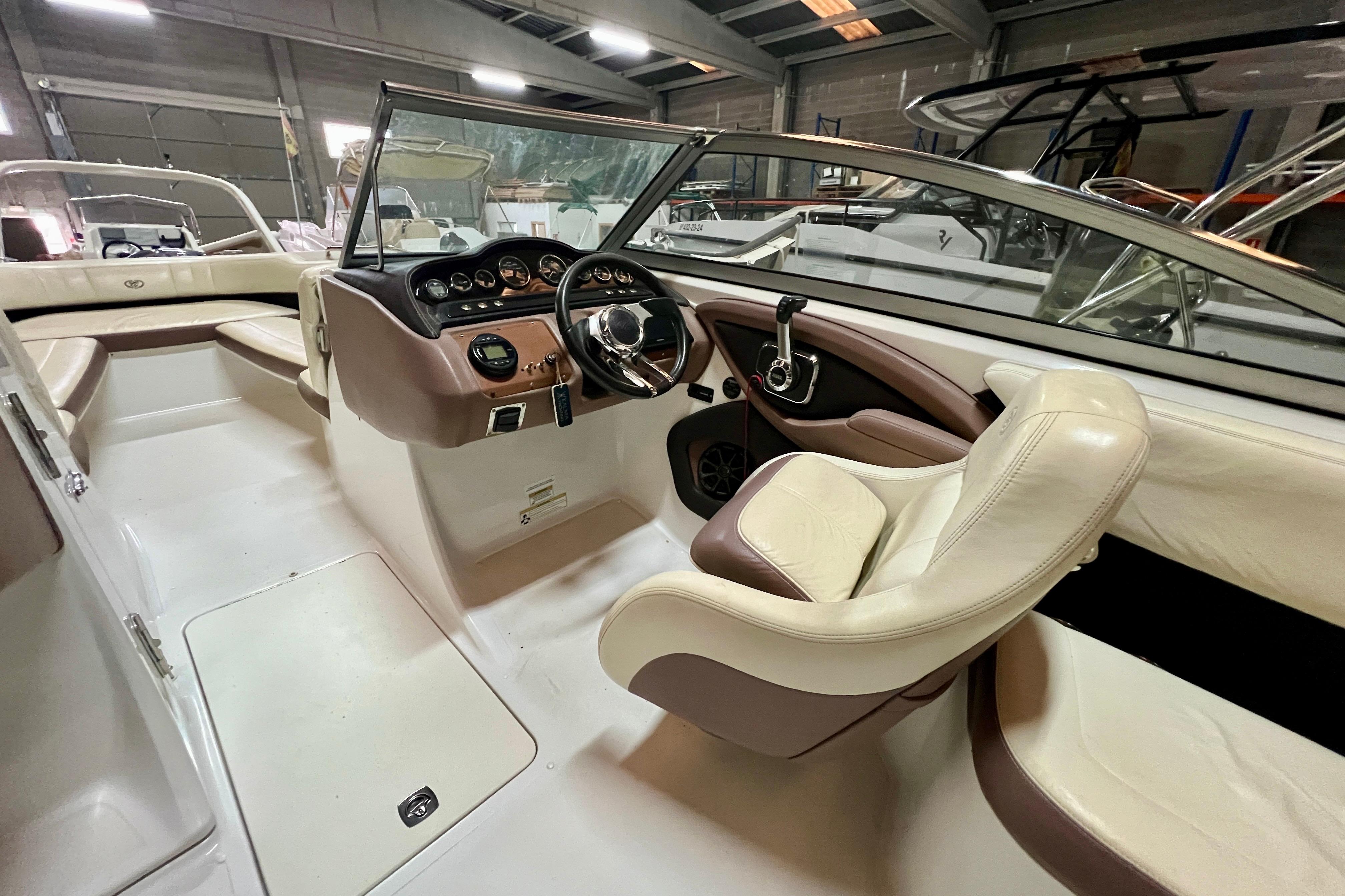 Su diseño interior destaca por un cockpit amplio, con asientos envolventes de gran calidad, zonas de estiba bien distribuidas y detalles pensados para el confort de los pasajeros. En proa encontramos una zona tipo bowrider muy versátil, perfecta tanto para relajarse como para disfrutar de la navegación en grupo. La plataforma de baño, amplia y cercana al agua, facilita el acceso para actividades acuáticas.