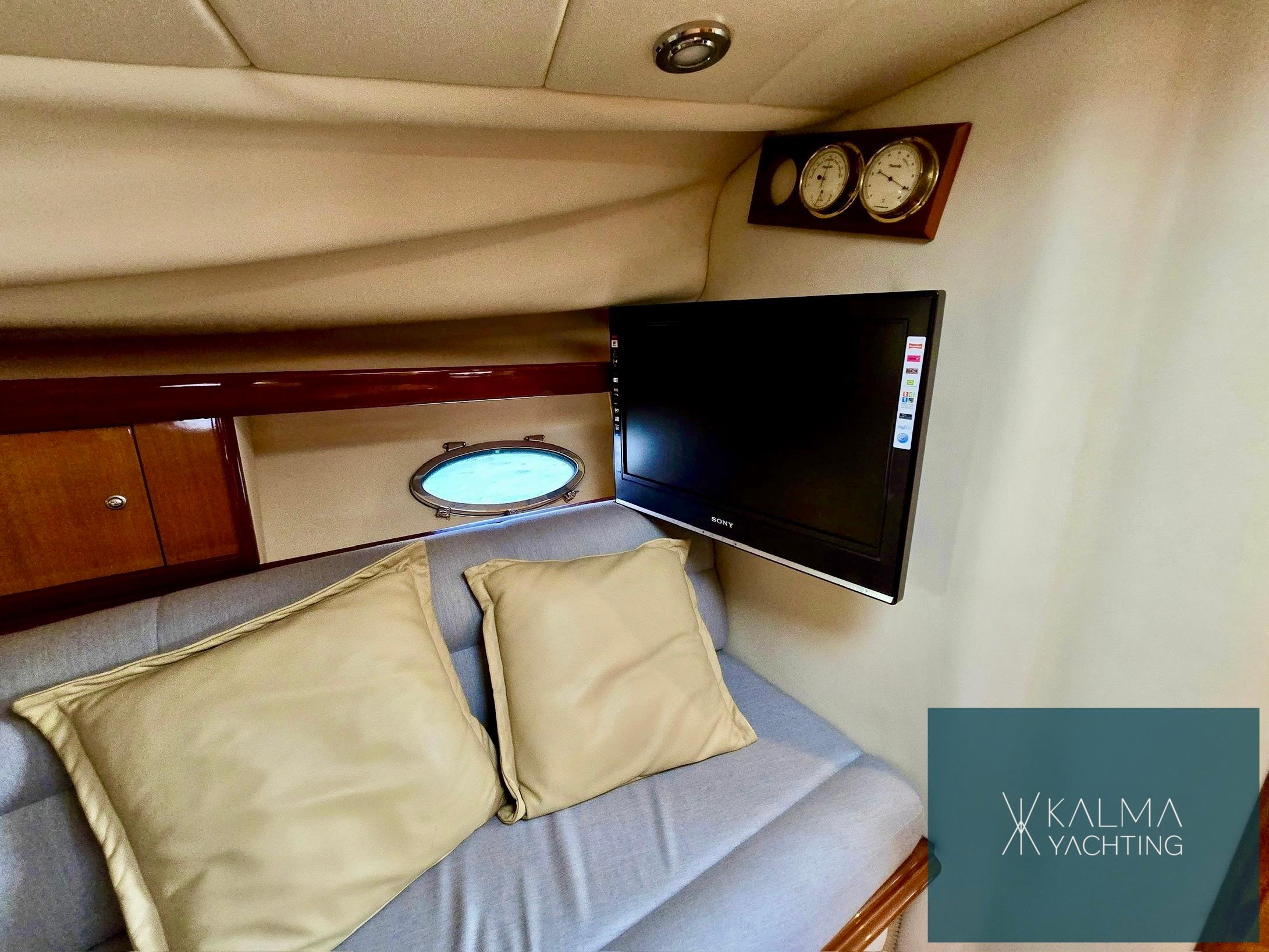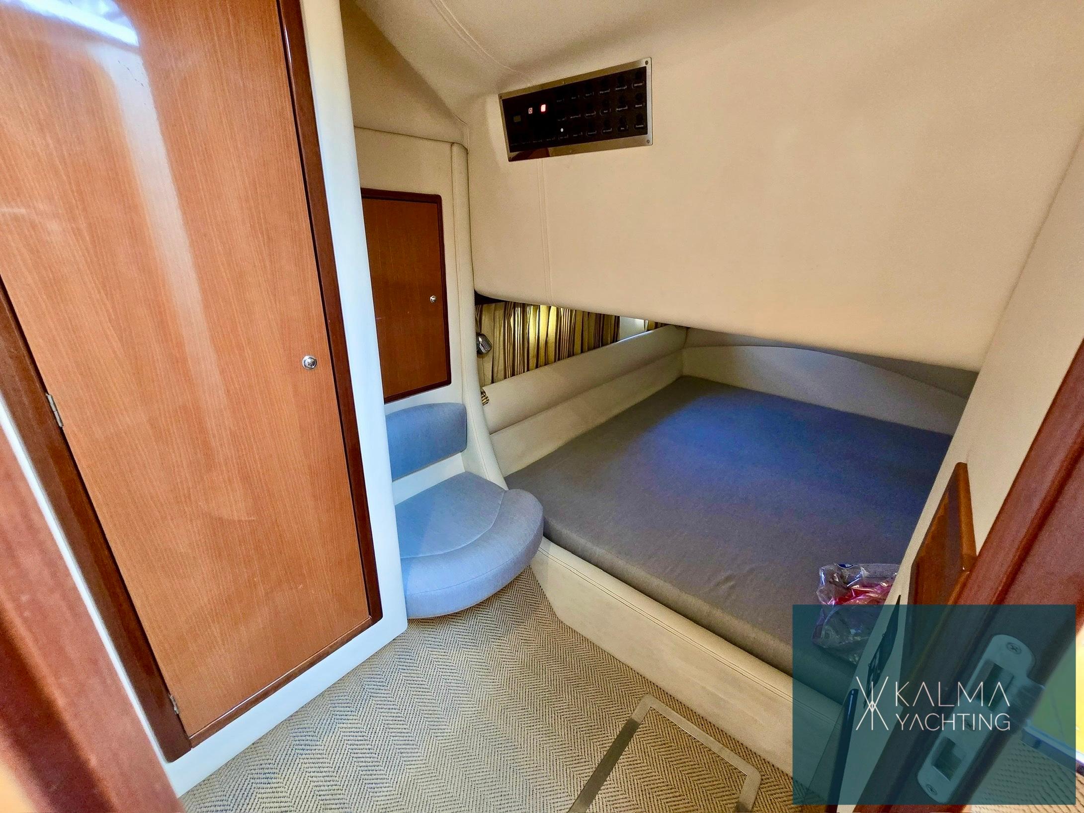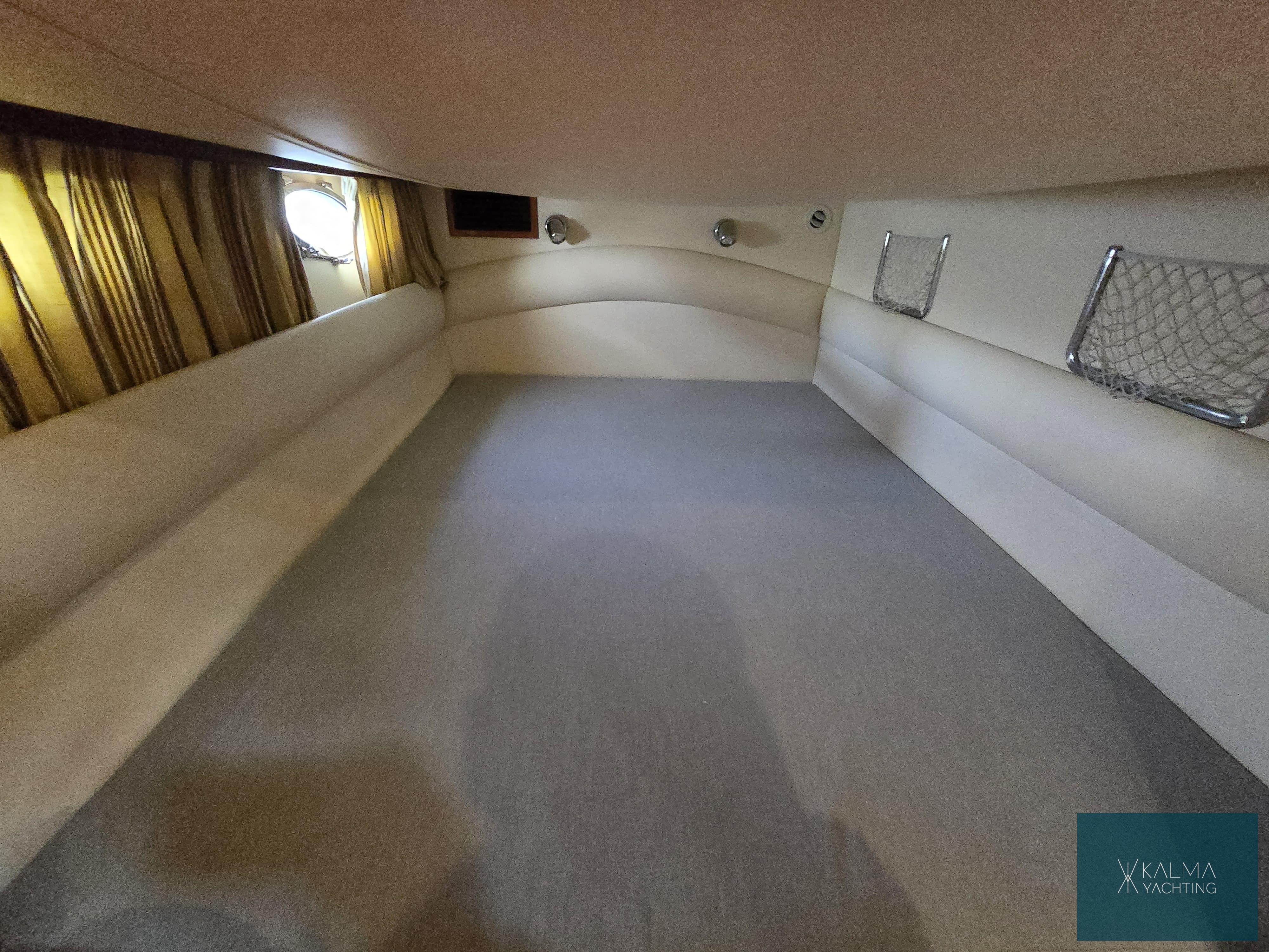 À l'intérieur, le bateau offre un espace luxueux et bien équipé comprenant un salon élégant, une cuisine entièrement fonctionnelle et deux cabines bien conçues, offrant un hébergement confortable pour les passagers lors de longs voyages en mer.