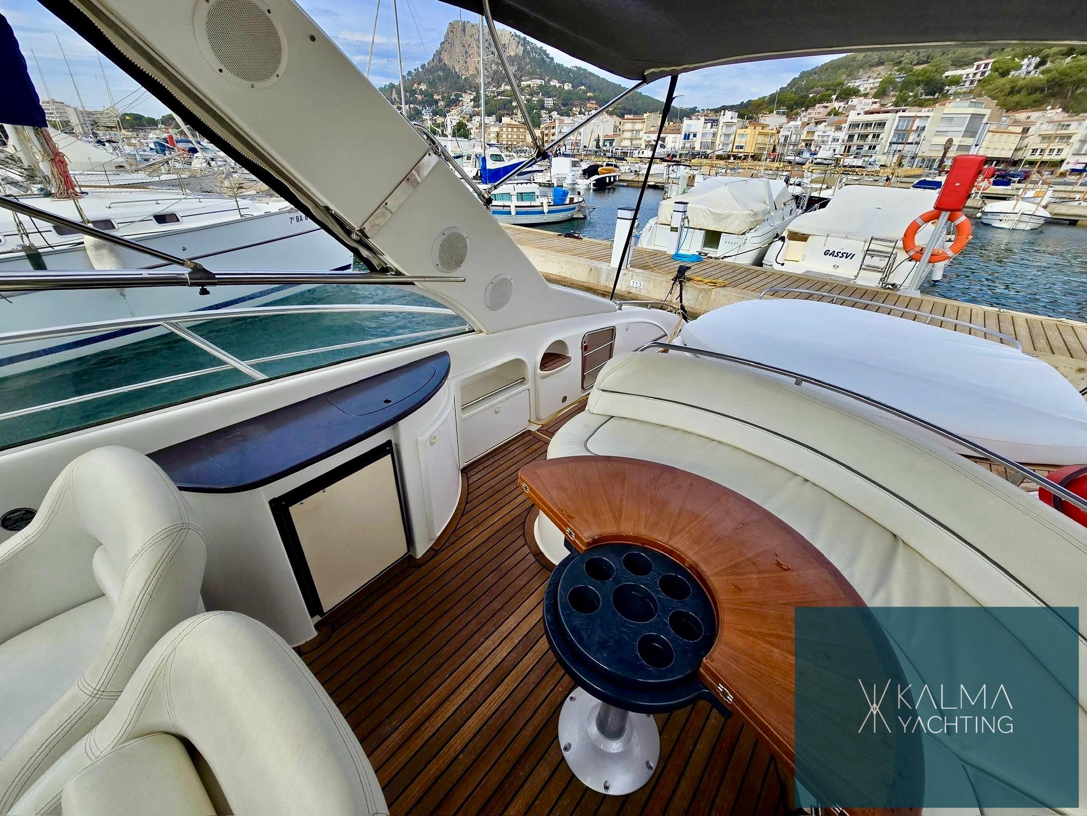 En términos de comodidades, el Gran Bora 42 cuenta con una amplia plataforma de baño para facilitar el acceso al agua, un toldo retráctil que proporciona sombra en cubierta, y generosas áreas de solárium tanto en la proa como en la popa, ideales para relajarse y disfrutar del sol.
