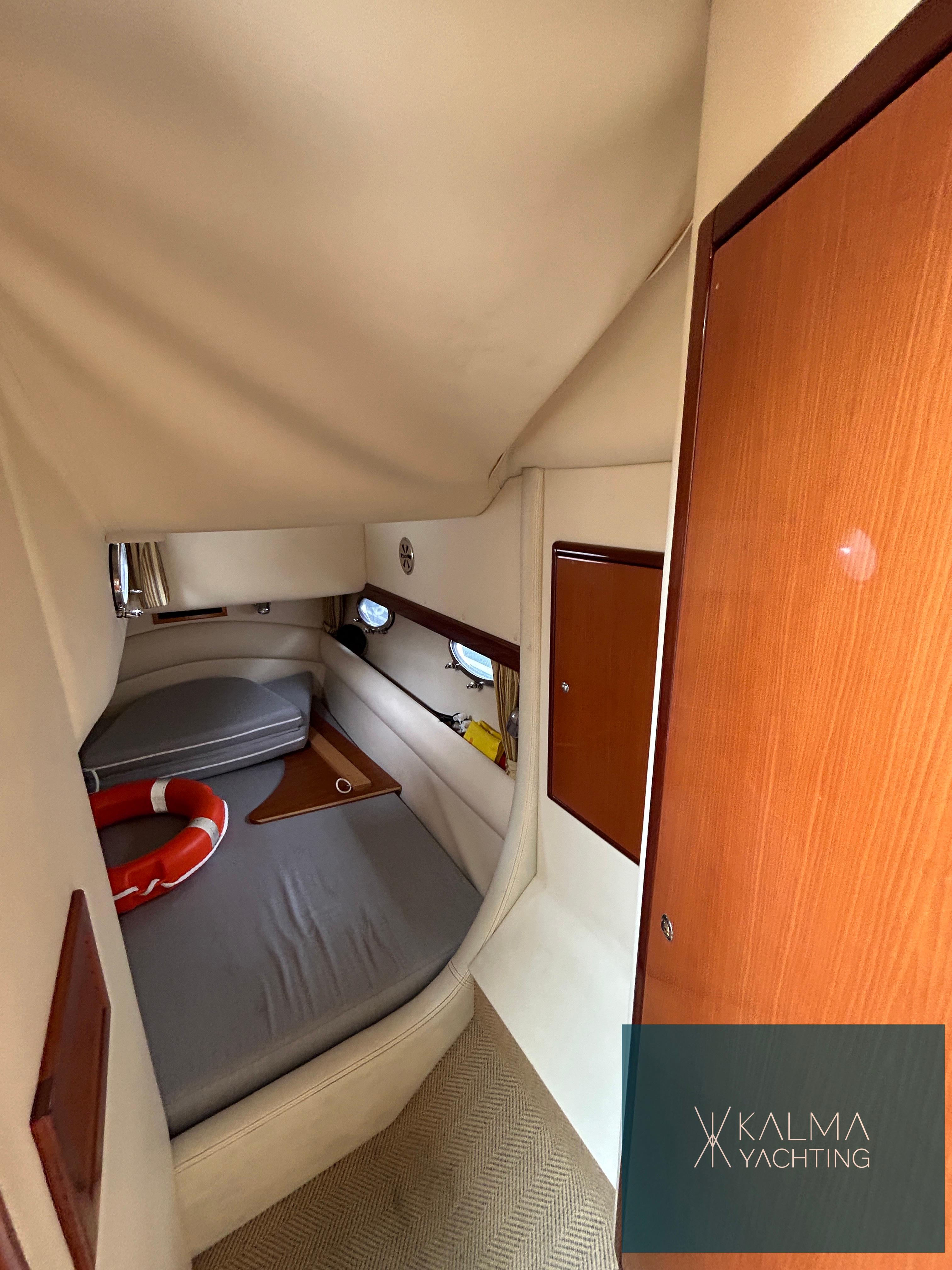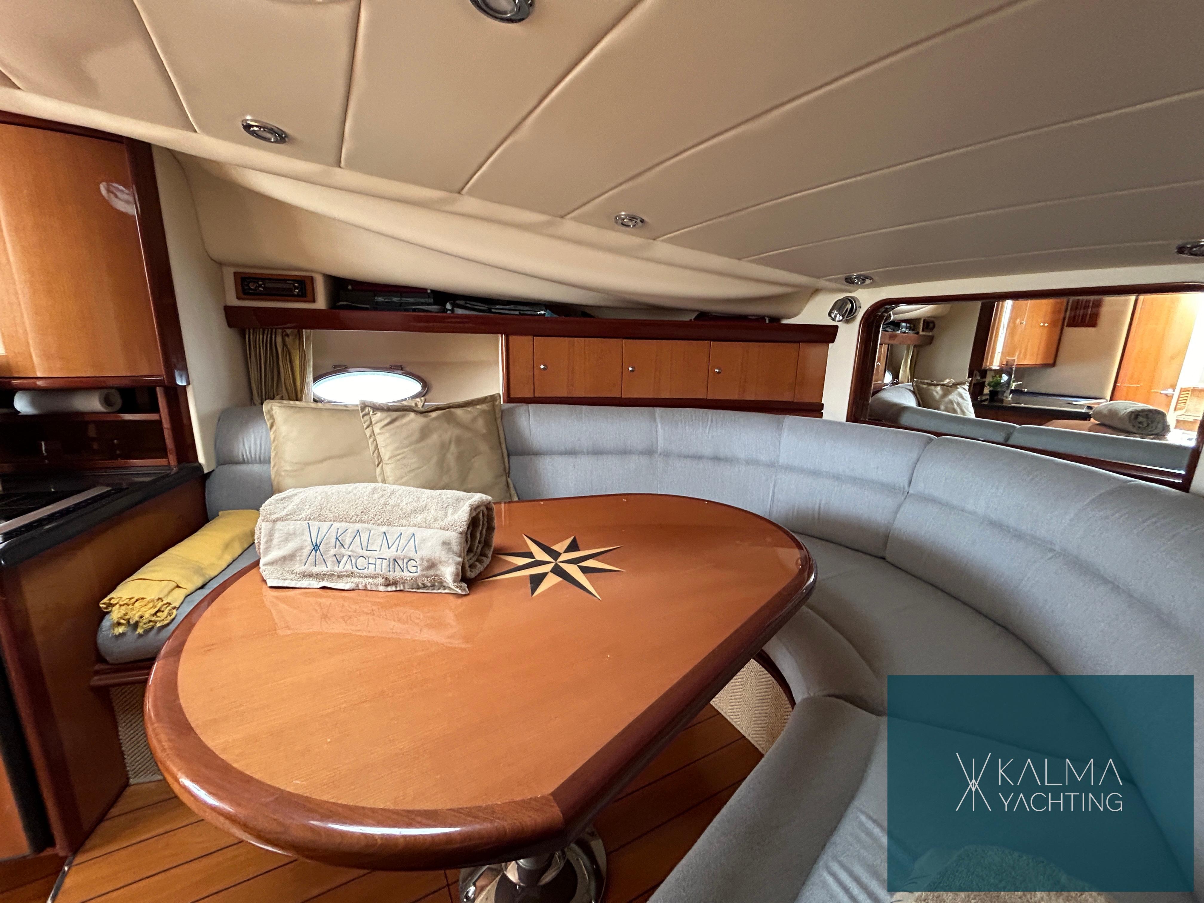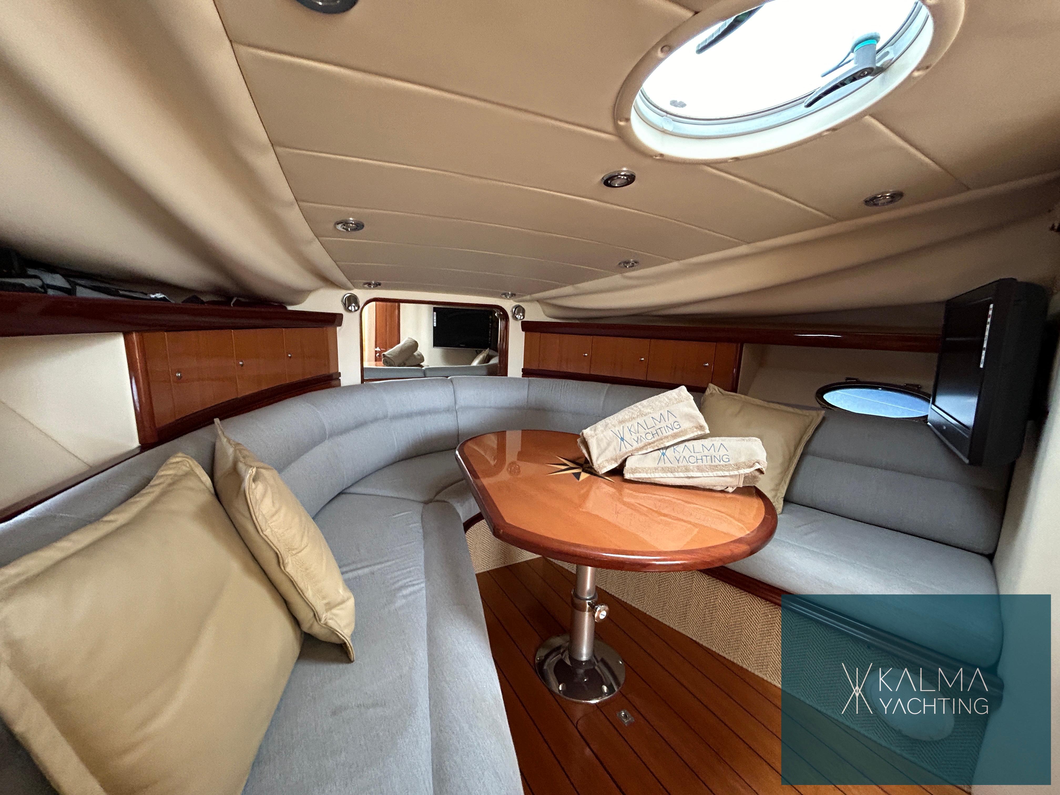En su interior, el barco ofrece un espacio lujoso y bien equipado que incluye un elegante salón, una cocina totalmente funcional y dos camarotes bien diseñados, proporcionando alojamiento cómodo para los pasajeros durante largos viajes en el mar.