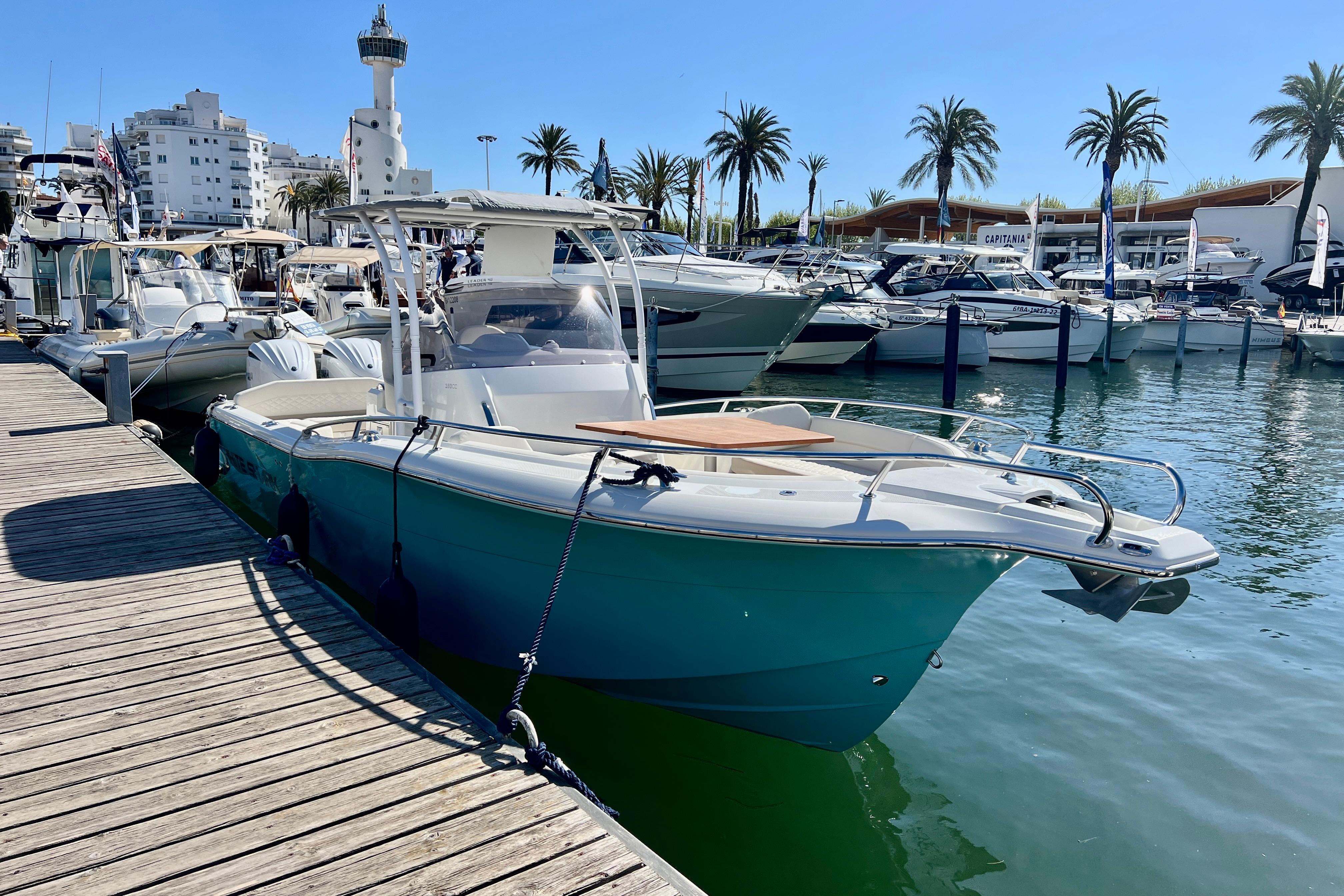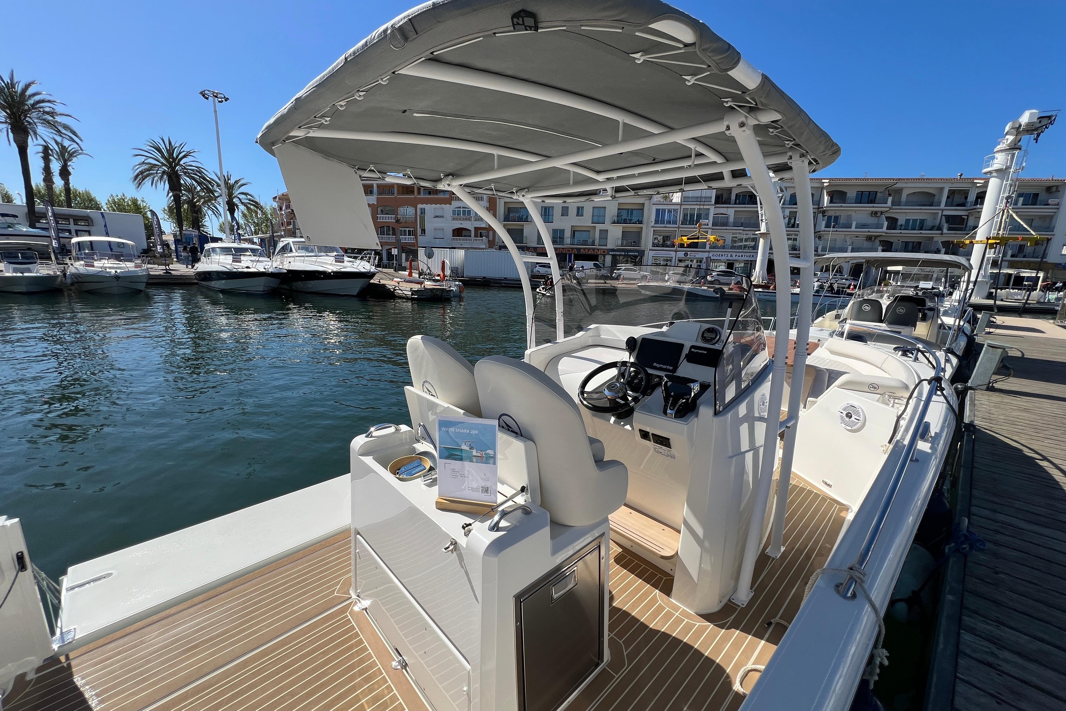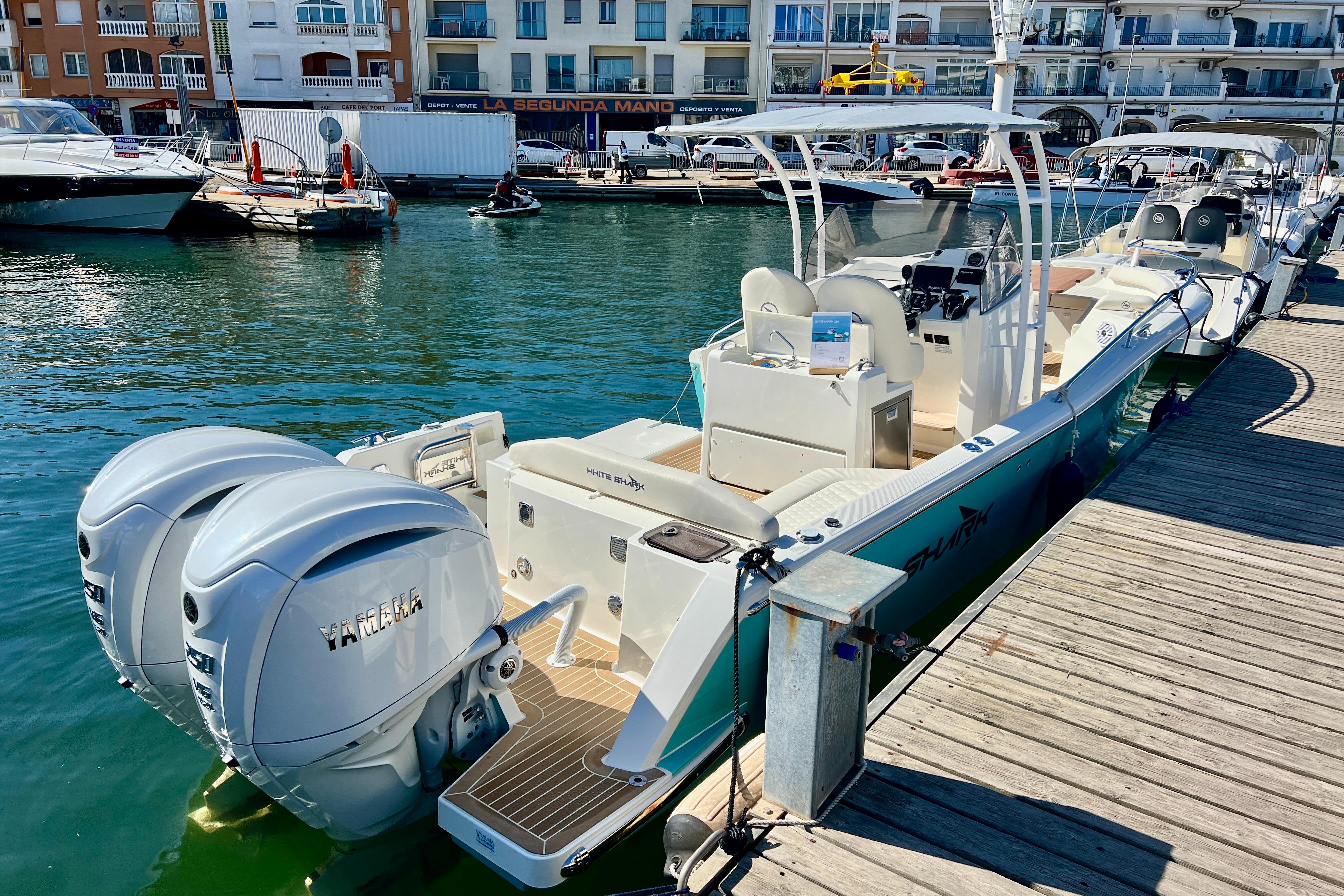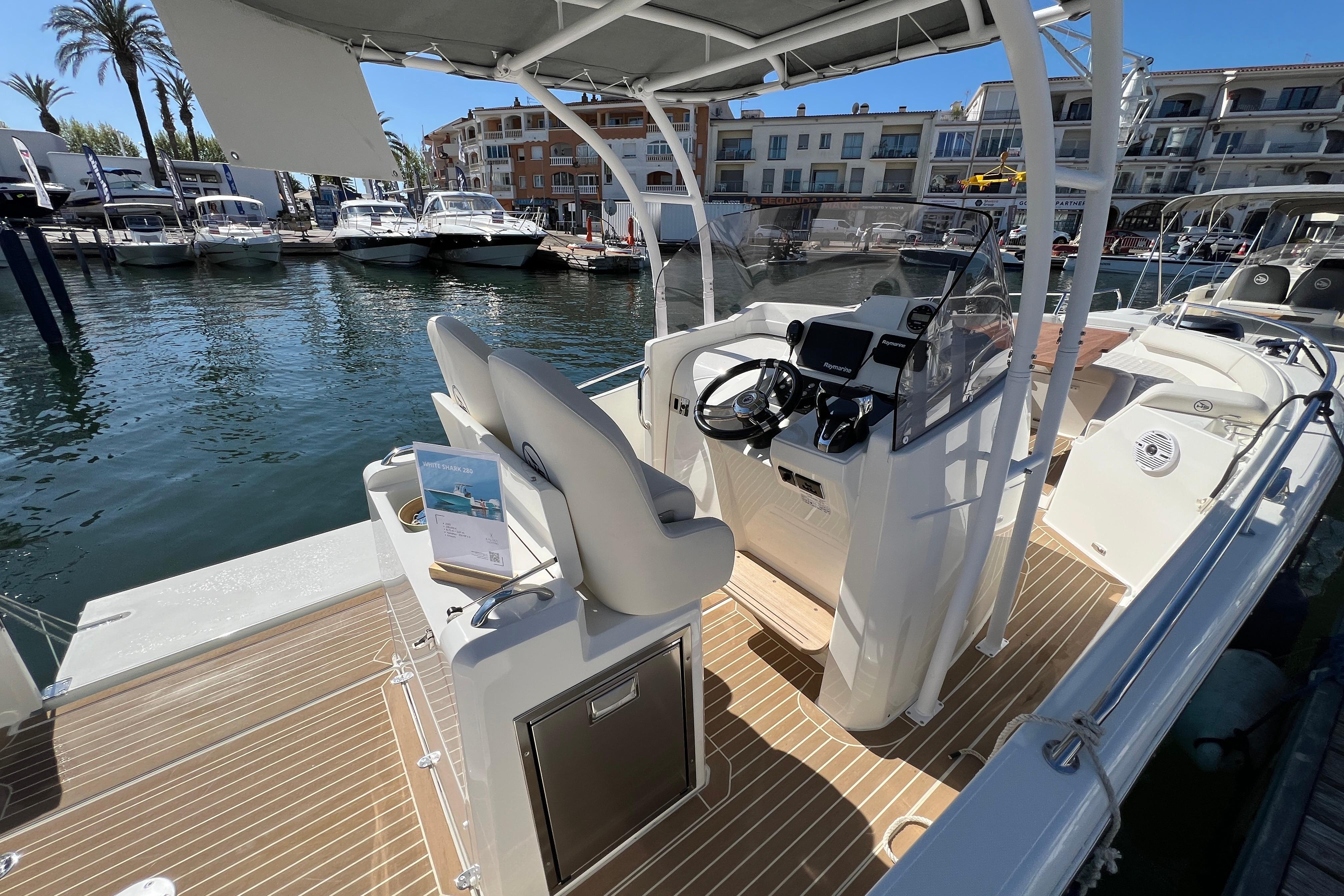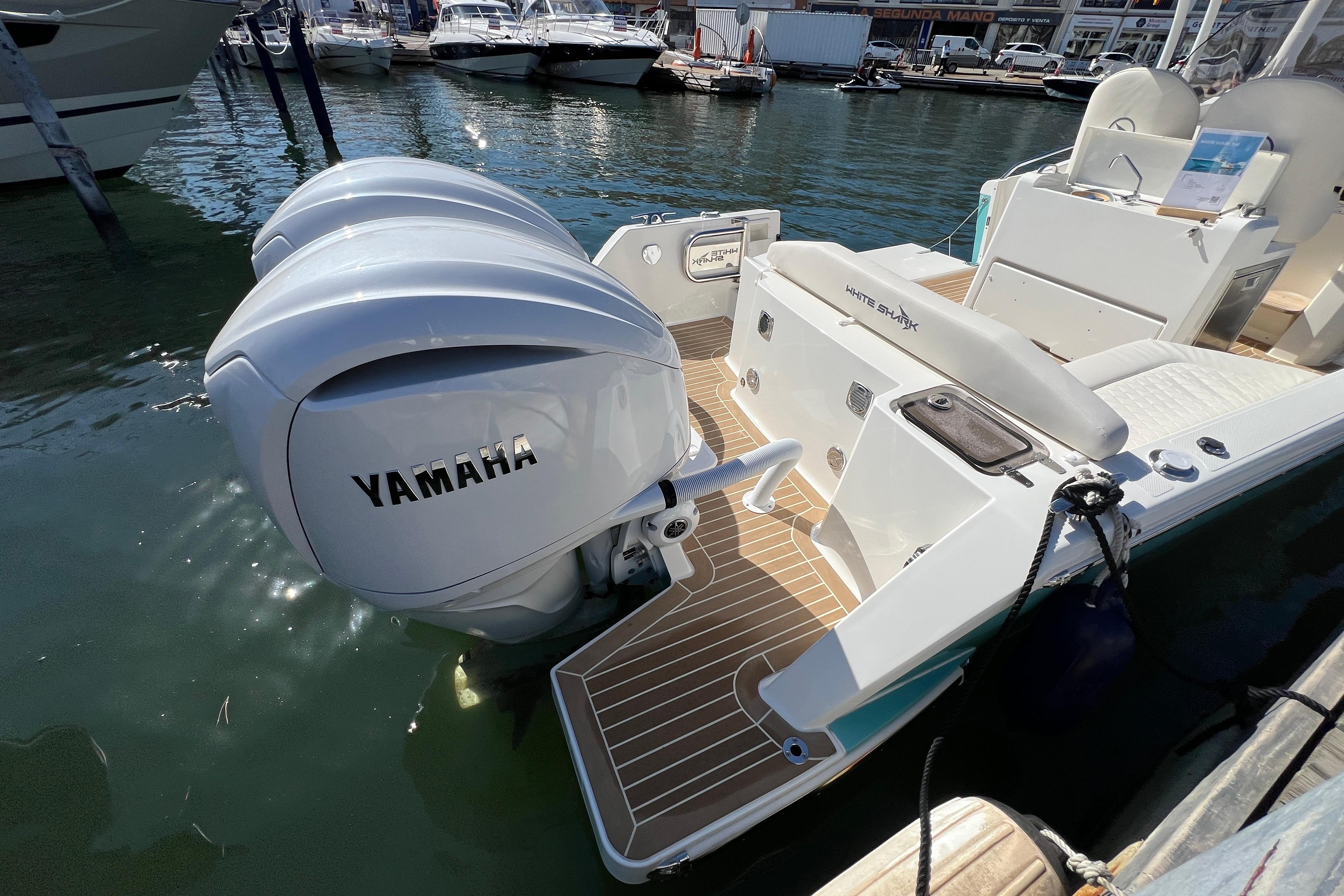 Embarcación del prestigioso astillero WHITE SHARK, modelo 280 Center Console, totalmente nuevo en stock y muy equipada; Dispone de T-Top de aluminio con cubierta de lona, extensión sobre popa con mástiles, mesa de bañera y mesa de proa convertible en solarium, balcon lateral a nivel de agua en bañera, plataformas de baño muy cómodas, todo el barco cubierto con teka sintética, acabados de calidad, electrónica completa Raymarine (GPS con Sonda, radio VHF,..), radio musica bluethoot con altavoces en proa y bañera, ordenador digital táctil Yamaha...