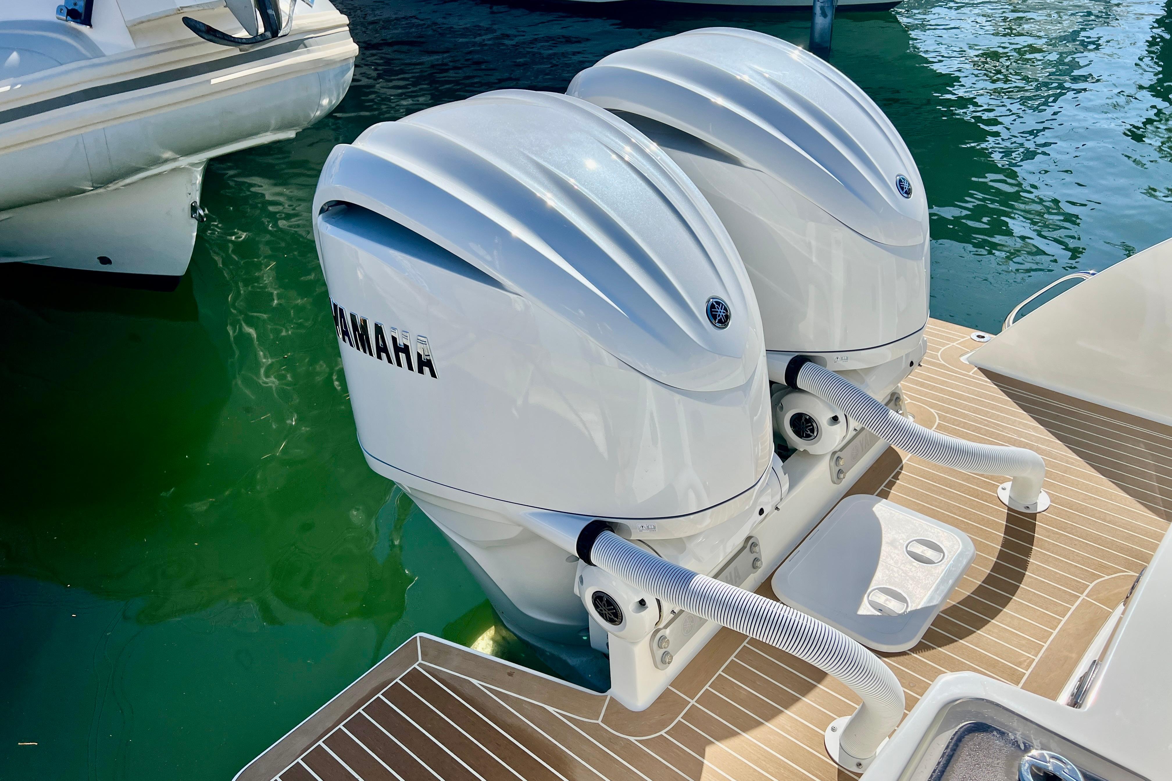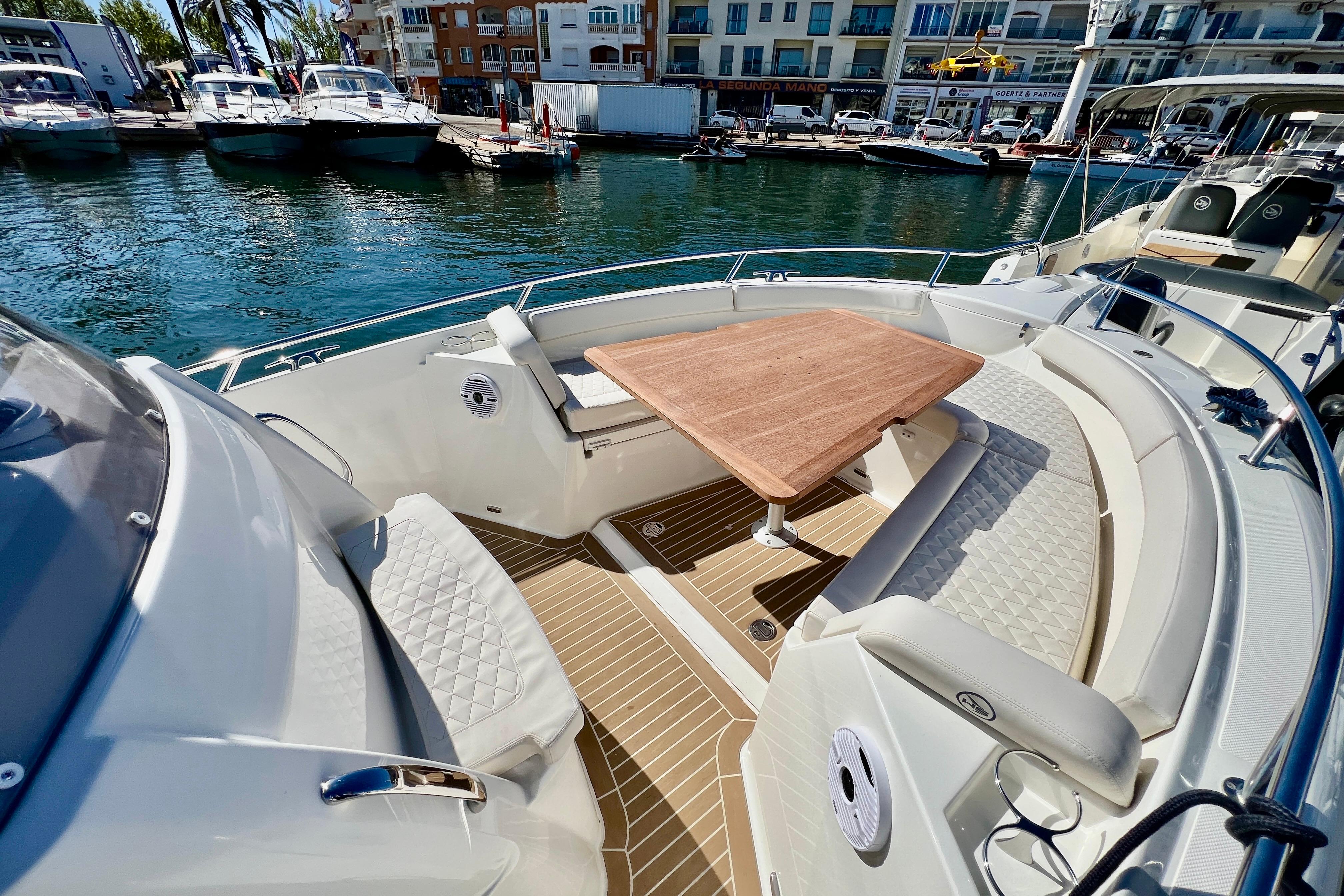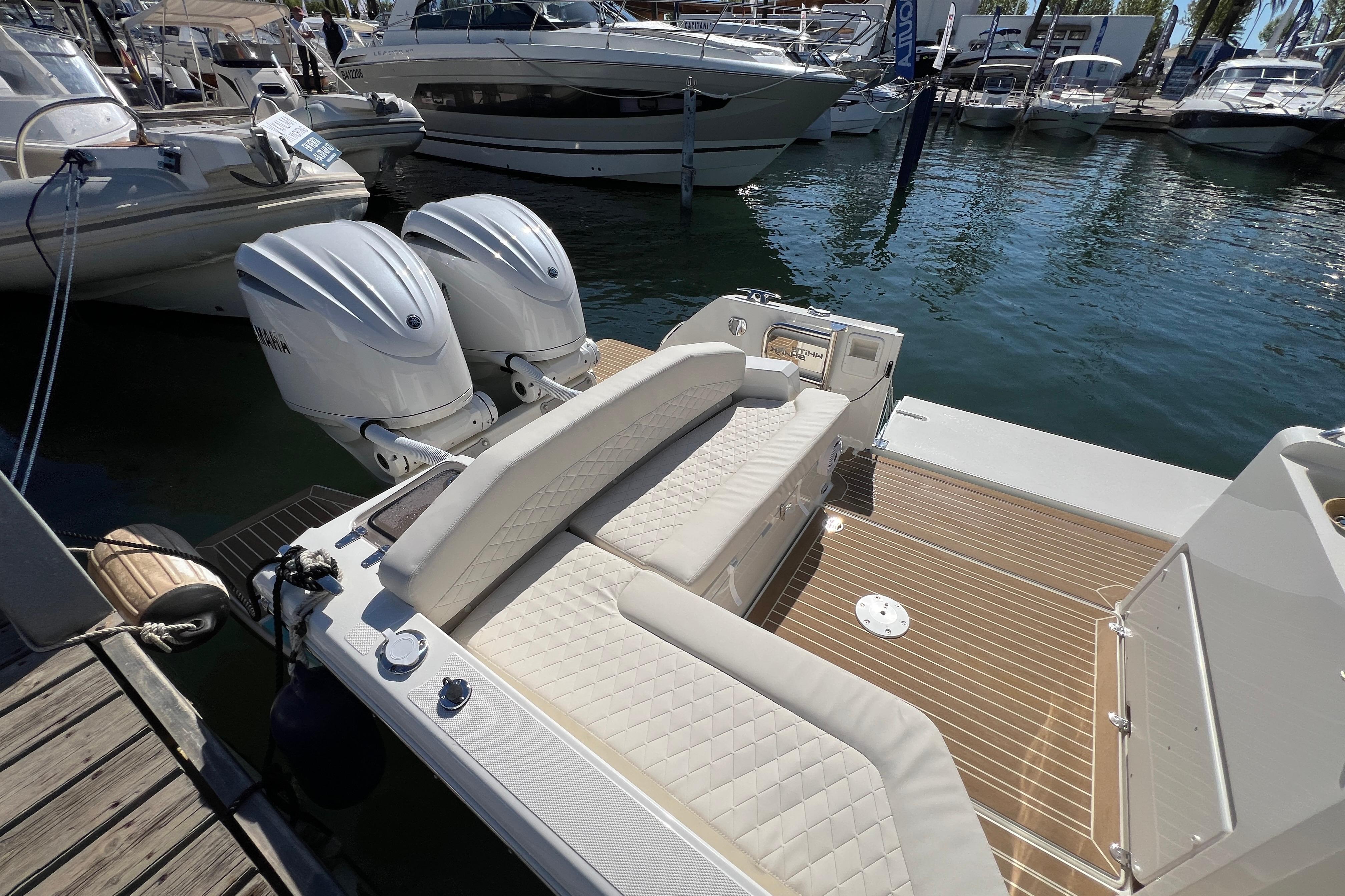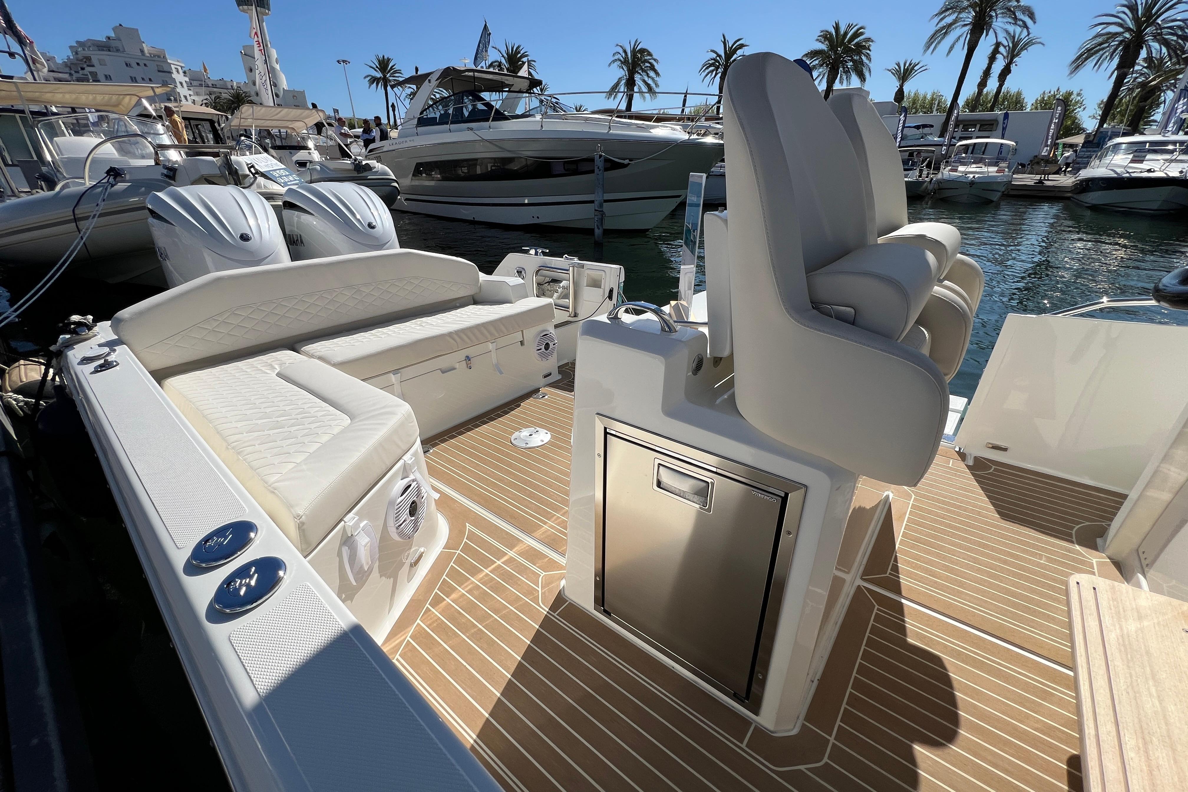 Equipada con dos motores Yamaha de 250 CV con mandos electrónicos y dirección electrónica con arranque por botón, garantiza una navegación potente, eficiente y segura, incluso en condiciones exigentes. Su casco en V profunda proporciona estabilidad y un excelente comportamiento en el mar. Capaz de alcanzar los 52 nudos, y una aceleración 0-20 nudos en tan solamente 3 segundos.