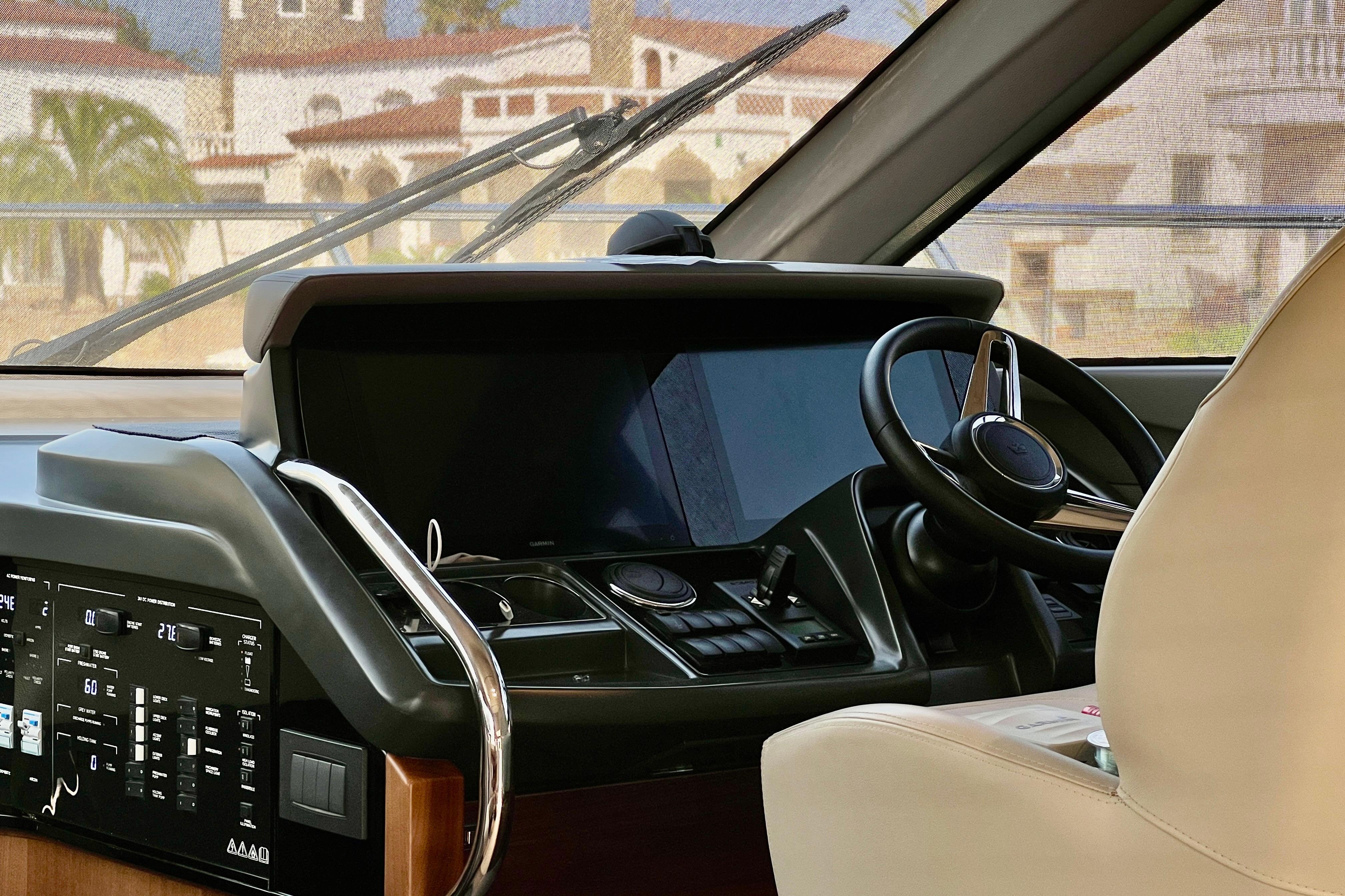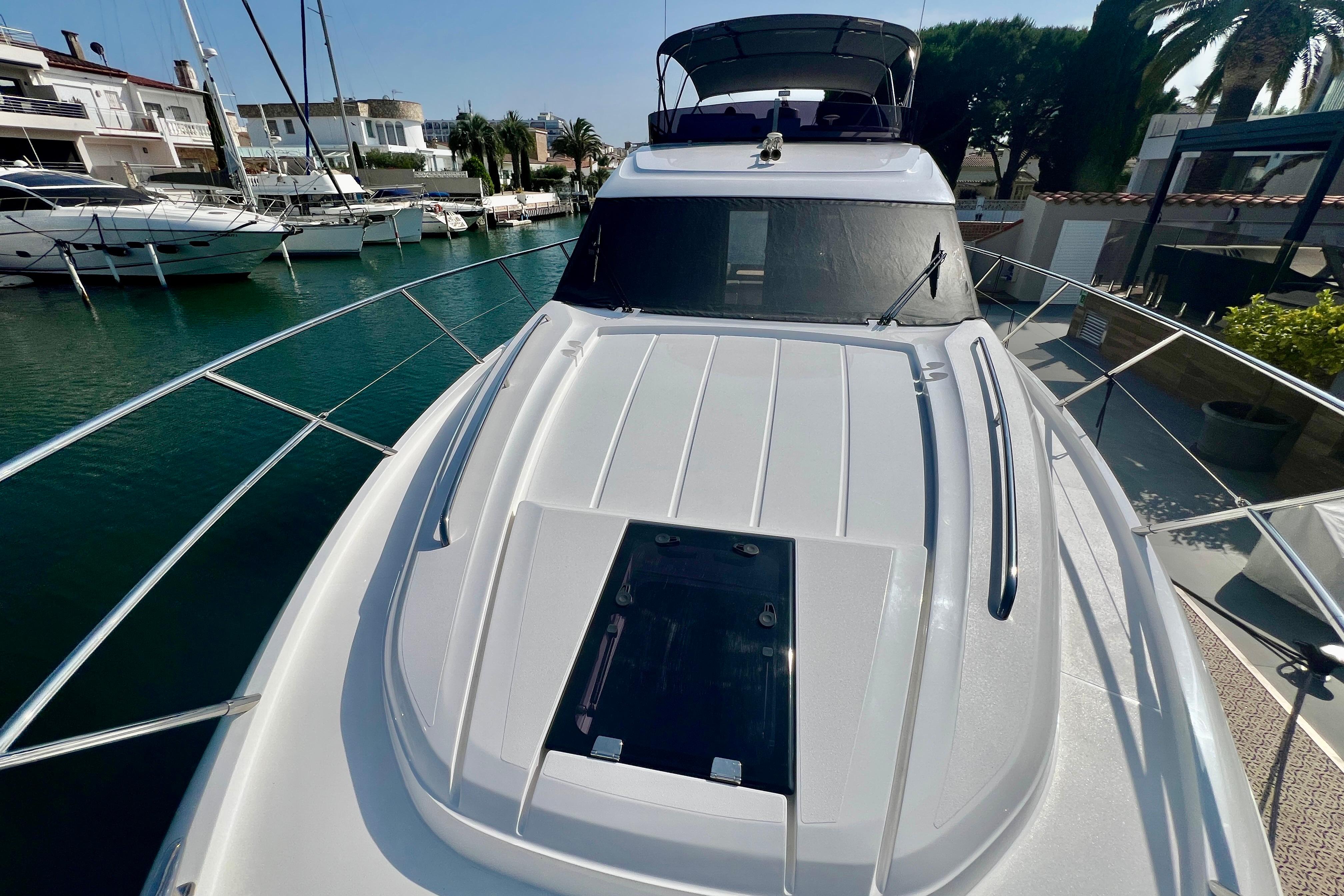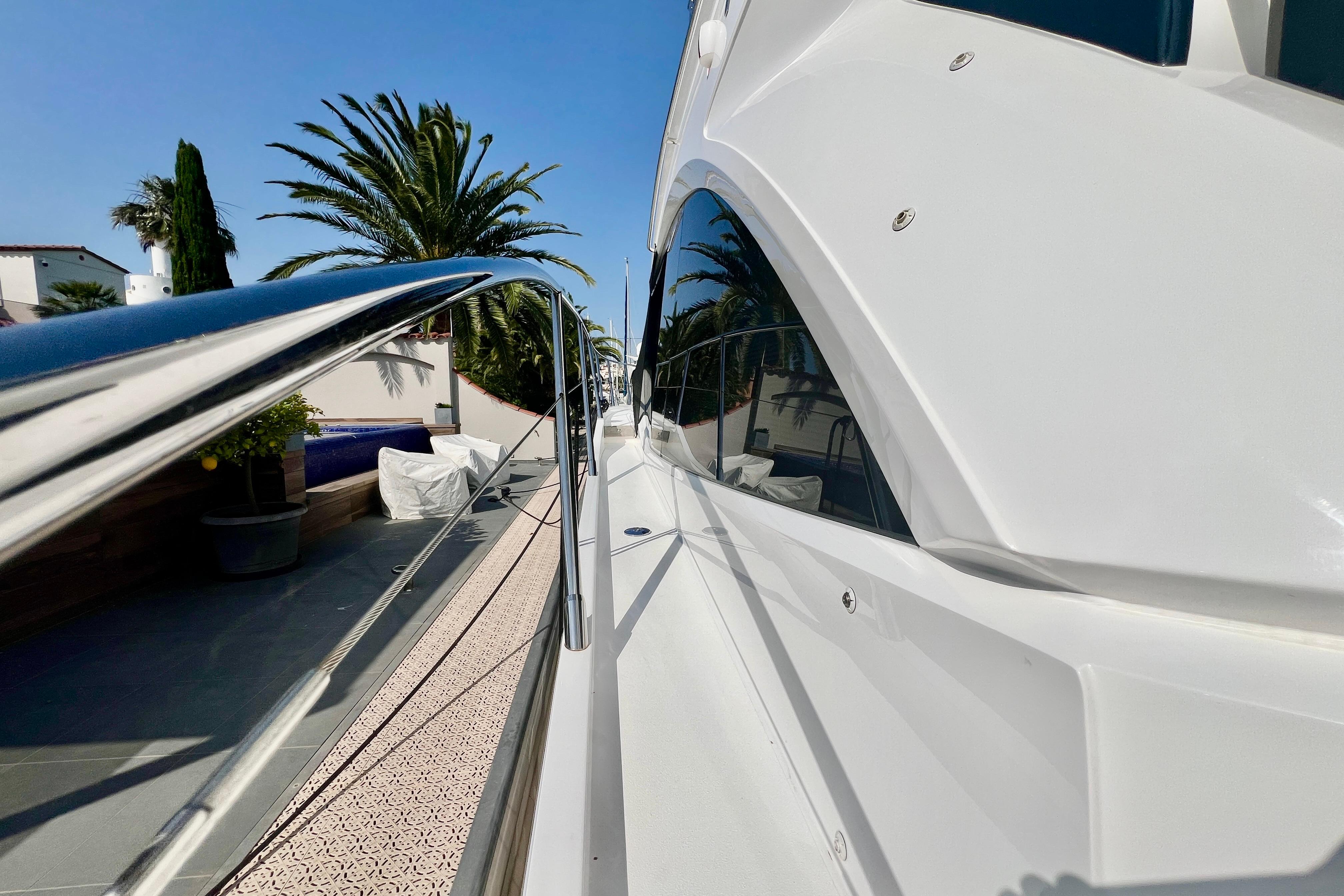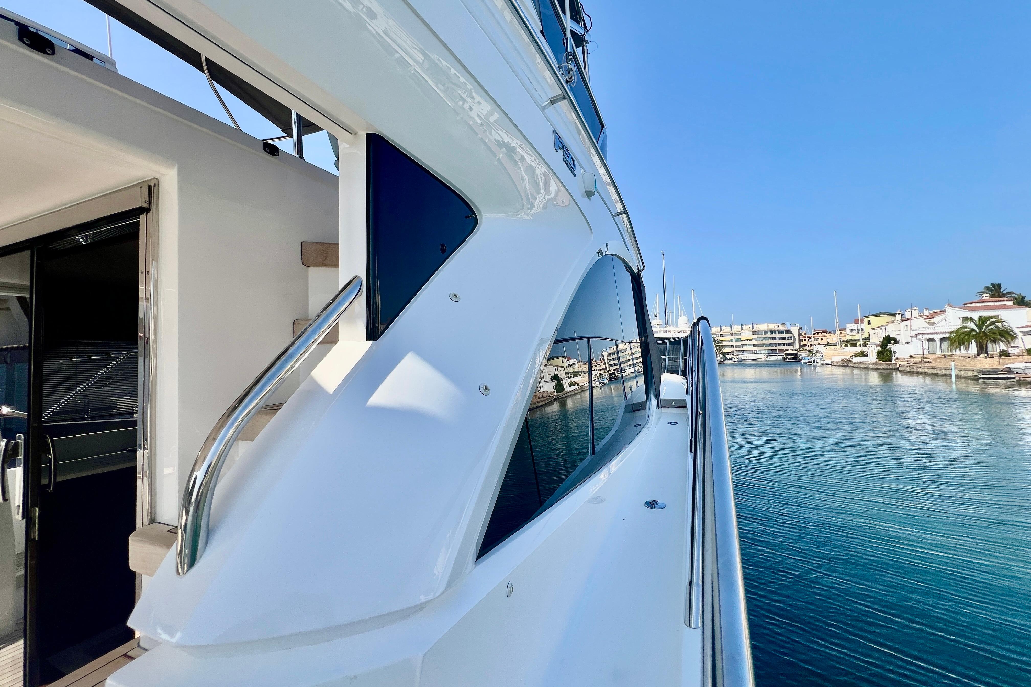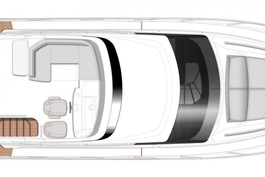 Su diseño exterior destaca por líneas elegantes y modernas, con grandes ventanales laterales que inundan de luz natural el interior. El amplio flybridge, uno de los mayores en su categoría, ofrece una zona de gobierno secundaria con asientos para el piloto y copiloto, un espacioso solárium, dinette, y una zona de bar opcional, lo que lo convierte en el lugar perfecto para socializar y relajarse al aire libre.