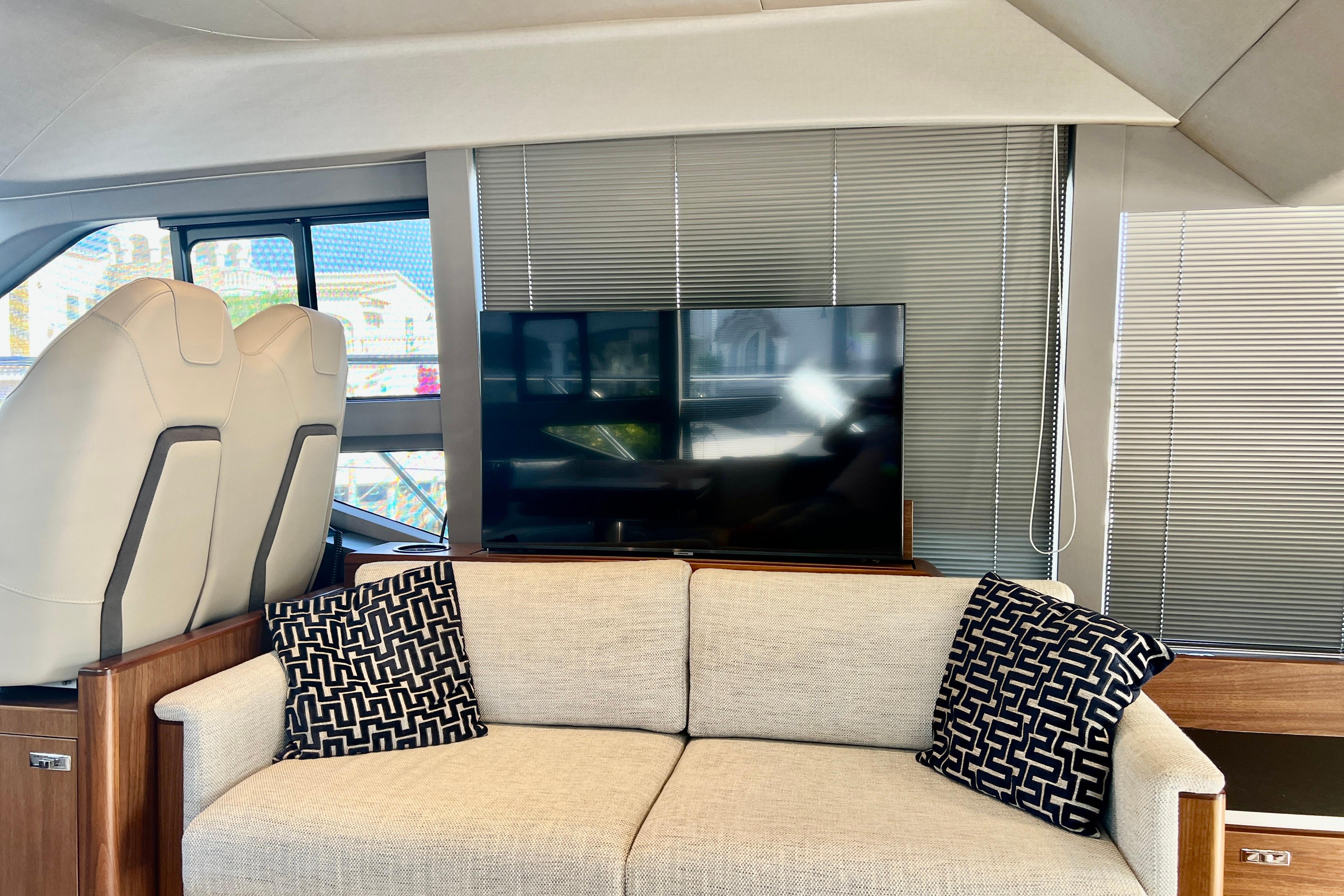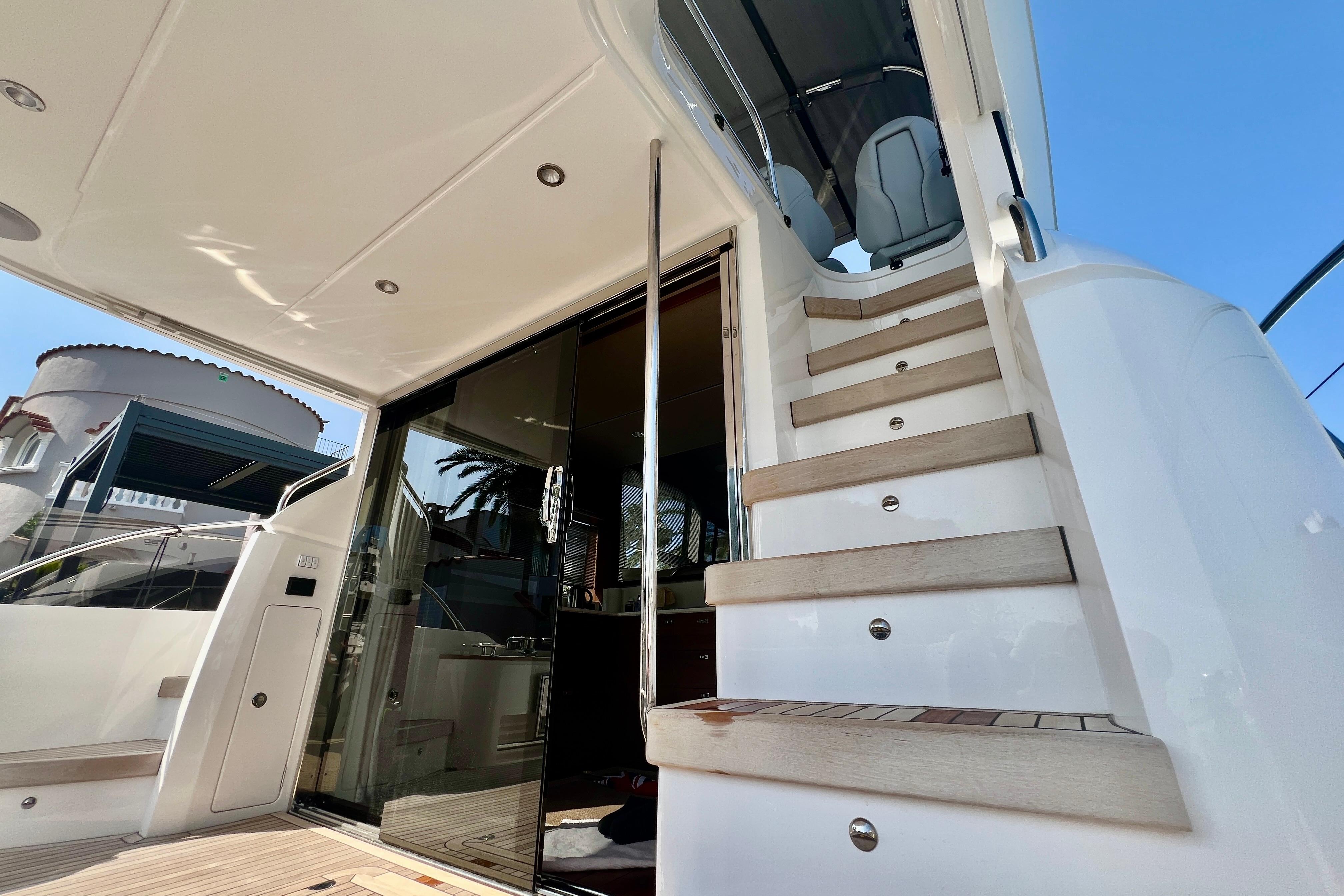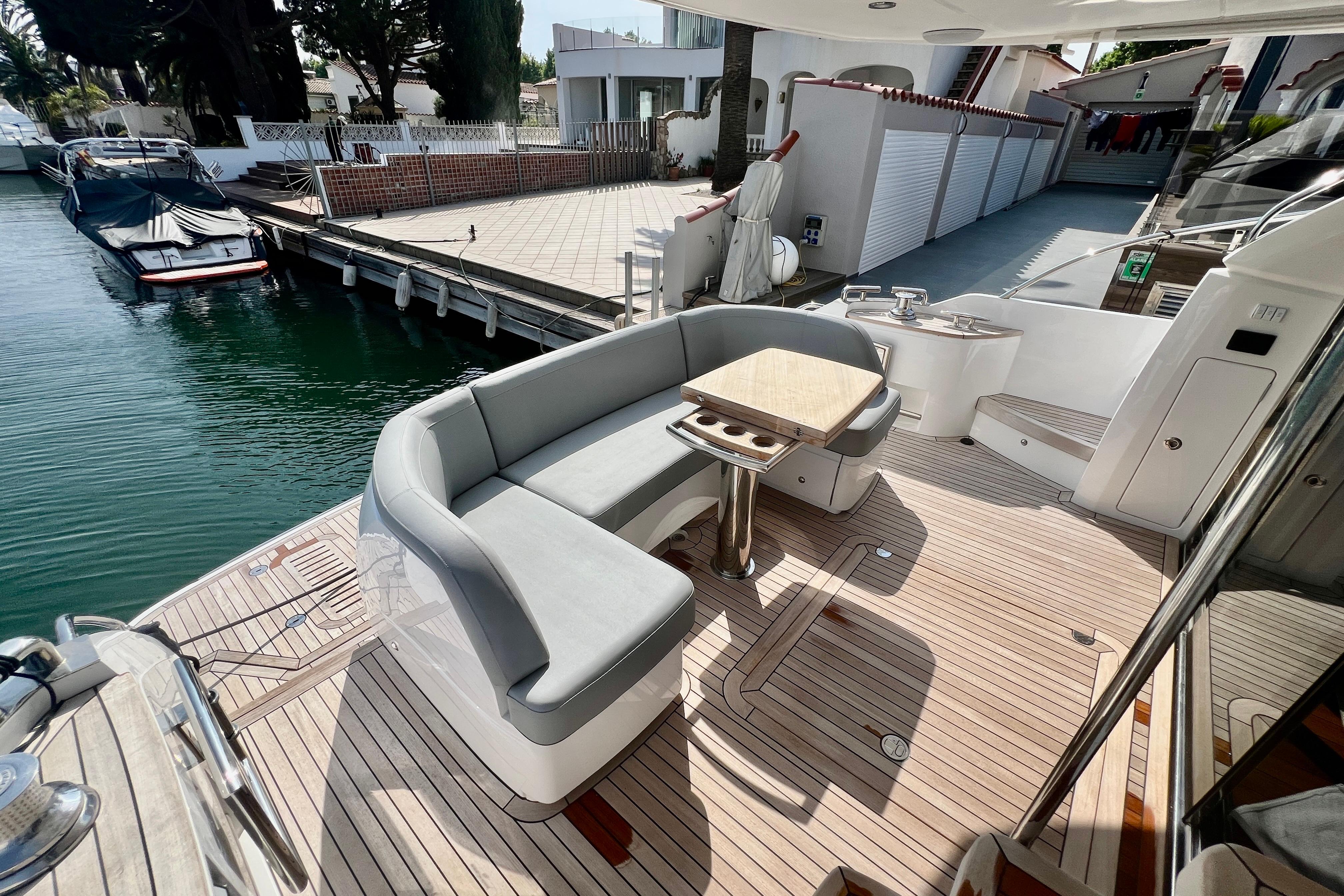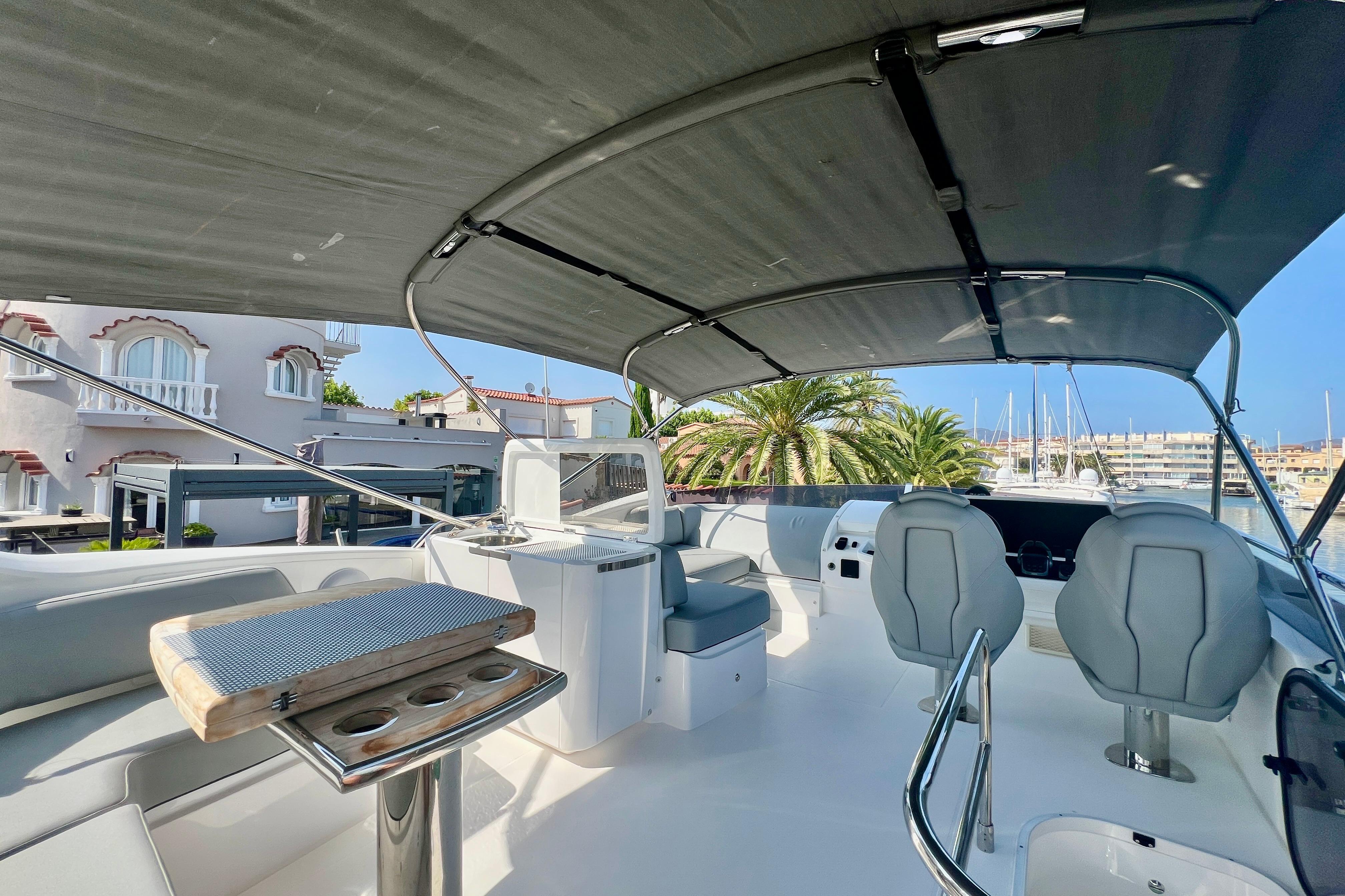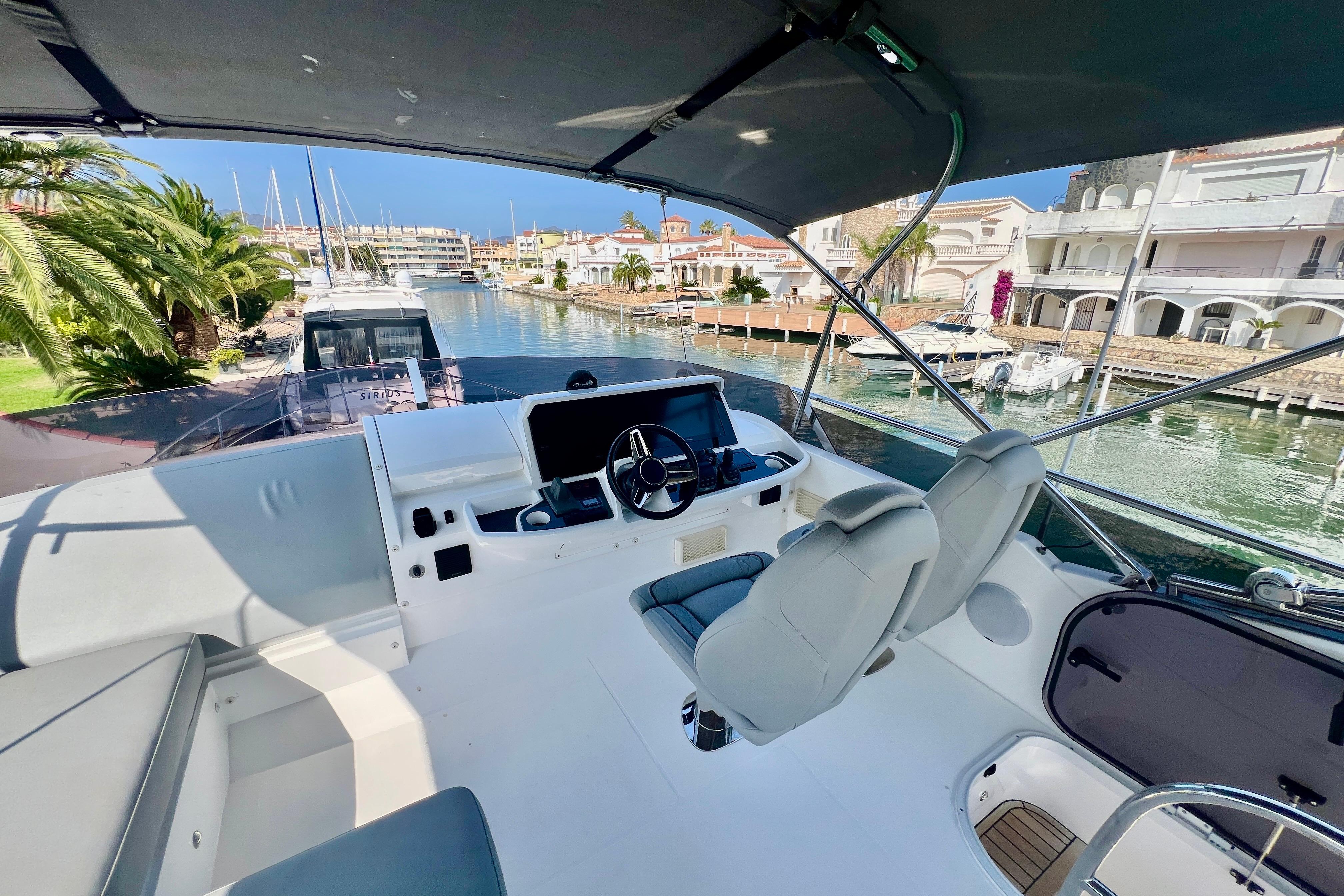 Su diseño exterior destaca por líneas elegantes y modernas, con grandes ventanales laterales que inundan de luz natural el interior. El amplio flybridge, uno de los mayores en su categoría, ofrece una zona de gobierno secundaria con asientos para el piloto y copiloto, un espacioso solárium, dinette, y una zona de bar opcional, lo que lo convierte en el lugar perfecto para socializar y relajarse al aire libre.