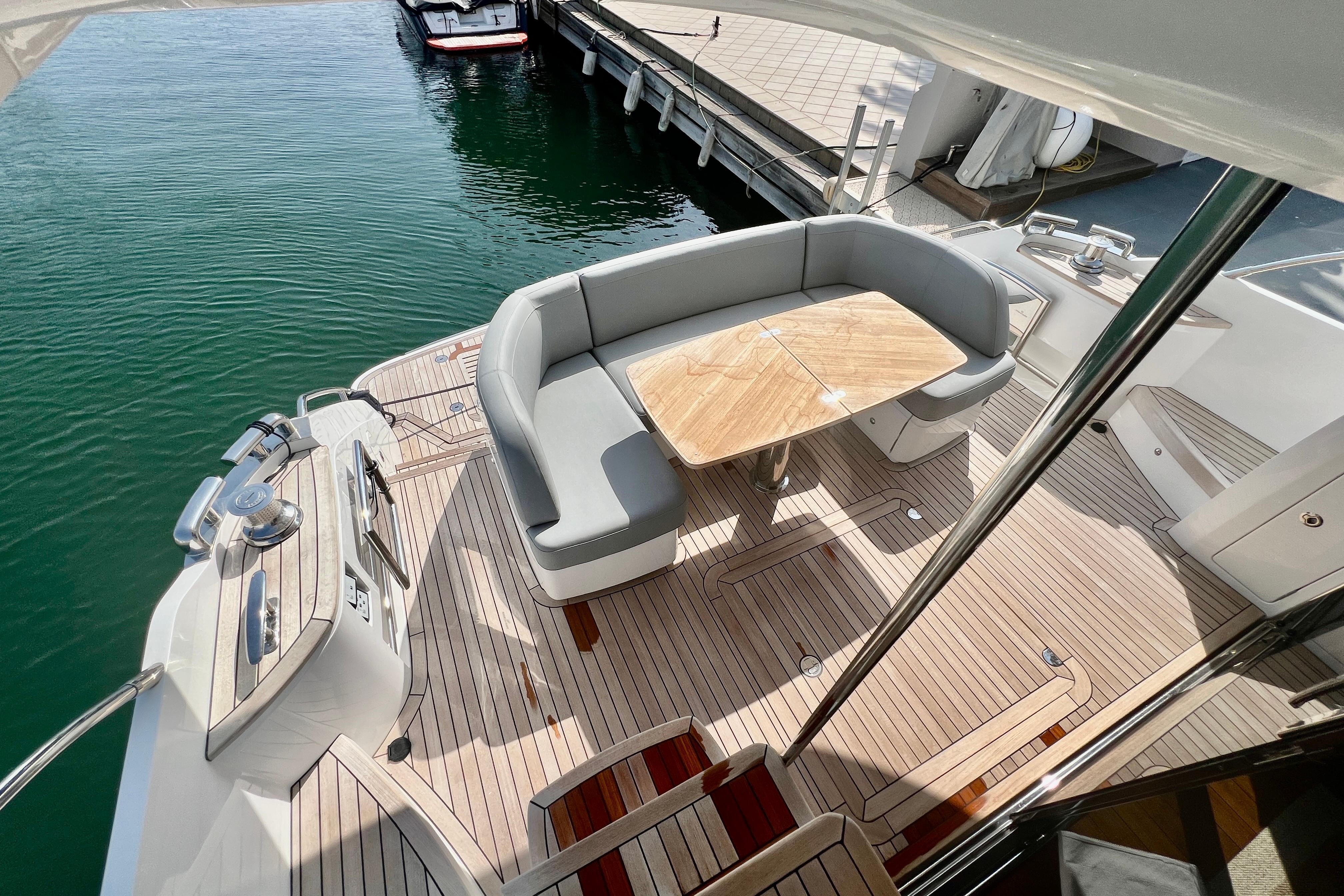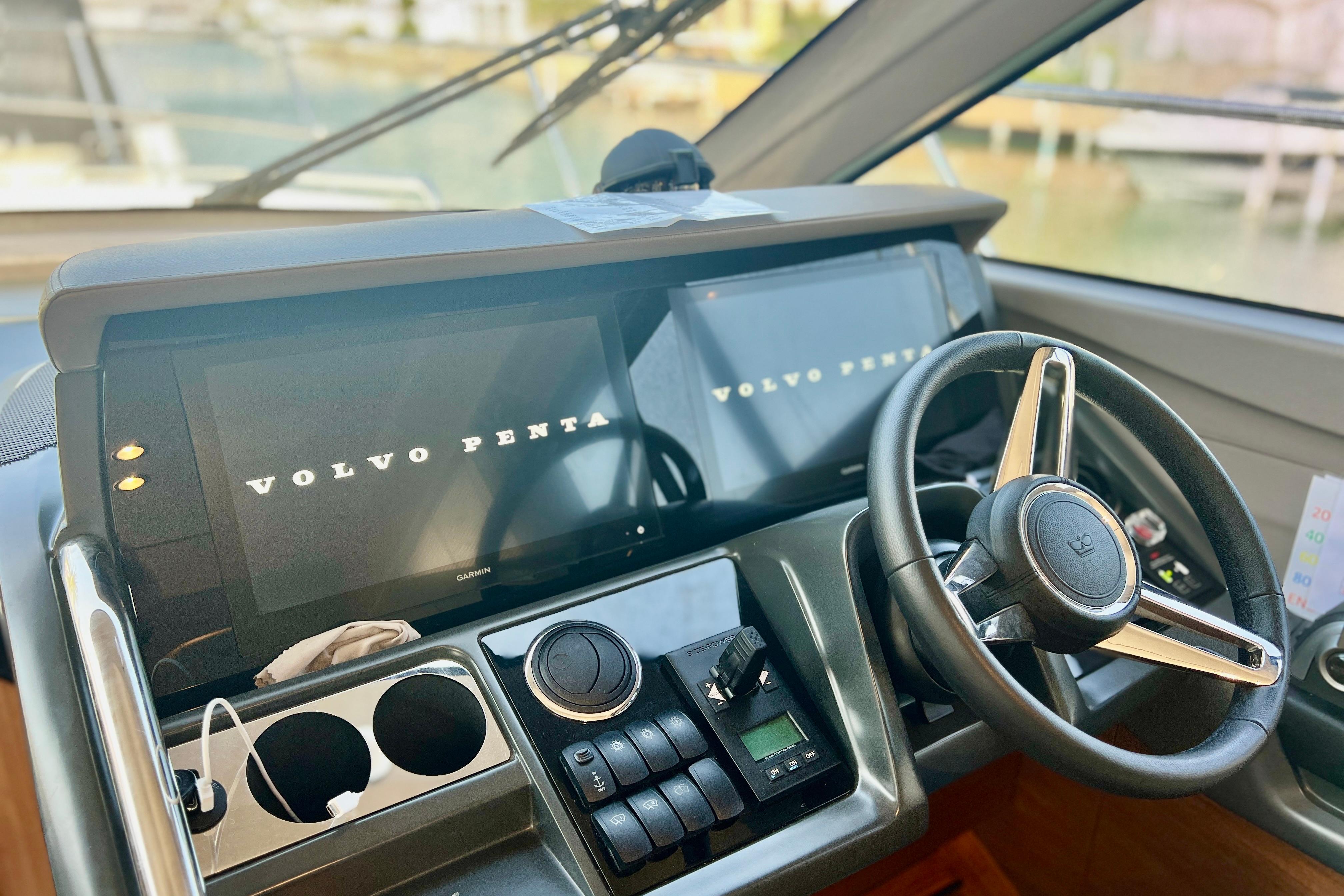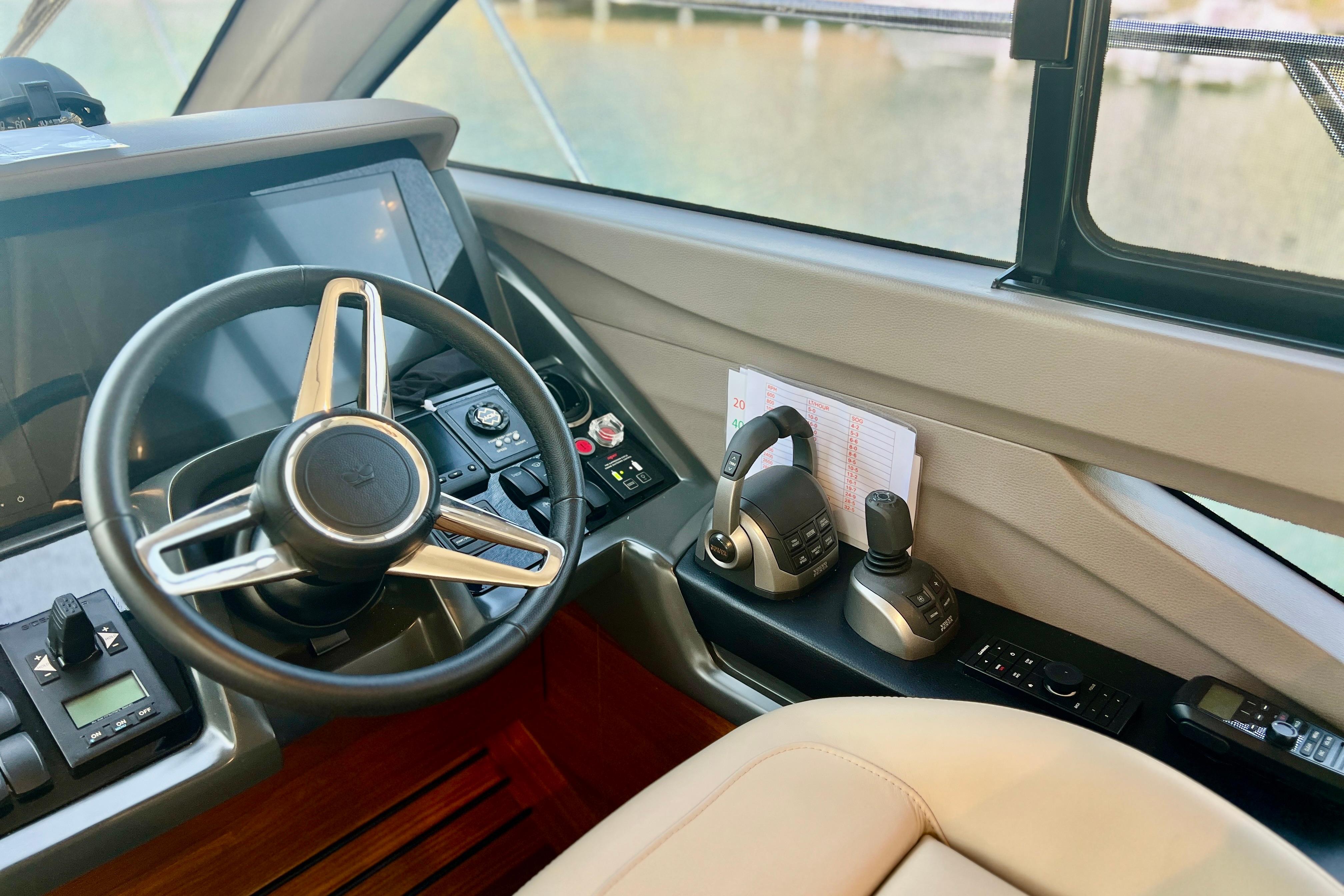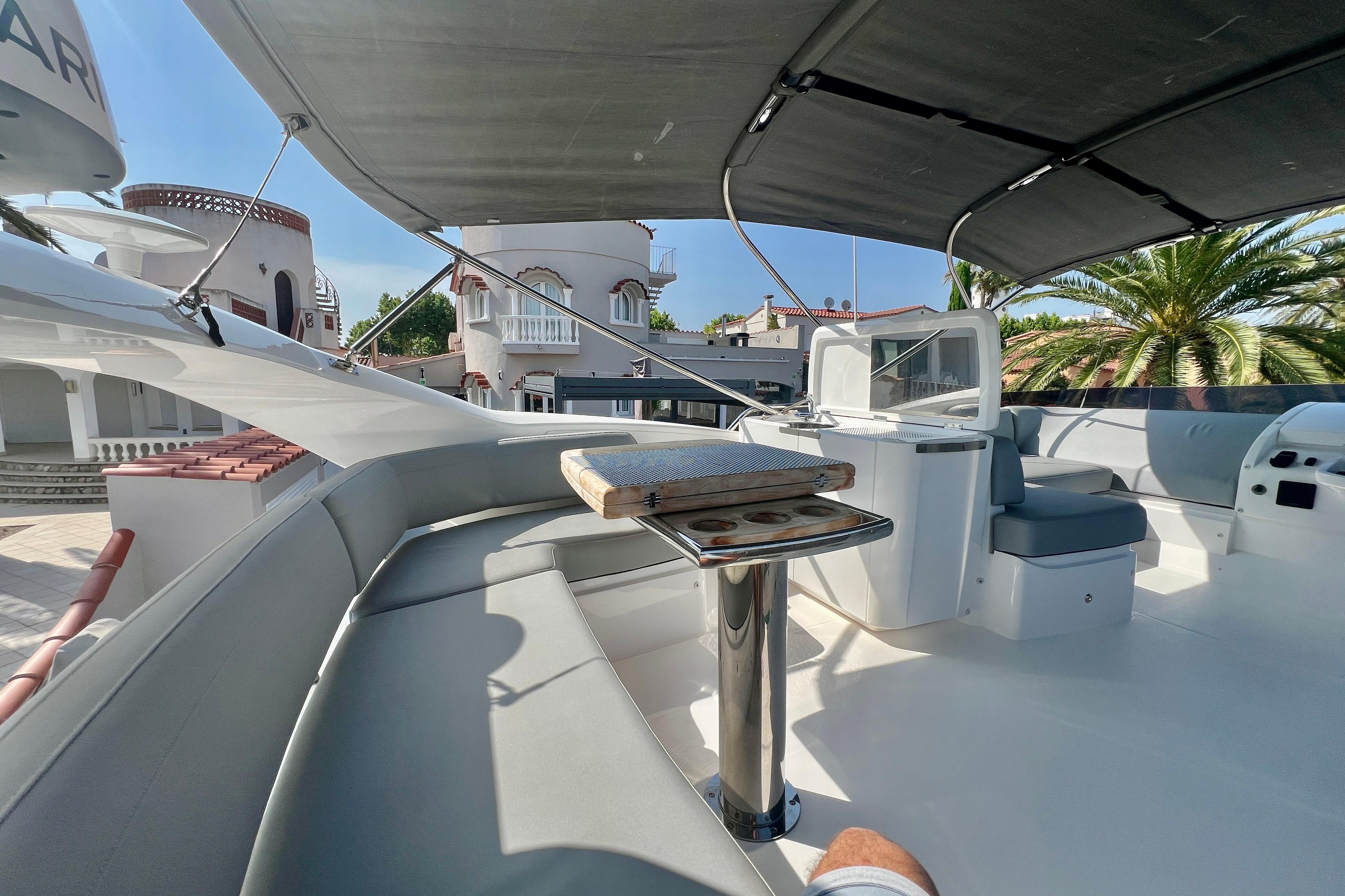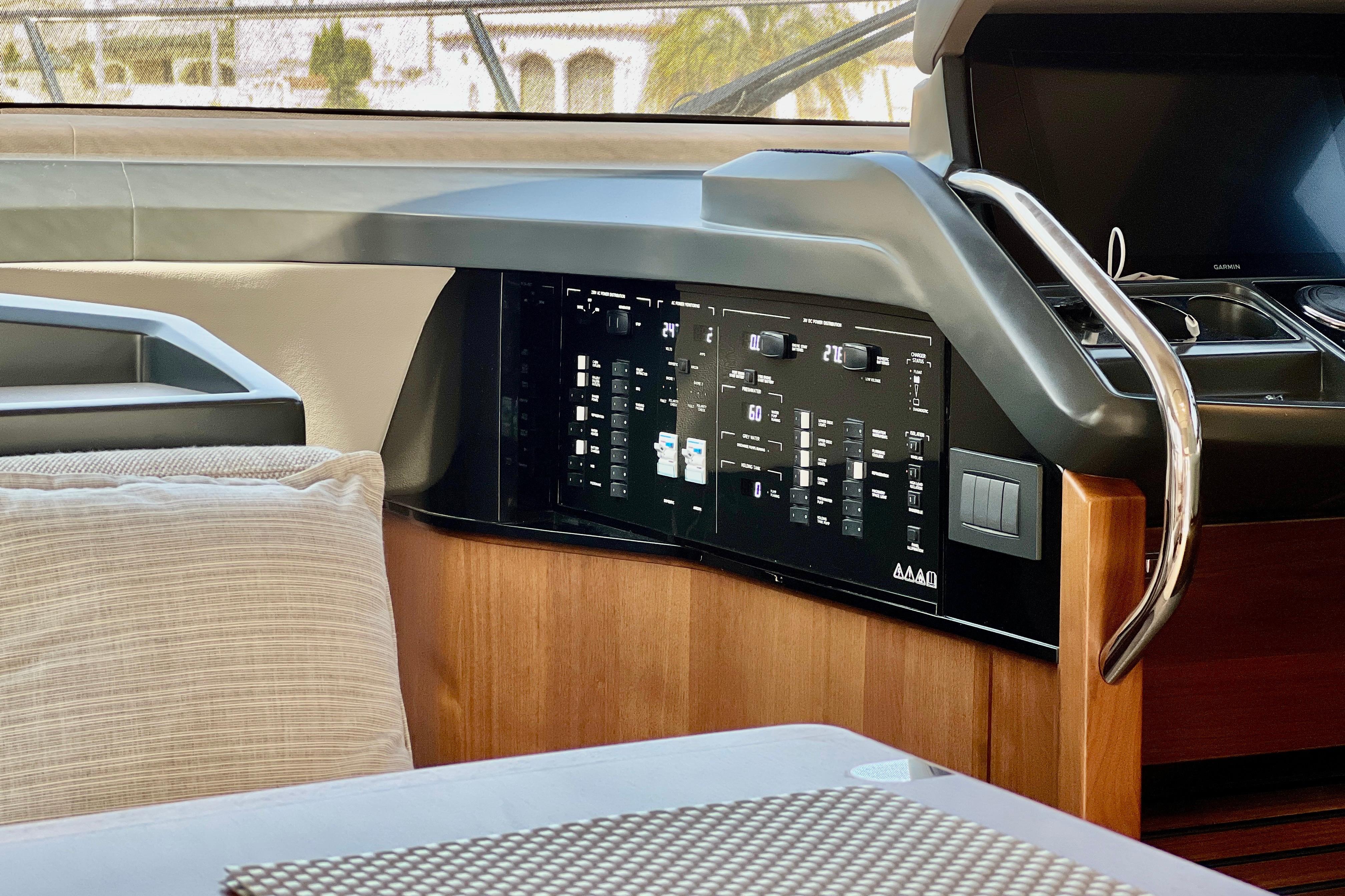 Su diseño exterior destaca por líneas elegantes y modernas, con grandes ventanales laterales que inundan de luz natural el interior. El amplio flybridge, uno de los mayores en su categoría, ofrece una zona de gobierno secundaria con asientos para el piloto y copiloto, un espacioso solárium, dinette, y una zona de bar opcional, lo que lo convierte en el lugar perfecto para socializar y relajarse al aire libre.