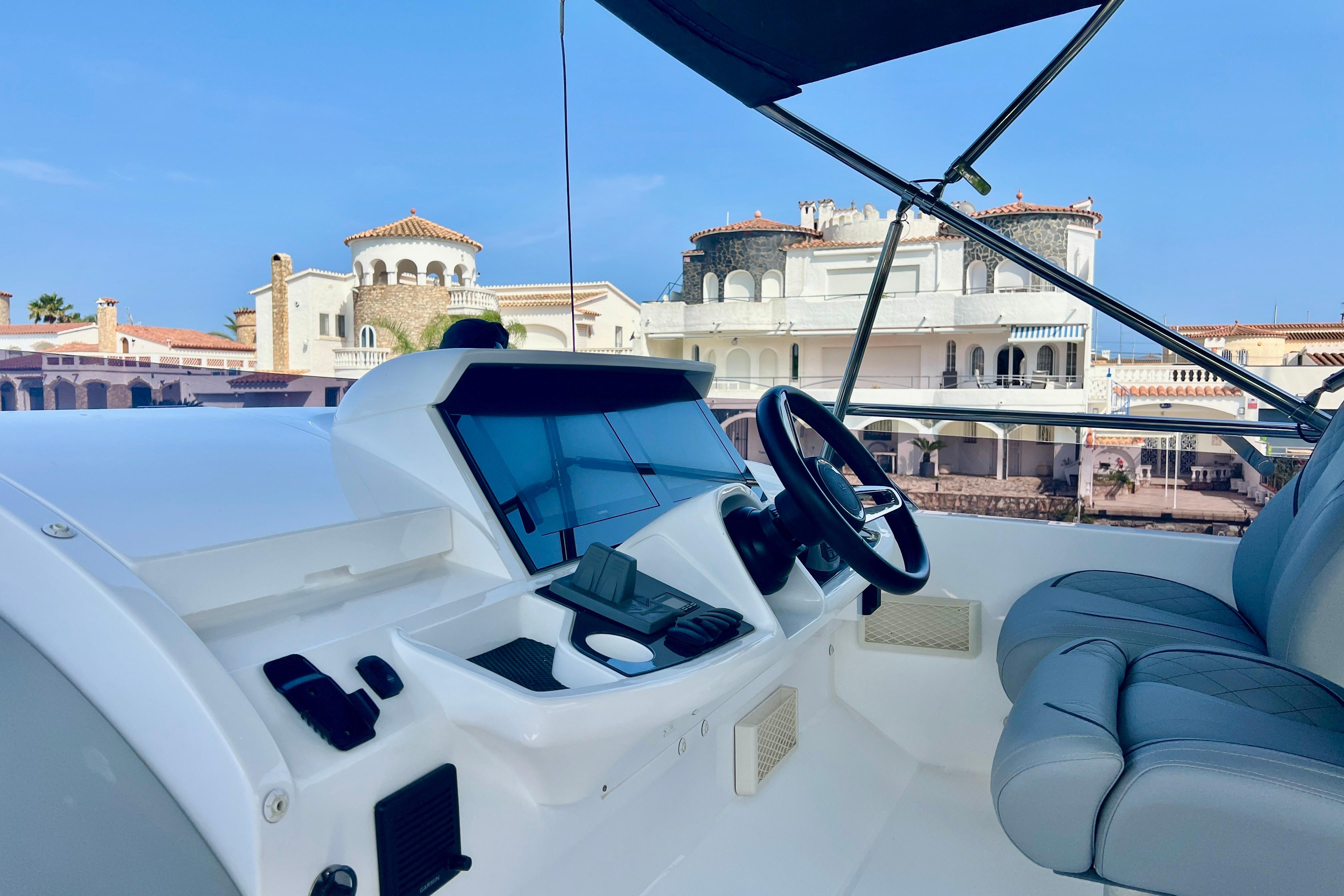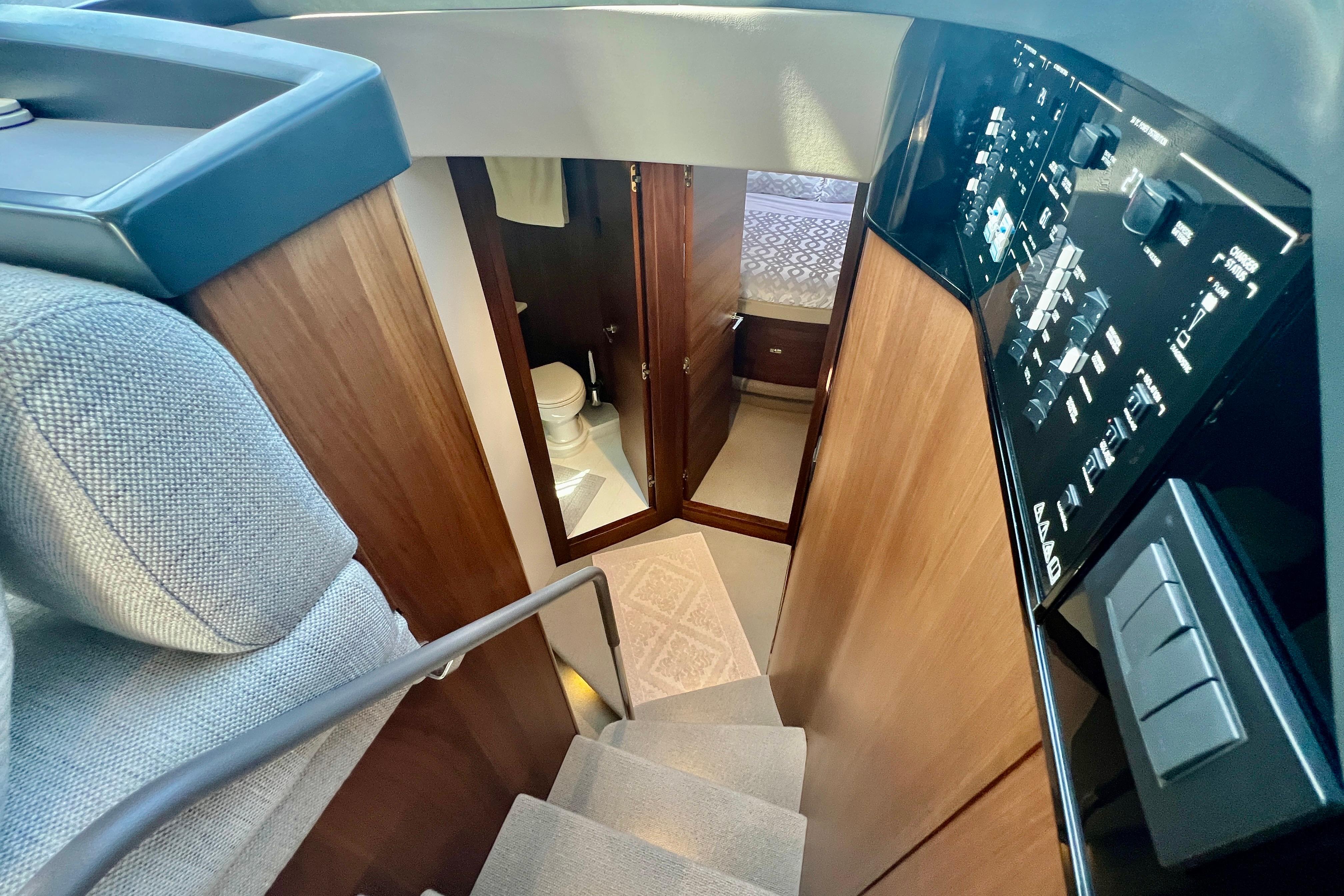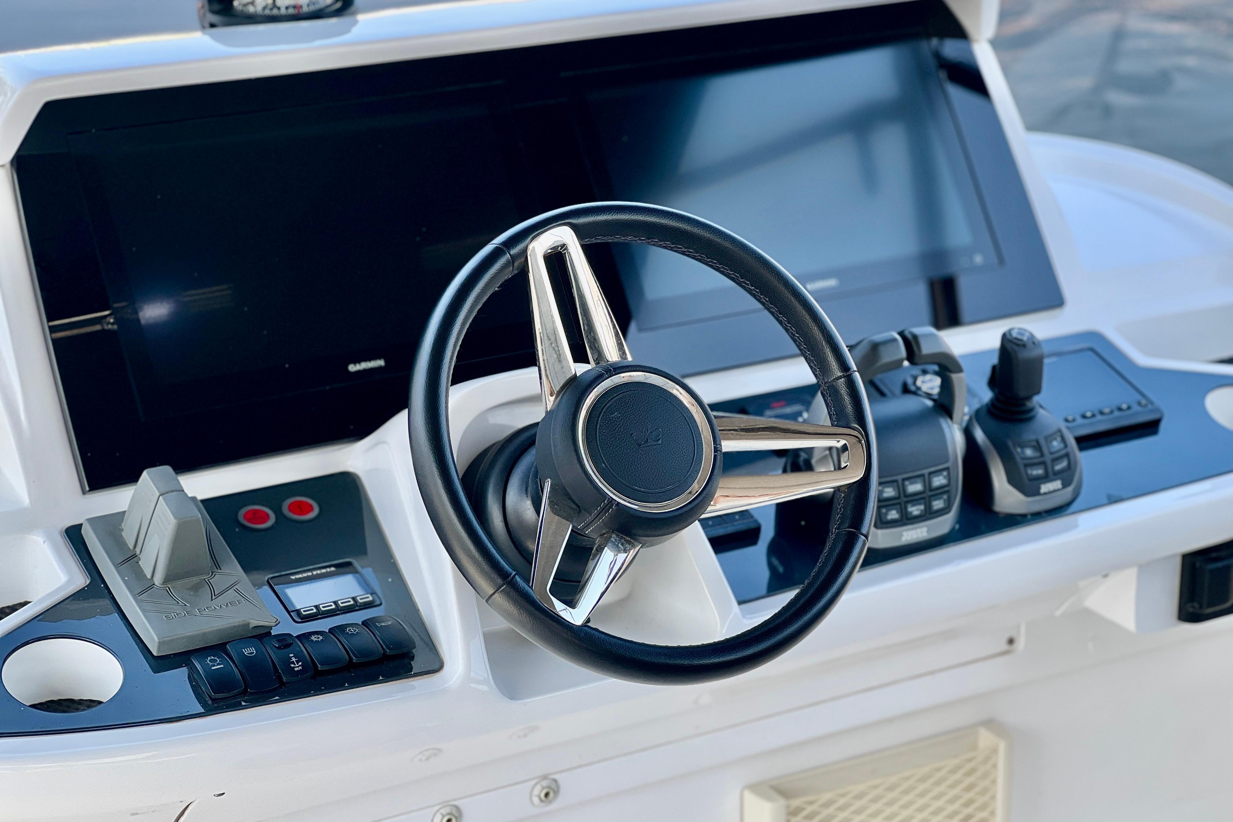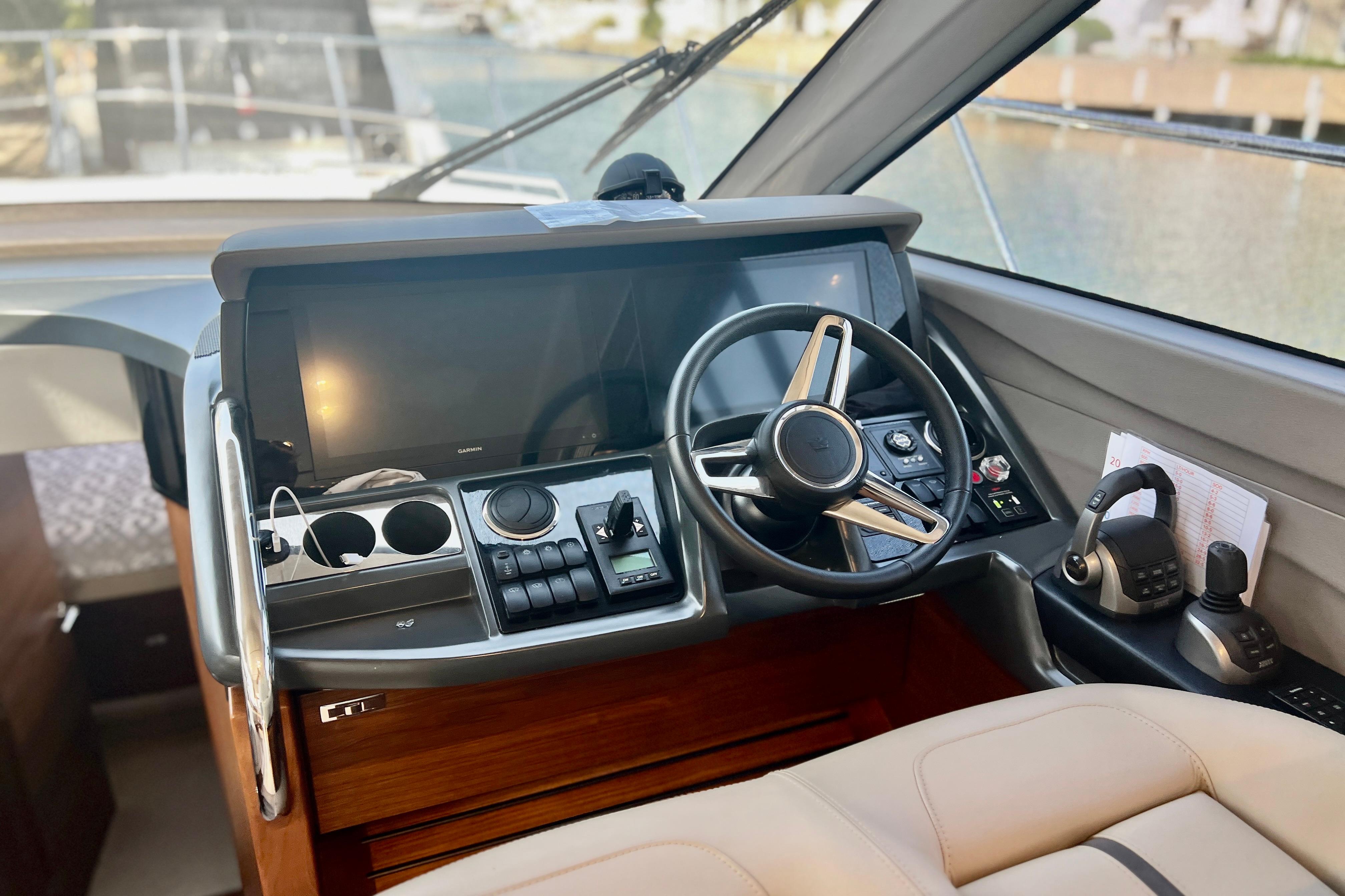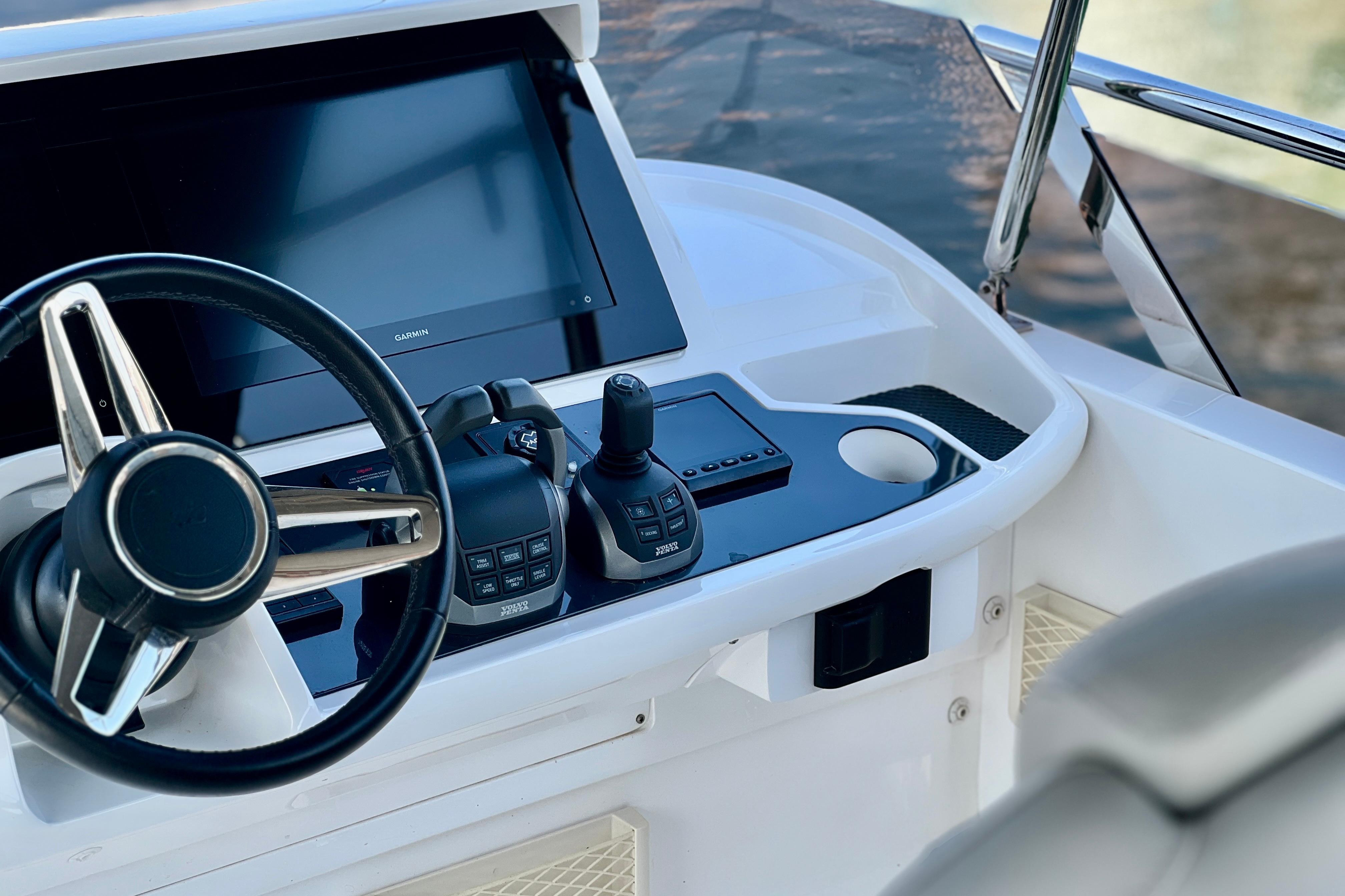 Su diseño exterior destaca por líneas elegantes y modernas, con grandes ventanales laterales que inundan de luz natural el interior. El amplio flybridge, uno de los mayores en su categoría, ofrece una zona de gobierno secundaria con asientos para el piloto y copiloto, un espacioso solárium, dinette, y una zona de bar opcional, lo que lo convierte en el lugar perfecto para socializar y relajarse al aire libre.