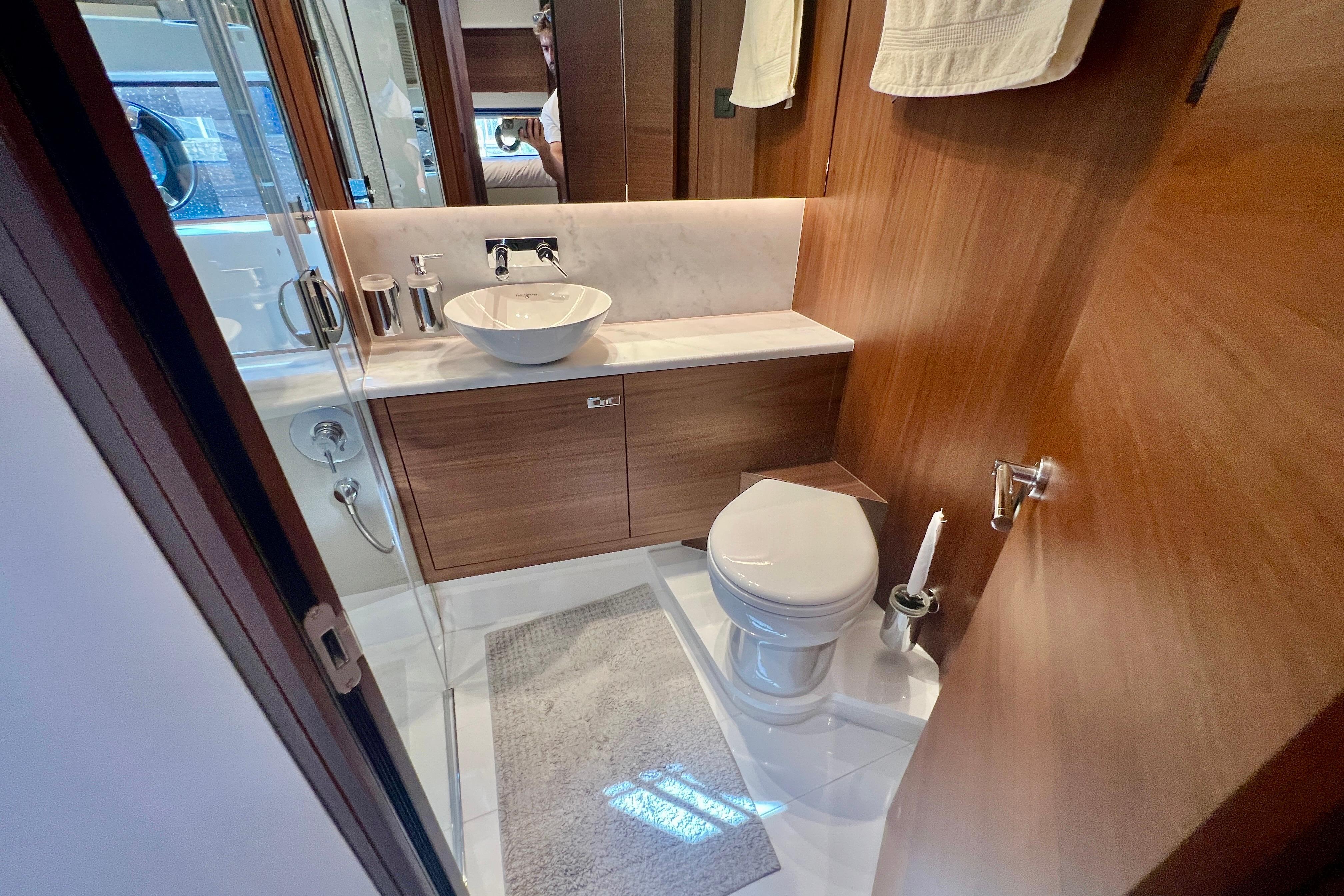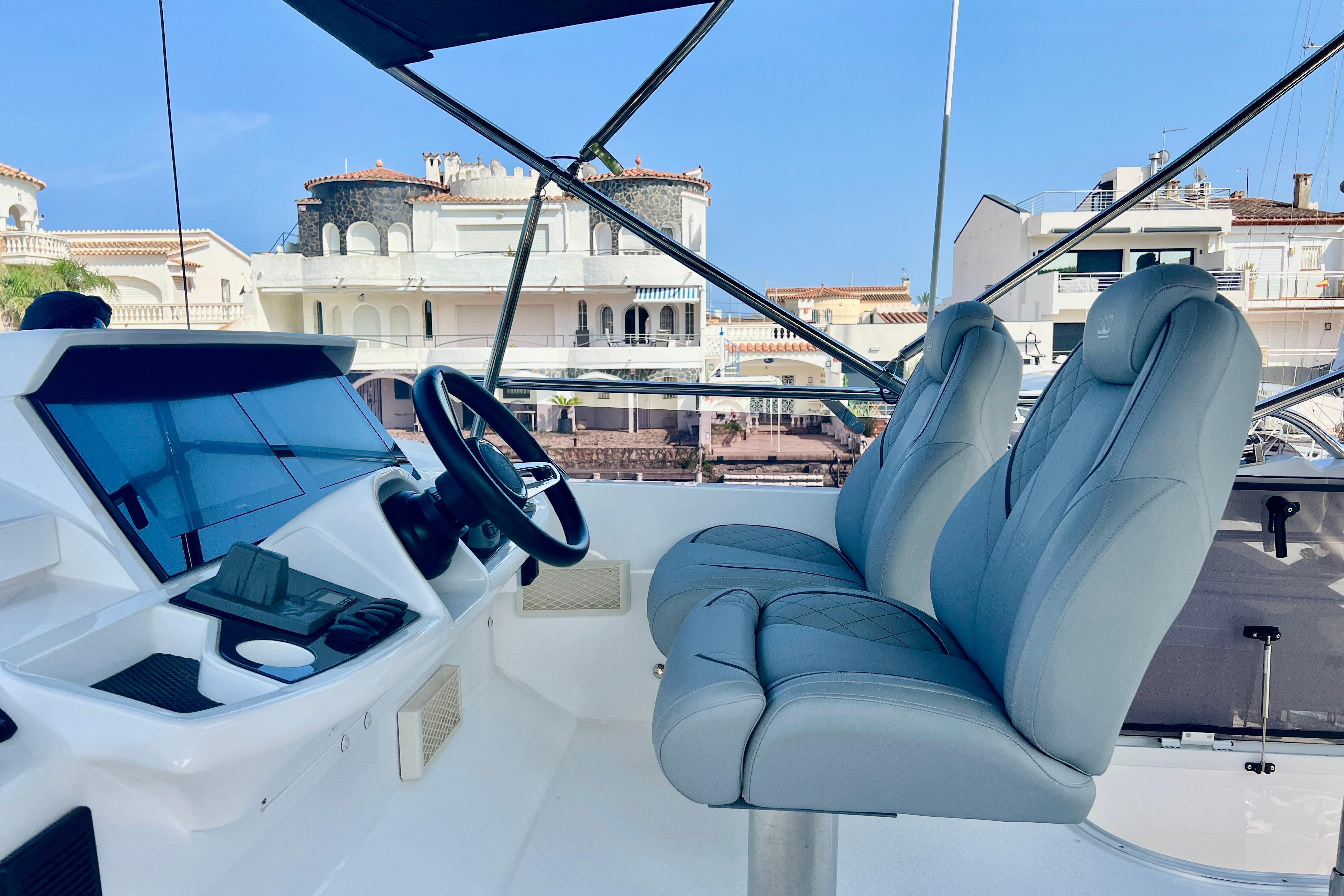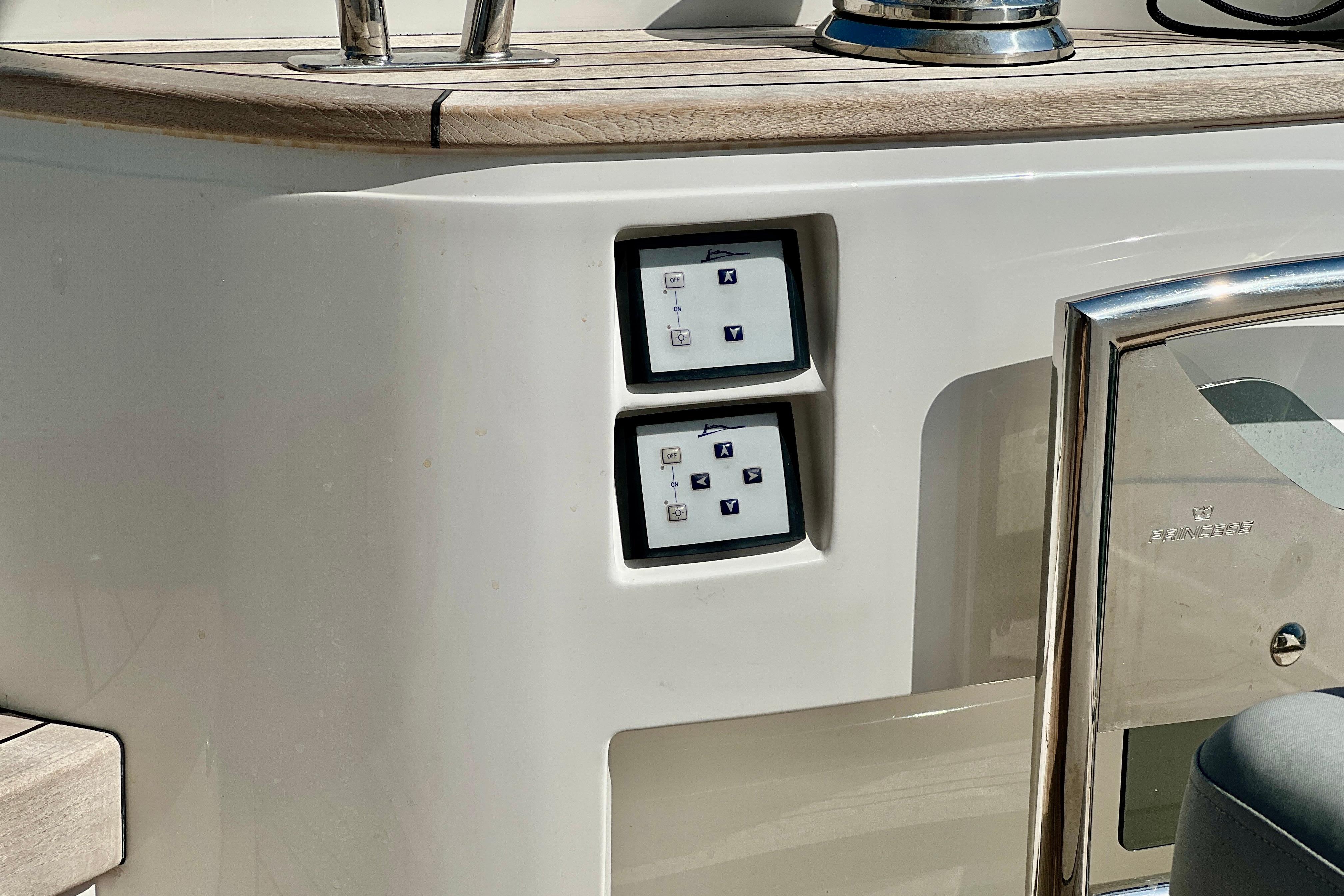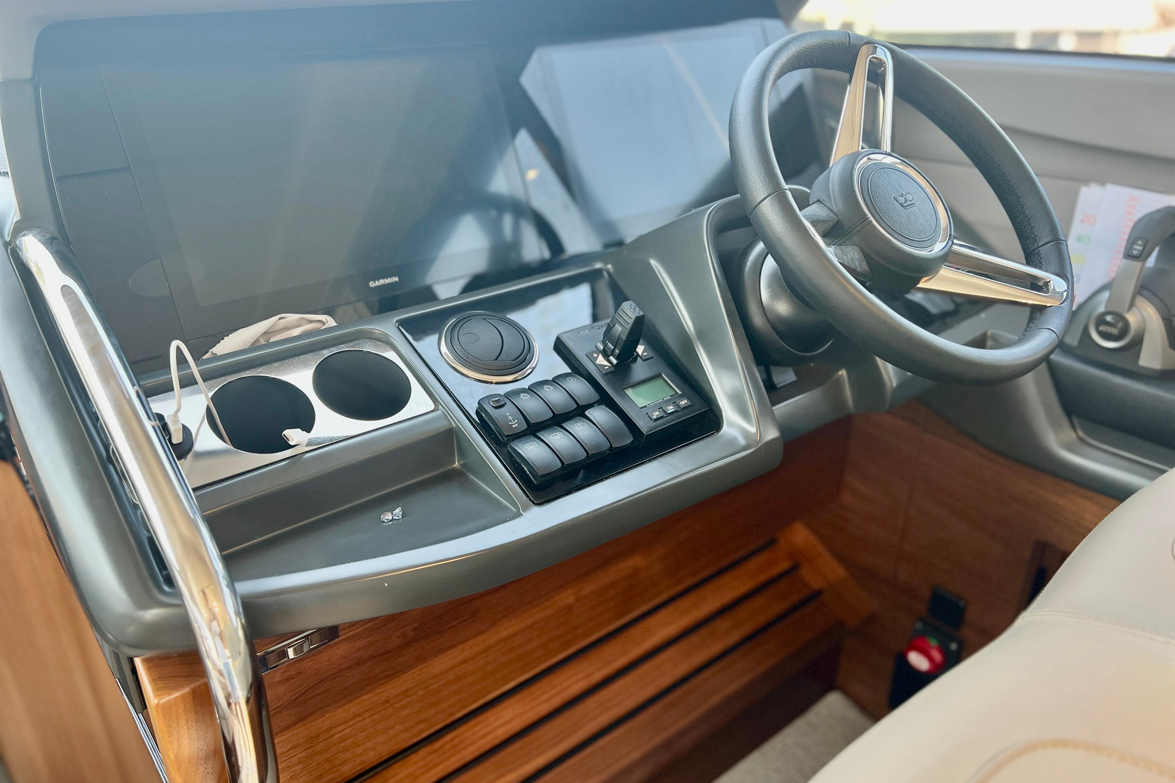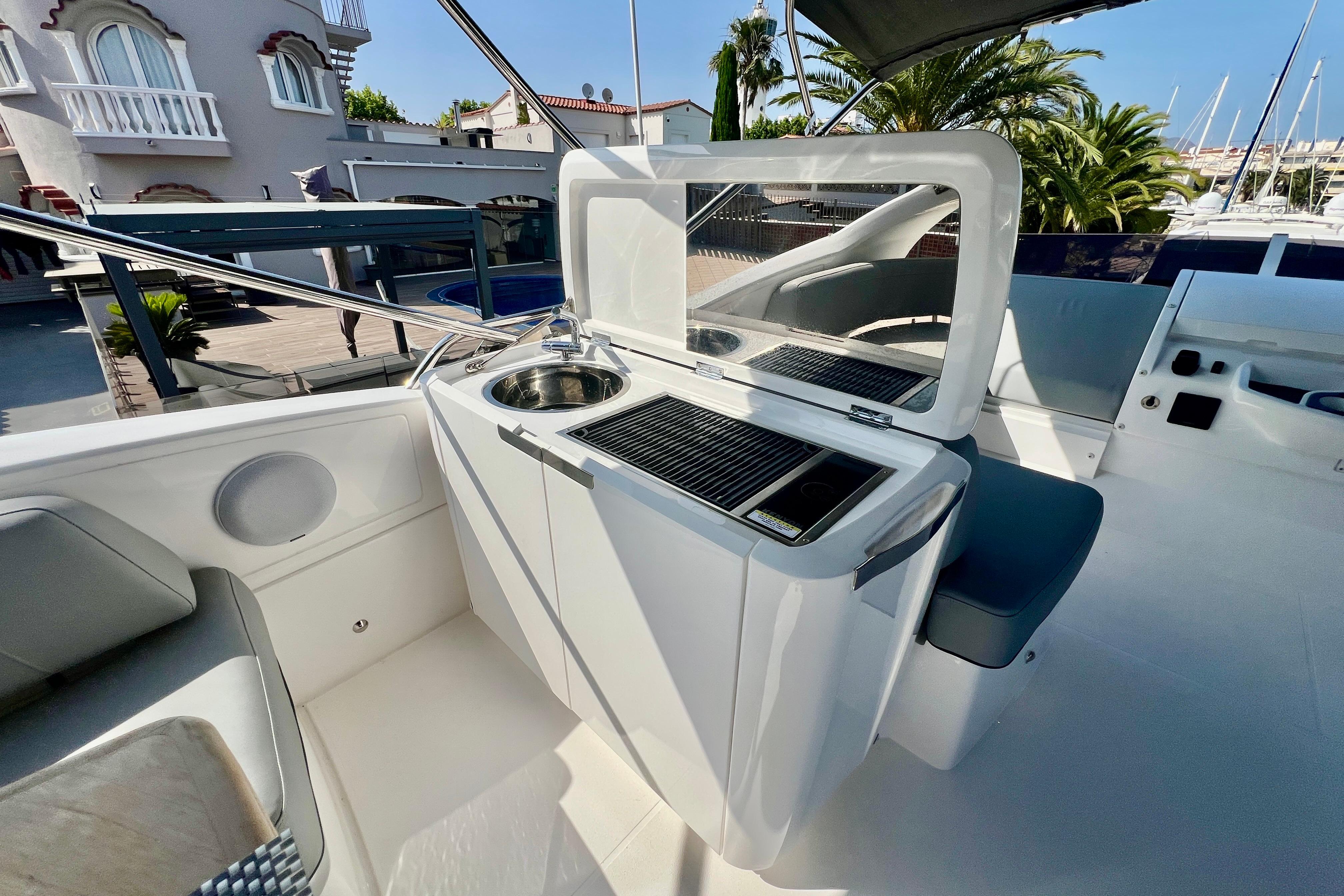 Su diseño exterior destaca por líneas elegantes y modernas, con grandes ventanales laterales que inundan de luz natural el interior. El amplio flybridge, uno de los mayores en su categoría, ofrece una zona de gobierno secundaria con asientos para el piloto y copiloto, un espacioso solárium, dinette, y una zona de bar opcional, lo que lo convierte en el lugar perfecto para socializar y relajarse al aire libre.
