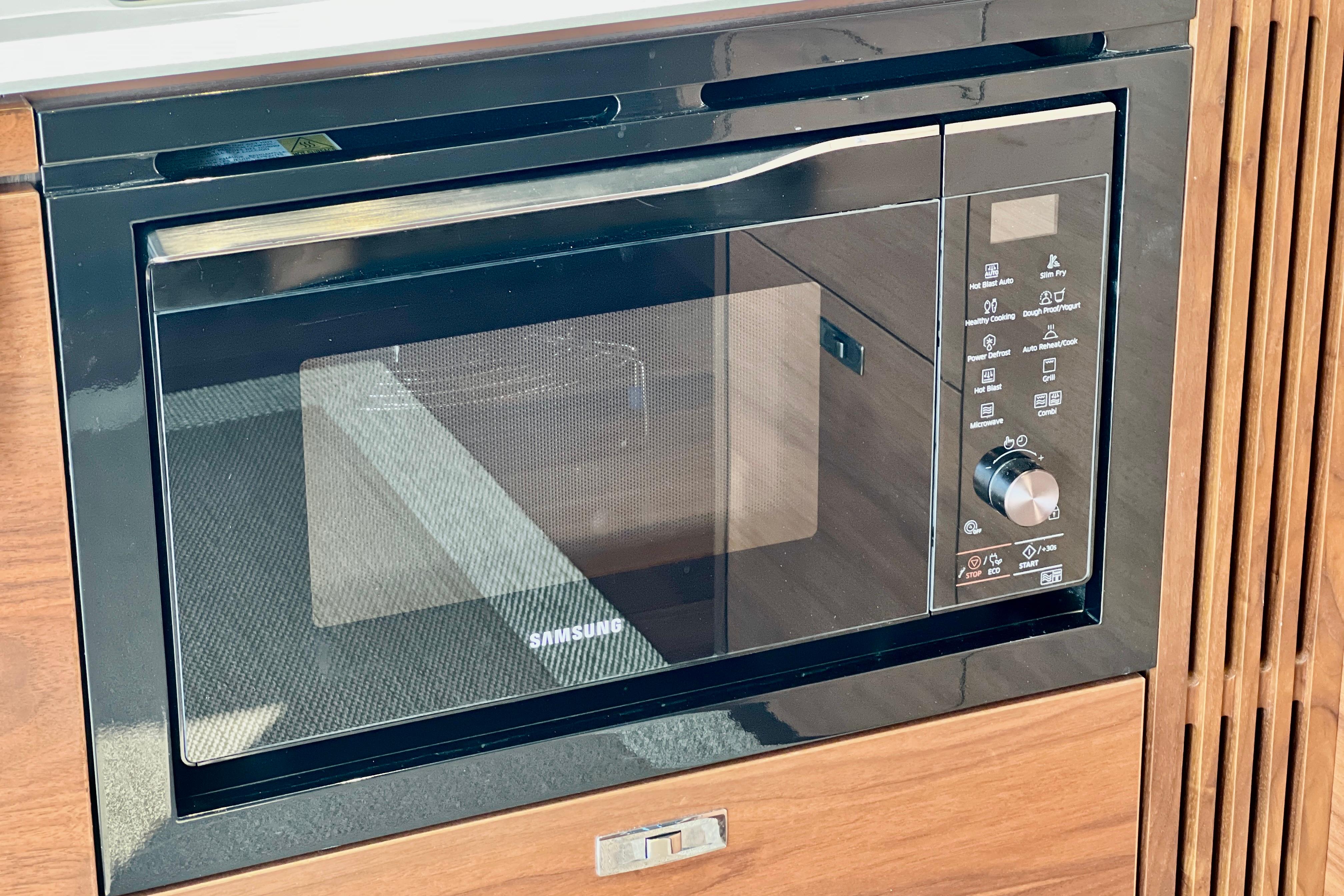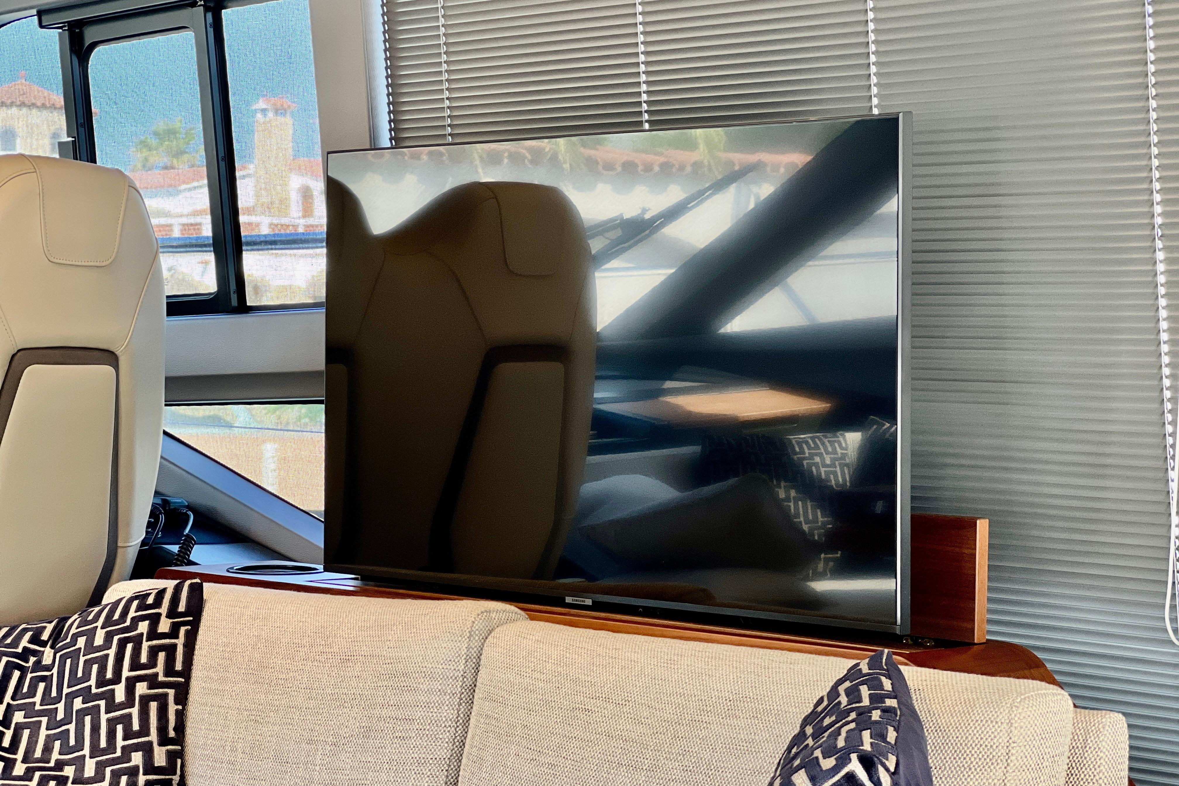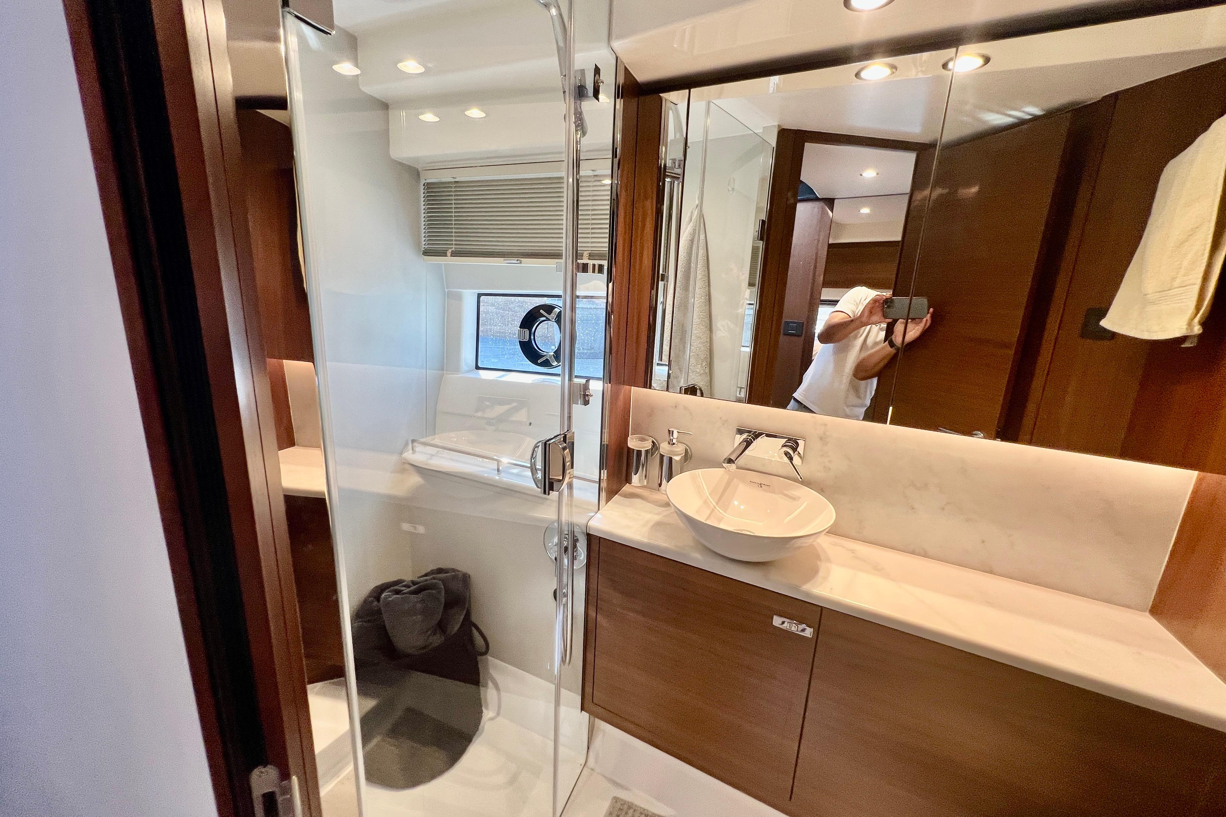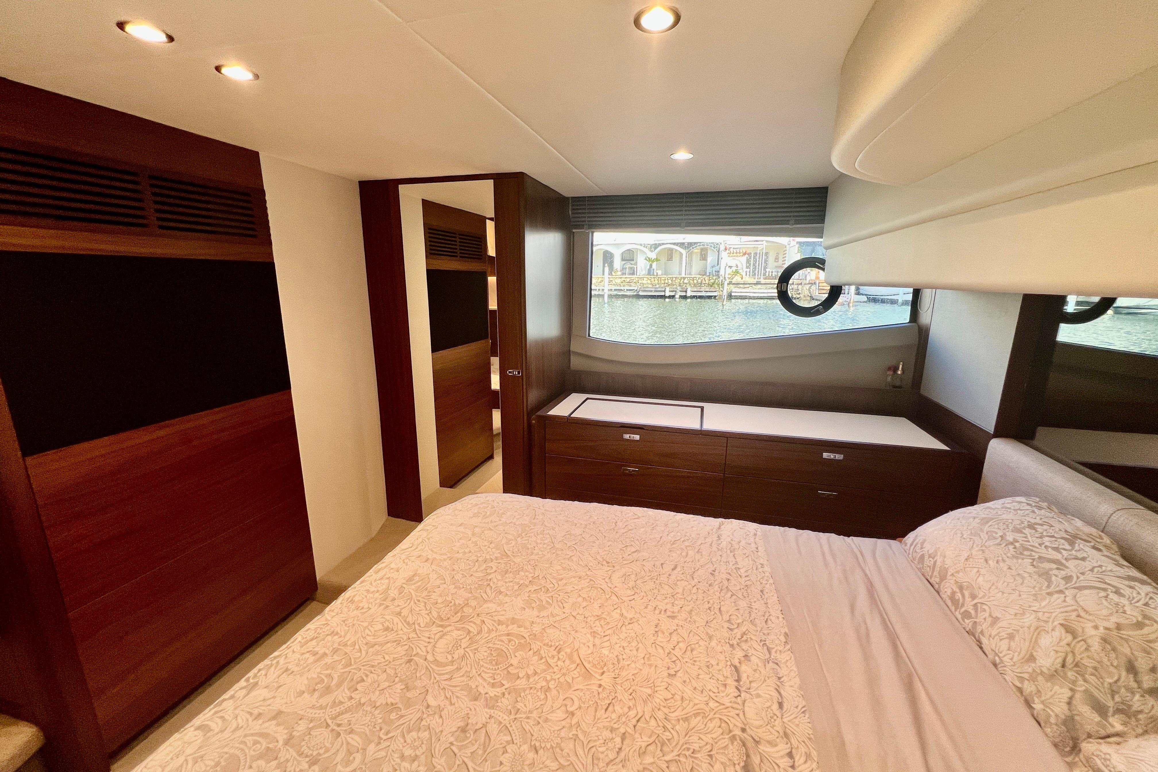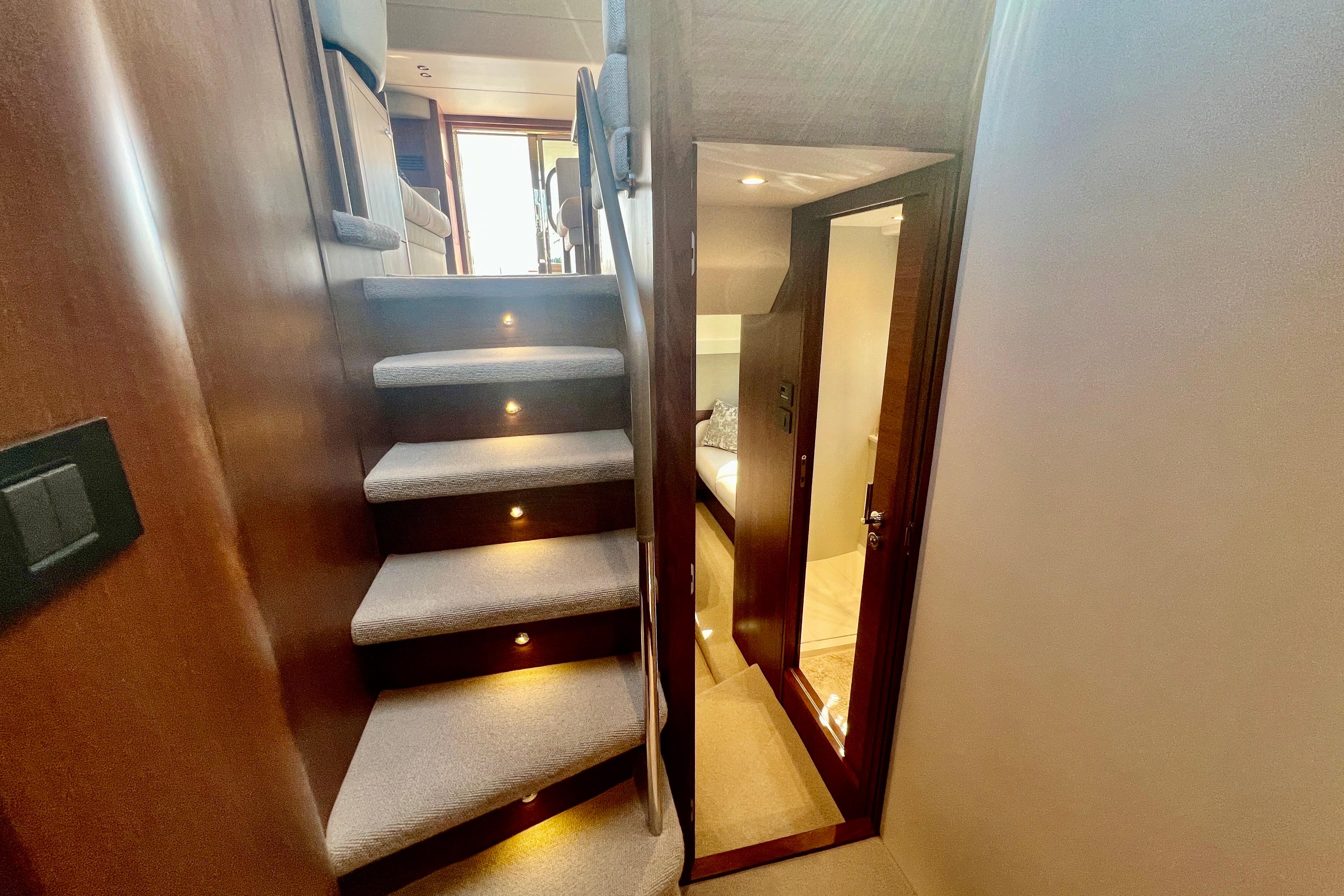 Su diseño exterior destaca por líneas elegantes y modernas, con grandes ventanales laterales que inundan de luz natural el interior. El amplio flybridge, uno de los mayores en su categoría, ofrece una zona de gobierno secundaria con asientos para el piloto y copiloto, un espacioso solárium, dinette, y una zona de bar opcional, lo que lo convierte en el lugar perfecto para socializar y relajarse al aire libre.