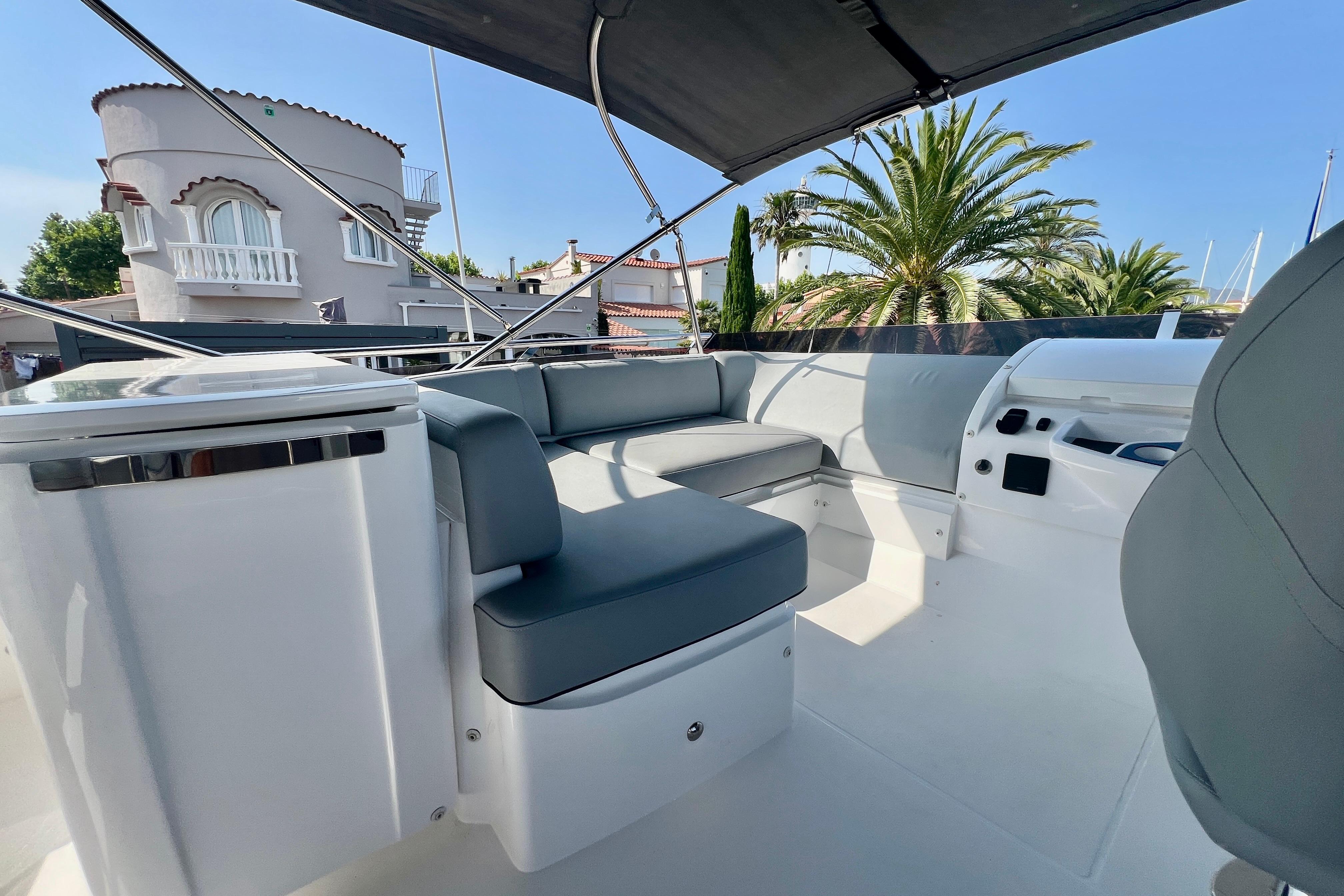 En popa, una plataforma hidráulica sumergible permite un fácil acceso al mar y la posibilidad de transportar un jet ski o tender, mientras que la bañera ofrece un cómodo sofá con mesa para comidas al aire libre.