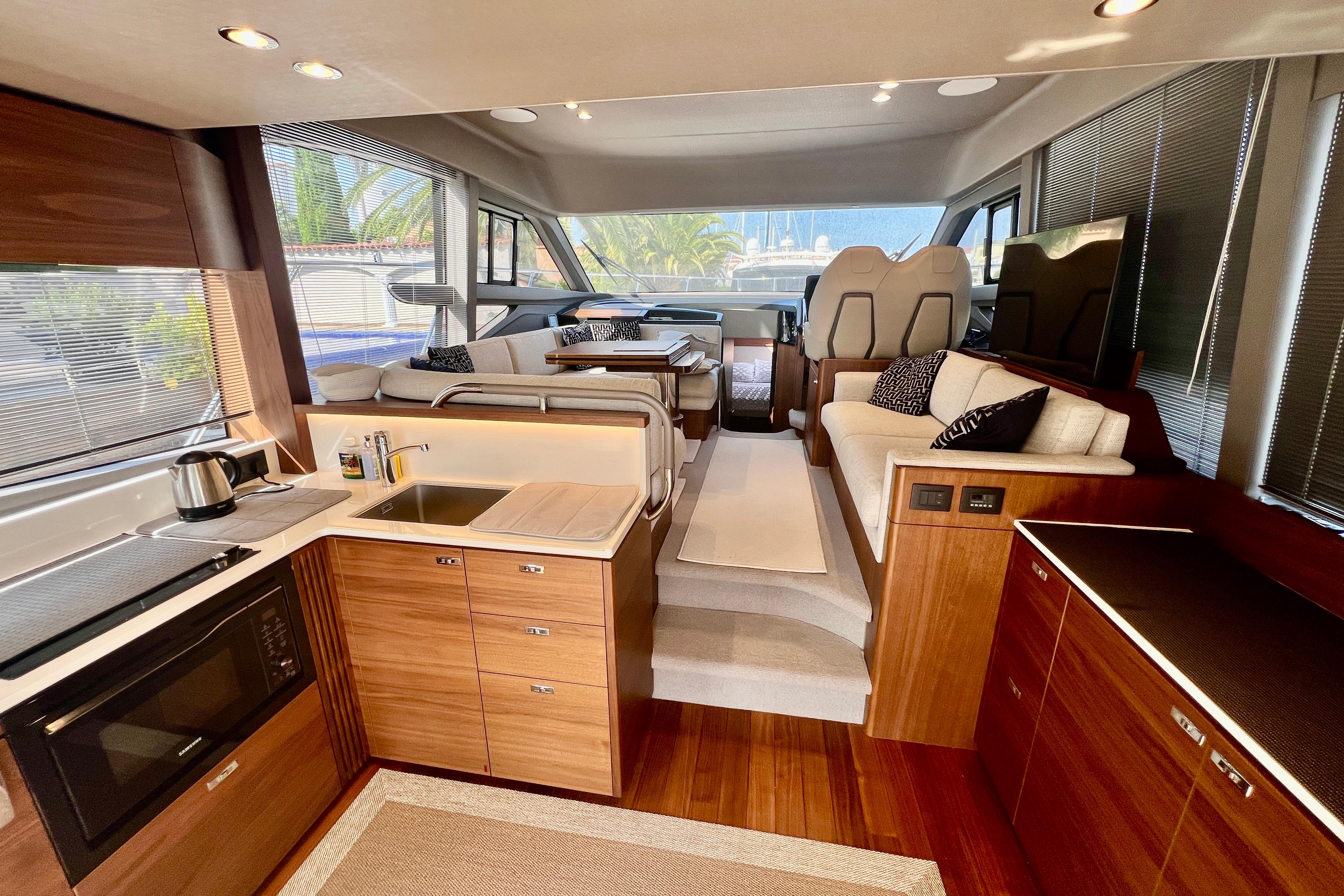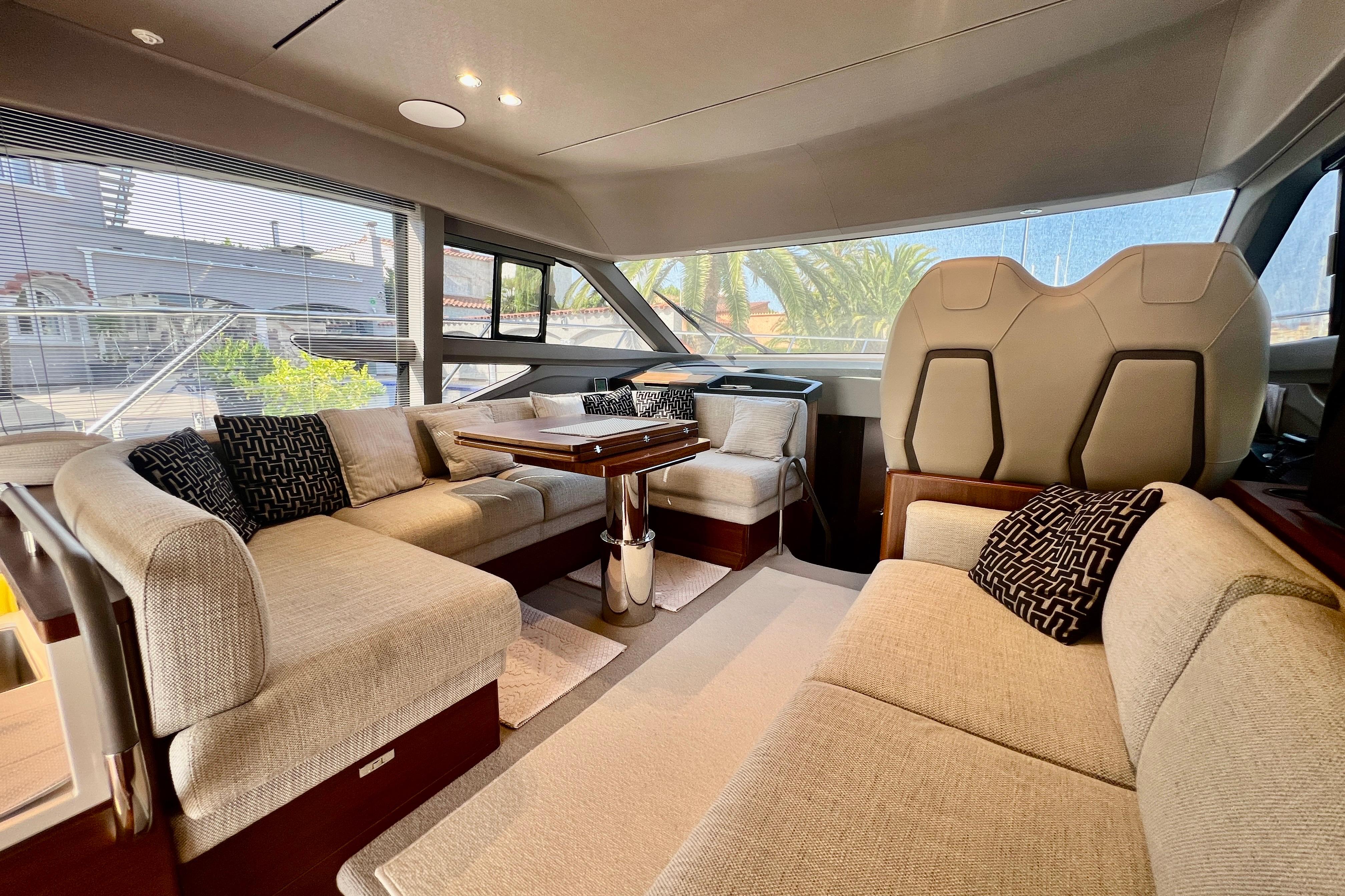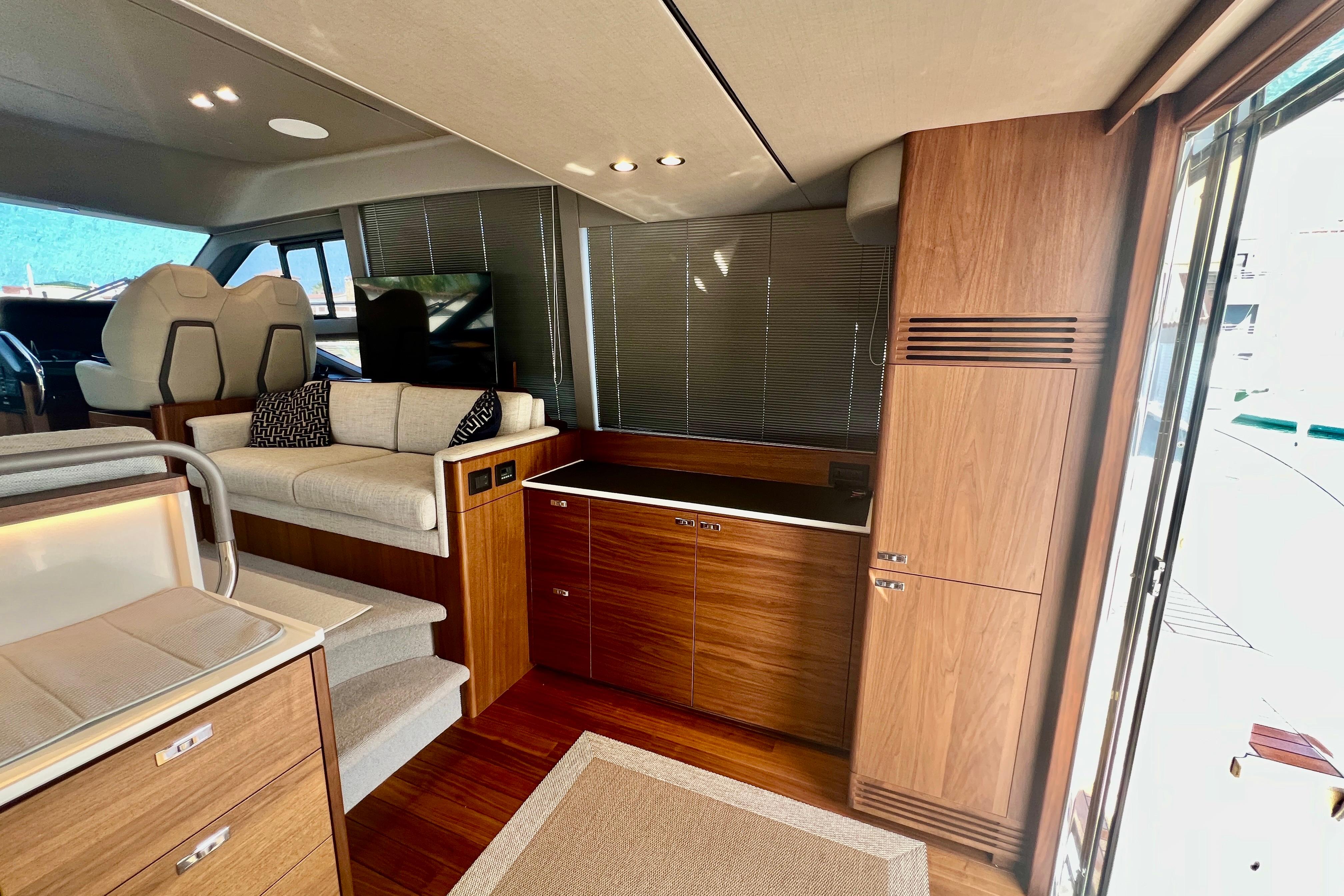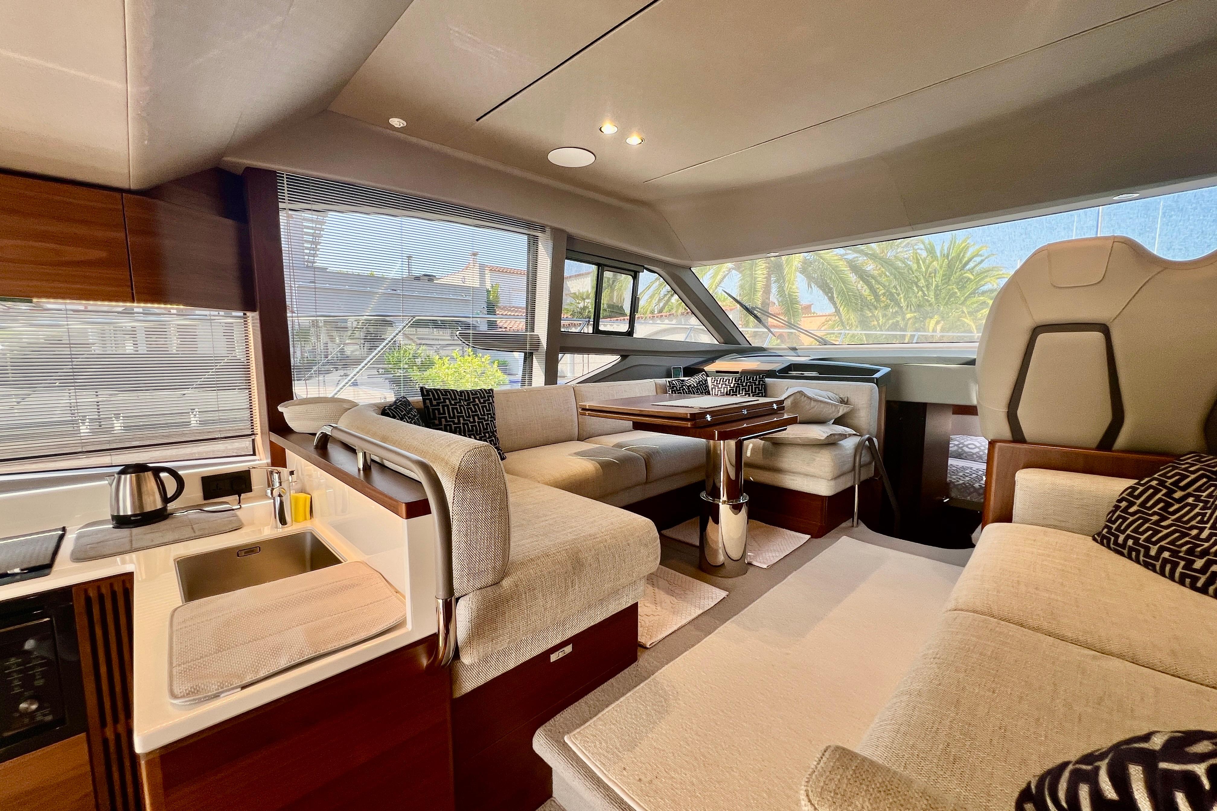 El interior de la F50 refleja el refinado estilo británico de Princess, con acabados de alta gama, carpintería artesanal, y una paleta de colores suaves y sofisticados. El salón principal, a nivel del puente, está dividido en una zona de comedor y otra de descanso, con un sofá en forma de U, una mesa abatible y una cocina completamente equipada en la parte posterior, conectando perfectamente con la bañera exterior.