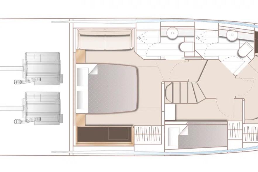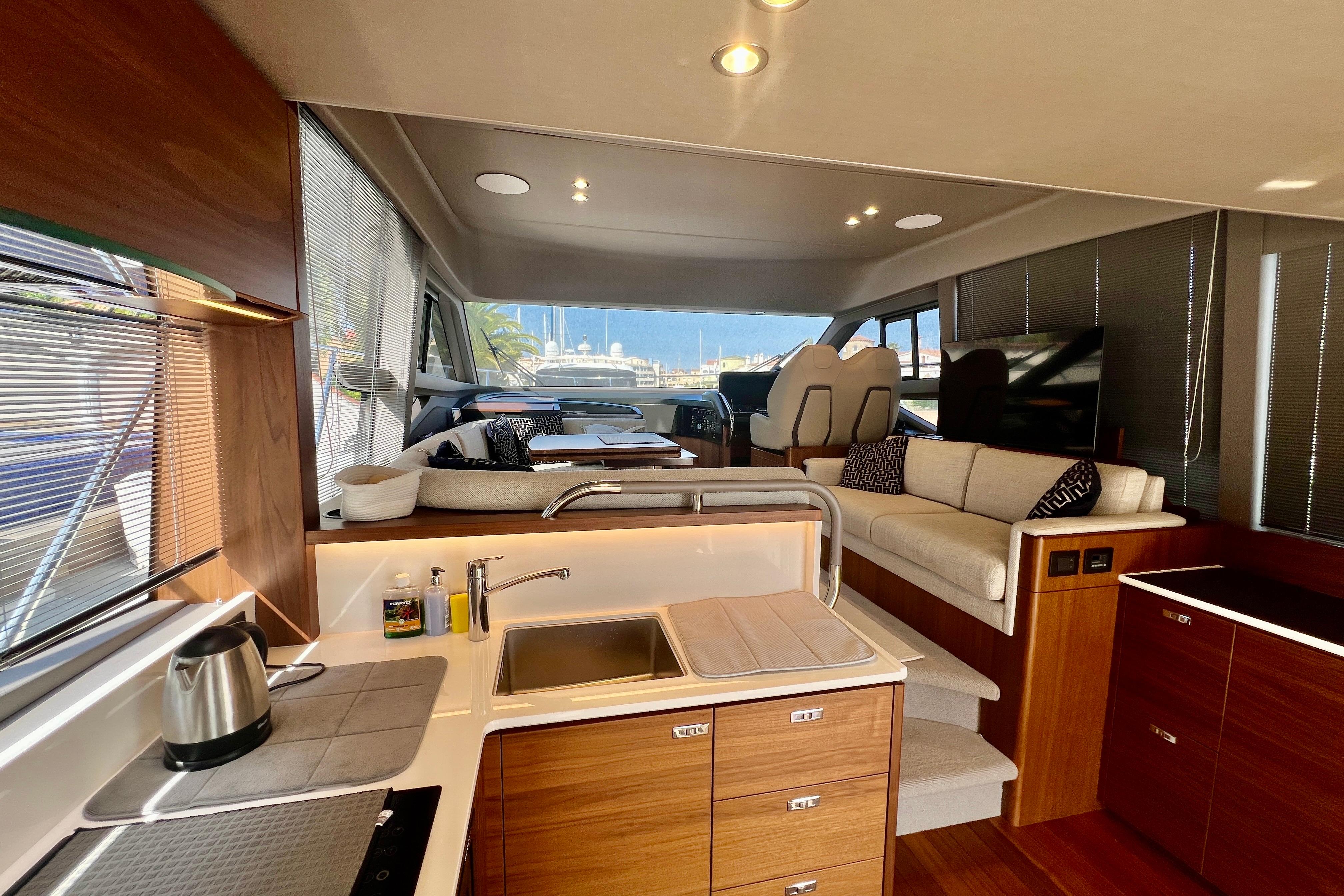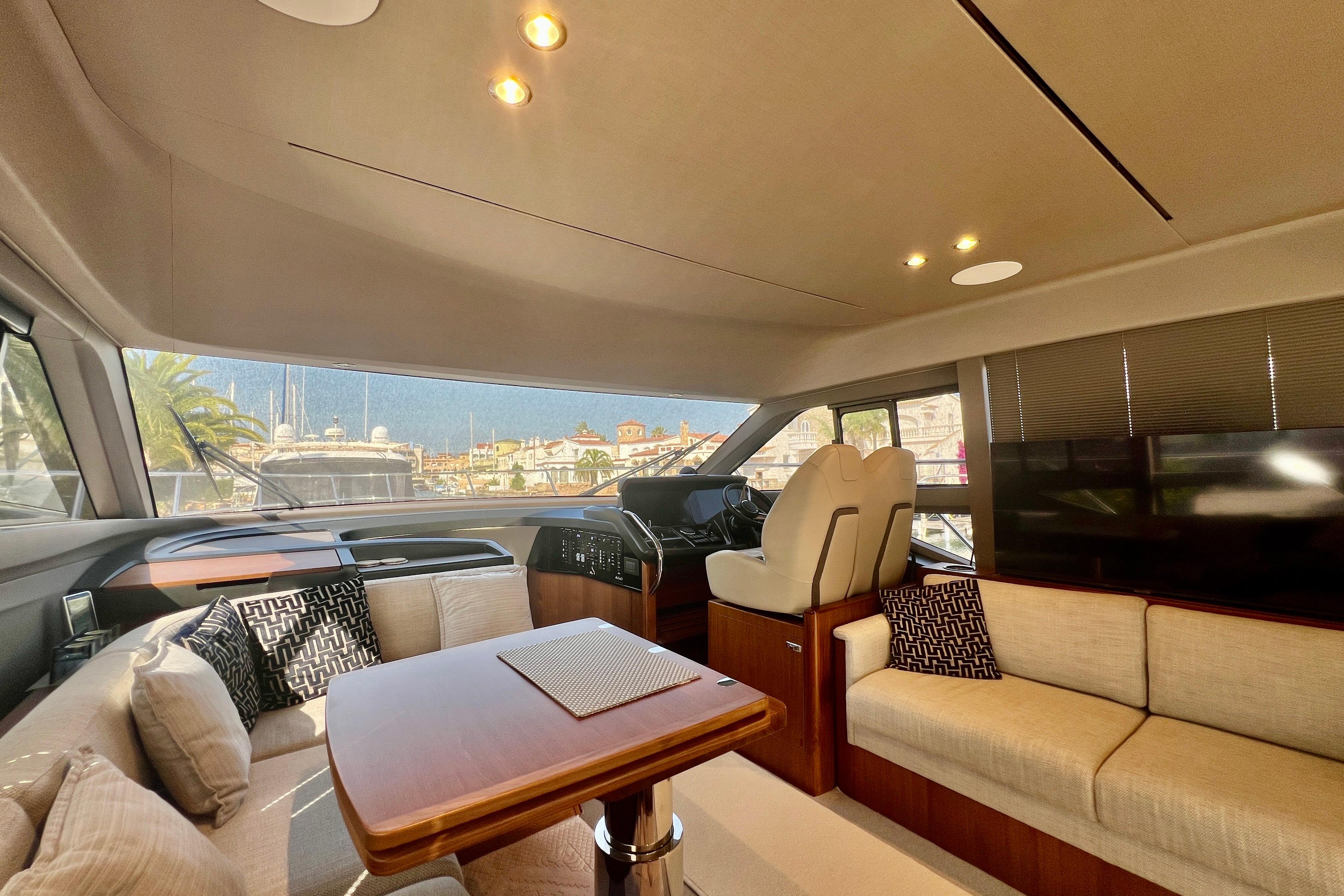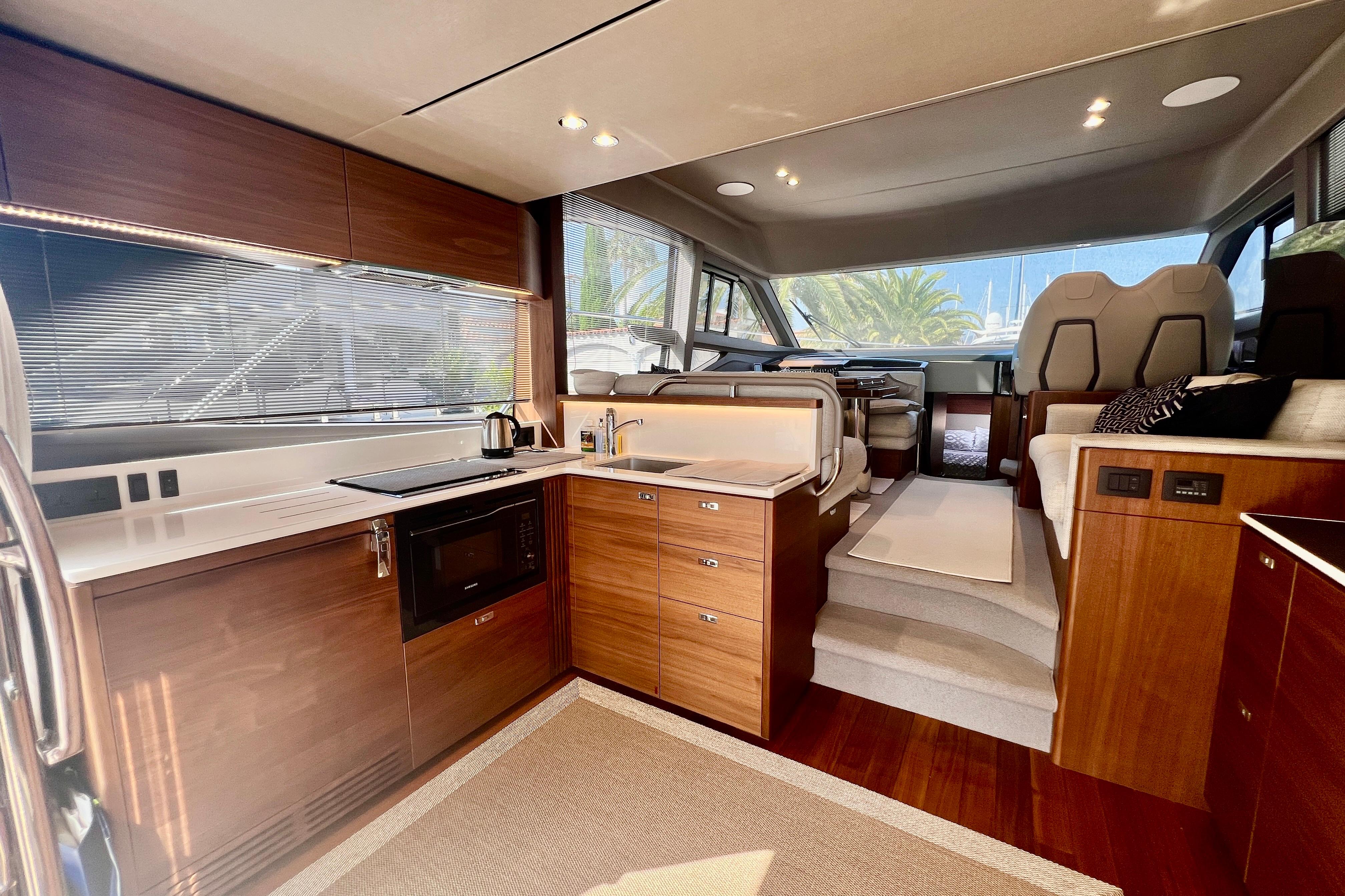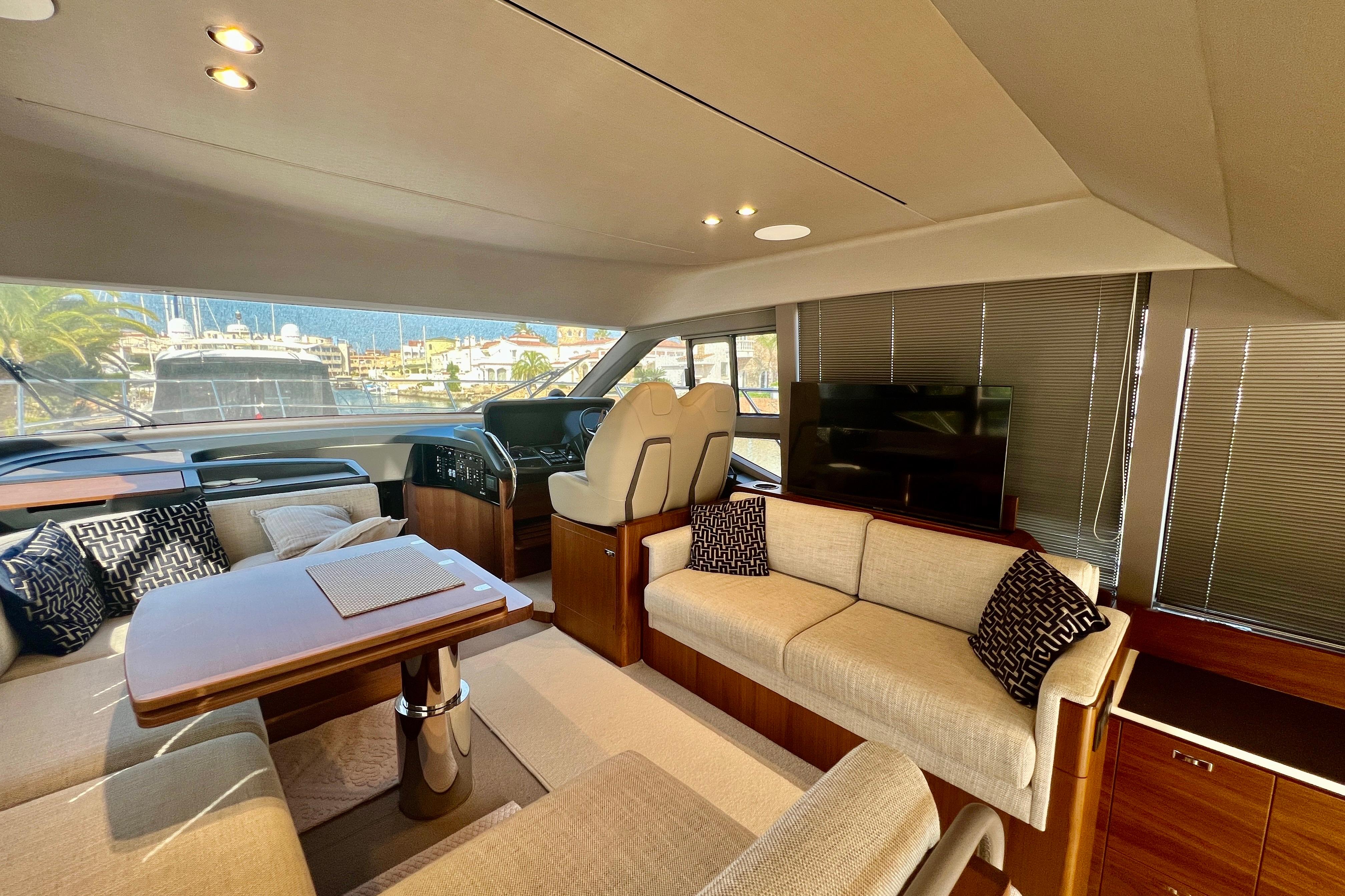 El interior de la F50 refleja el refinado estilo británico de Princess, con acabados de alta gama, carpintería artesanal, y una paleta de colores suaves y sofisticados. El salón principal, a nivel del puente, está dividido en una zona de comedor y otra de descanso, con un sofá en forma de U, una mesa abatible y una cocina completamente equipada en la parte posterior, conectando perfectamente con la bañera exterior.