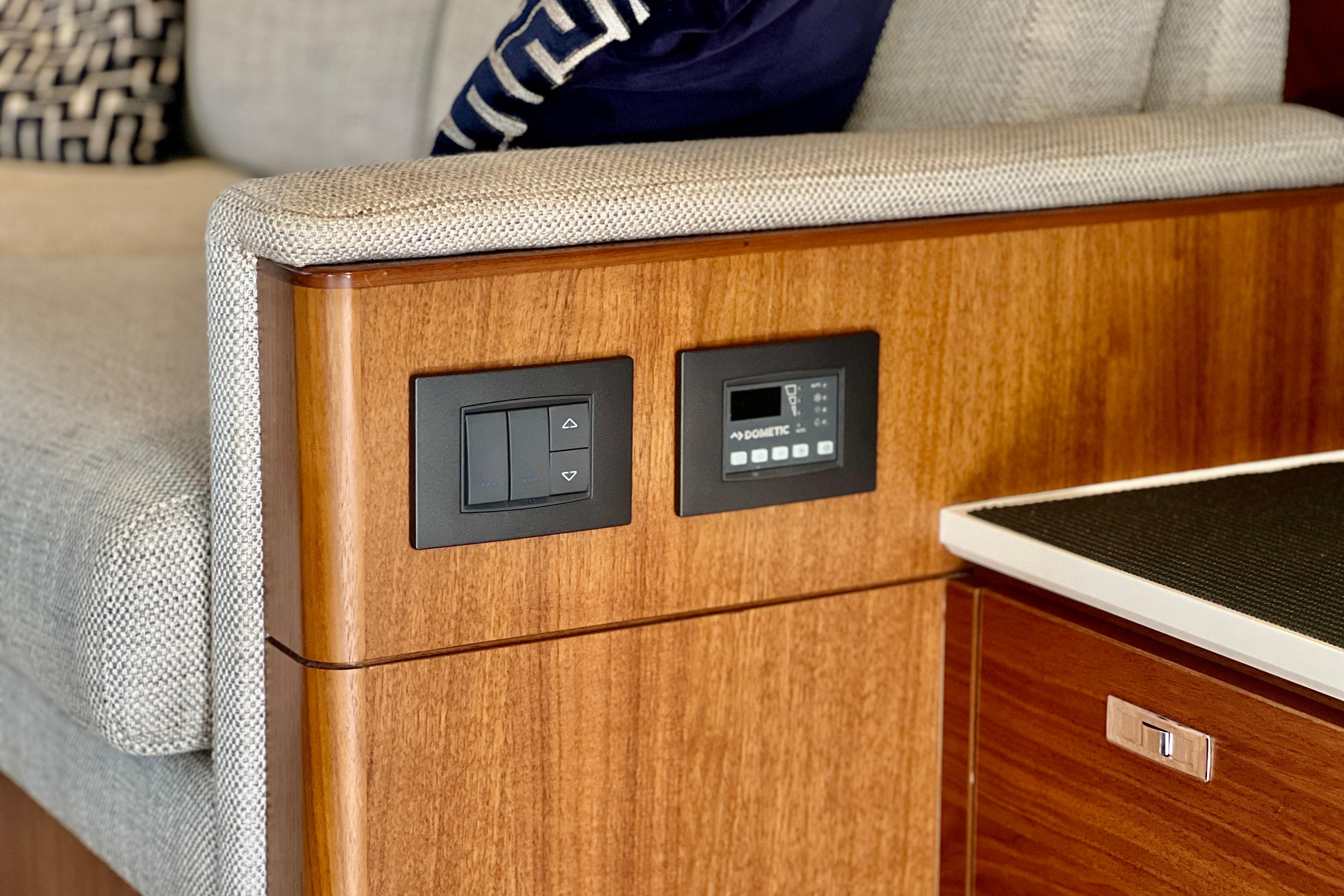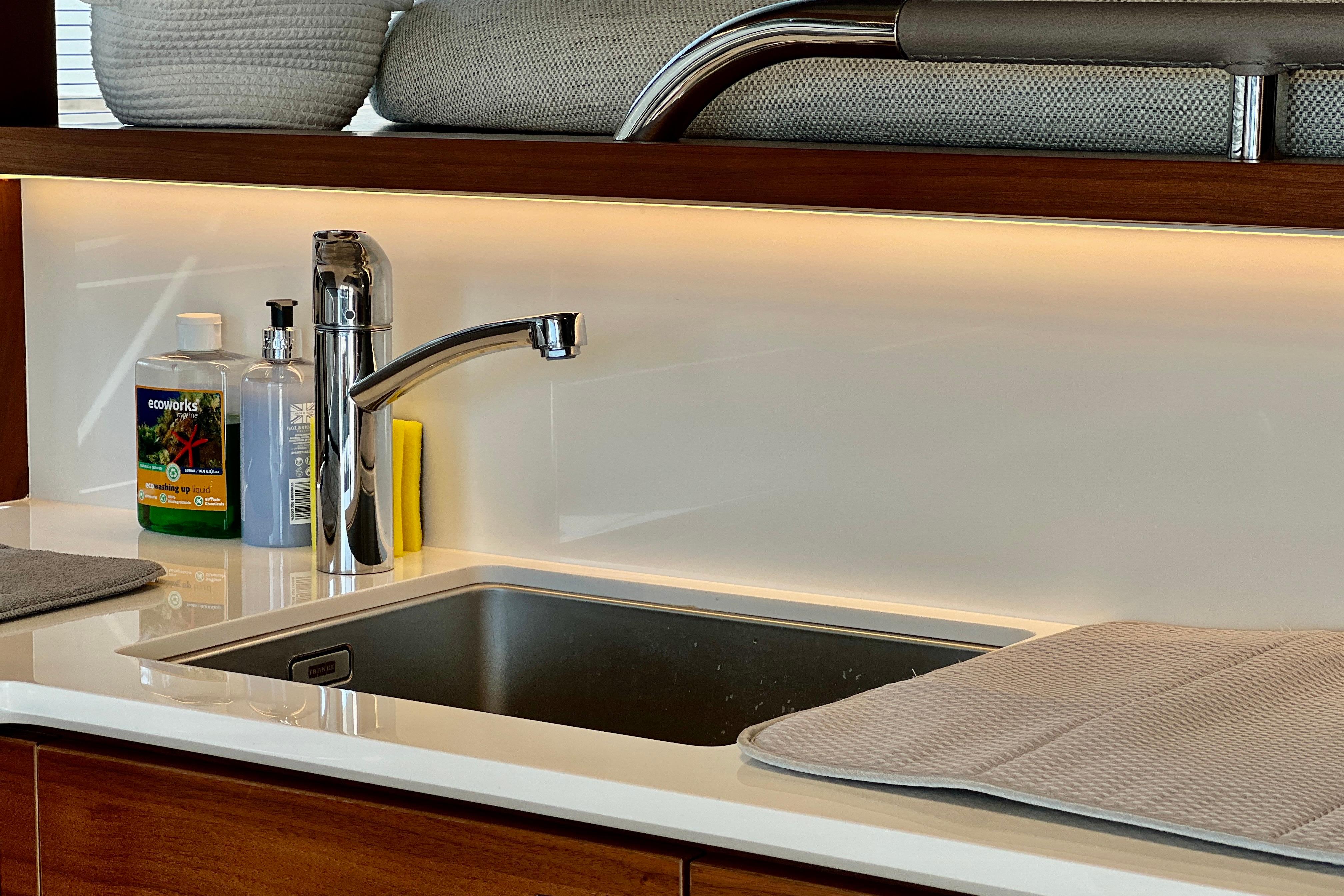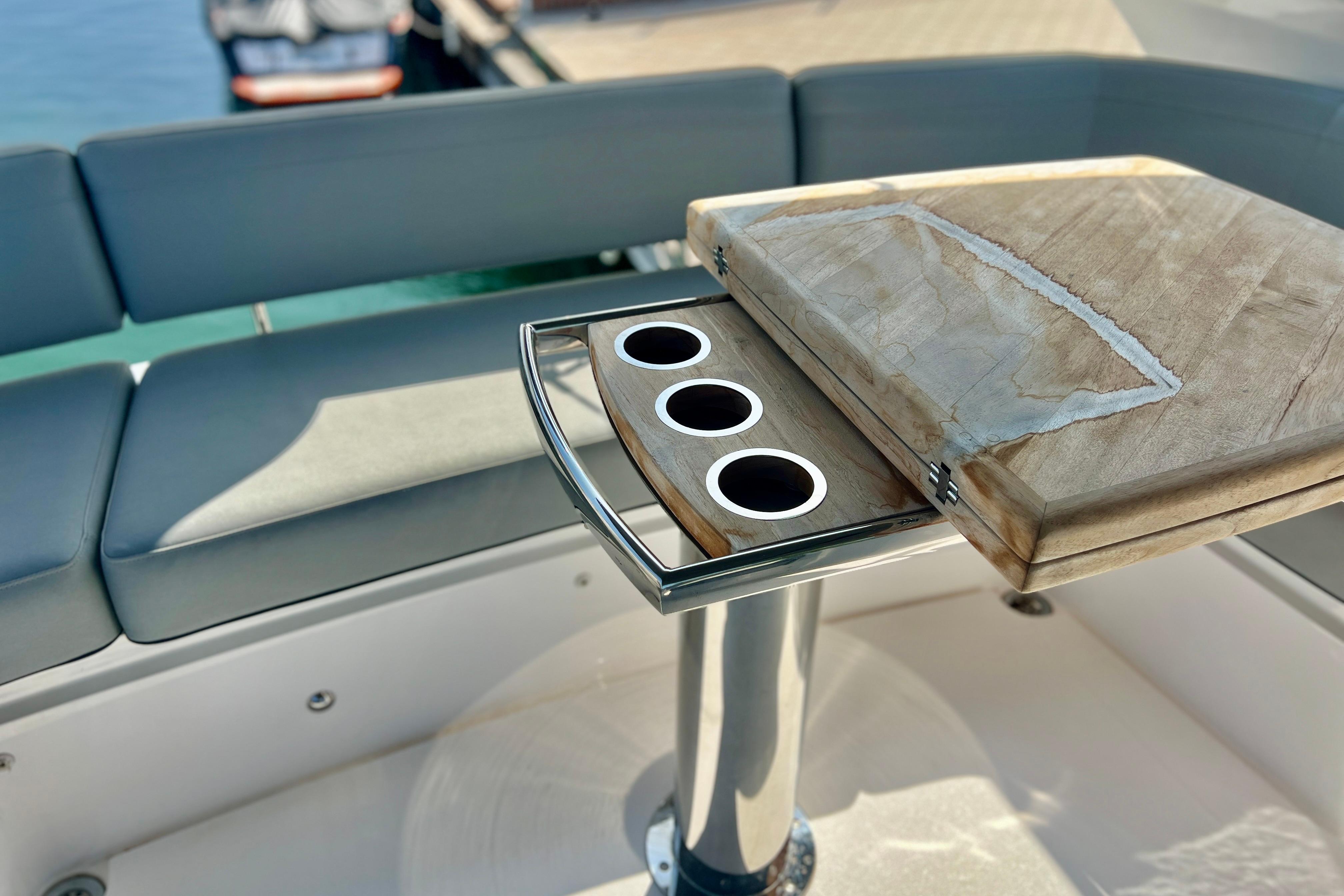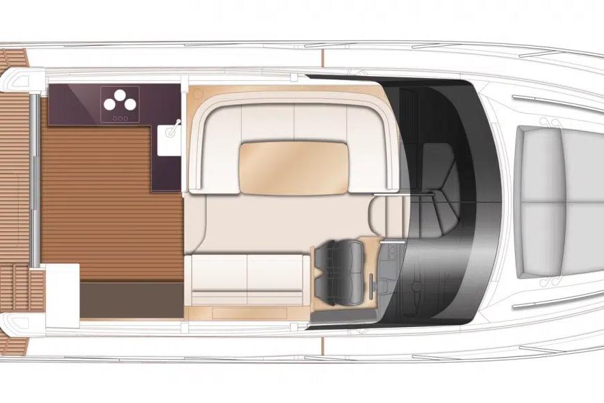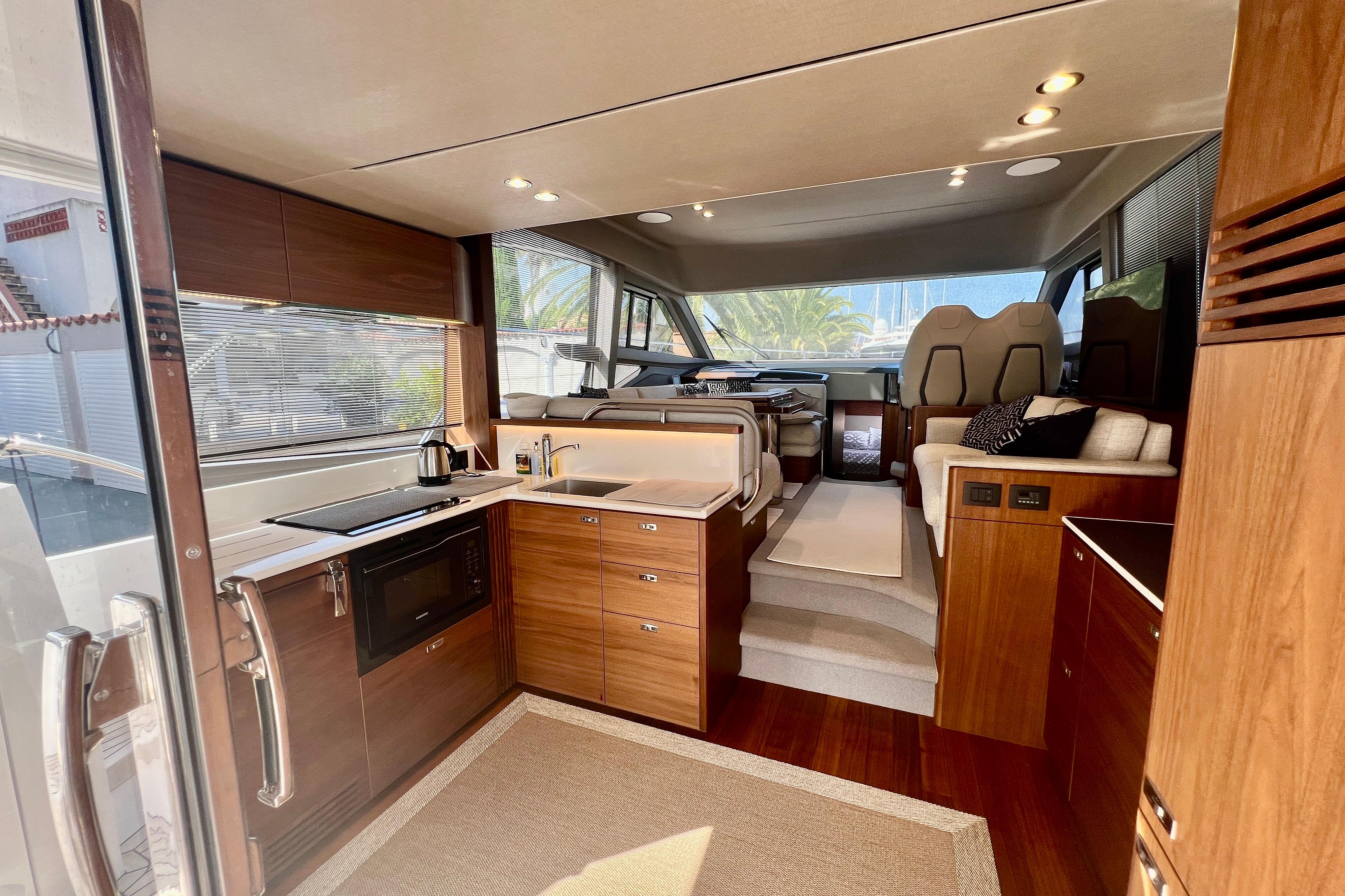 El interior de la F50 refleja el refinado estilo británico de Princess, con acabados de alta gama, carpintería artesanal, y una paleta de colores suaves y sofisticados. El salón principal, a nivel del puente, está dividido en una zona de comedor y otra de descanso, con un sofá en forma de U, una mesa abatible y una cocina completamente equipada en la parte posterior, conectando perfectamente con la bañera exterior.