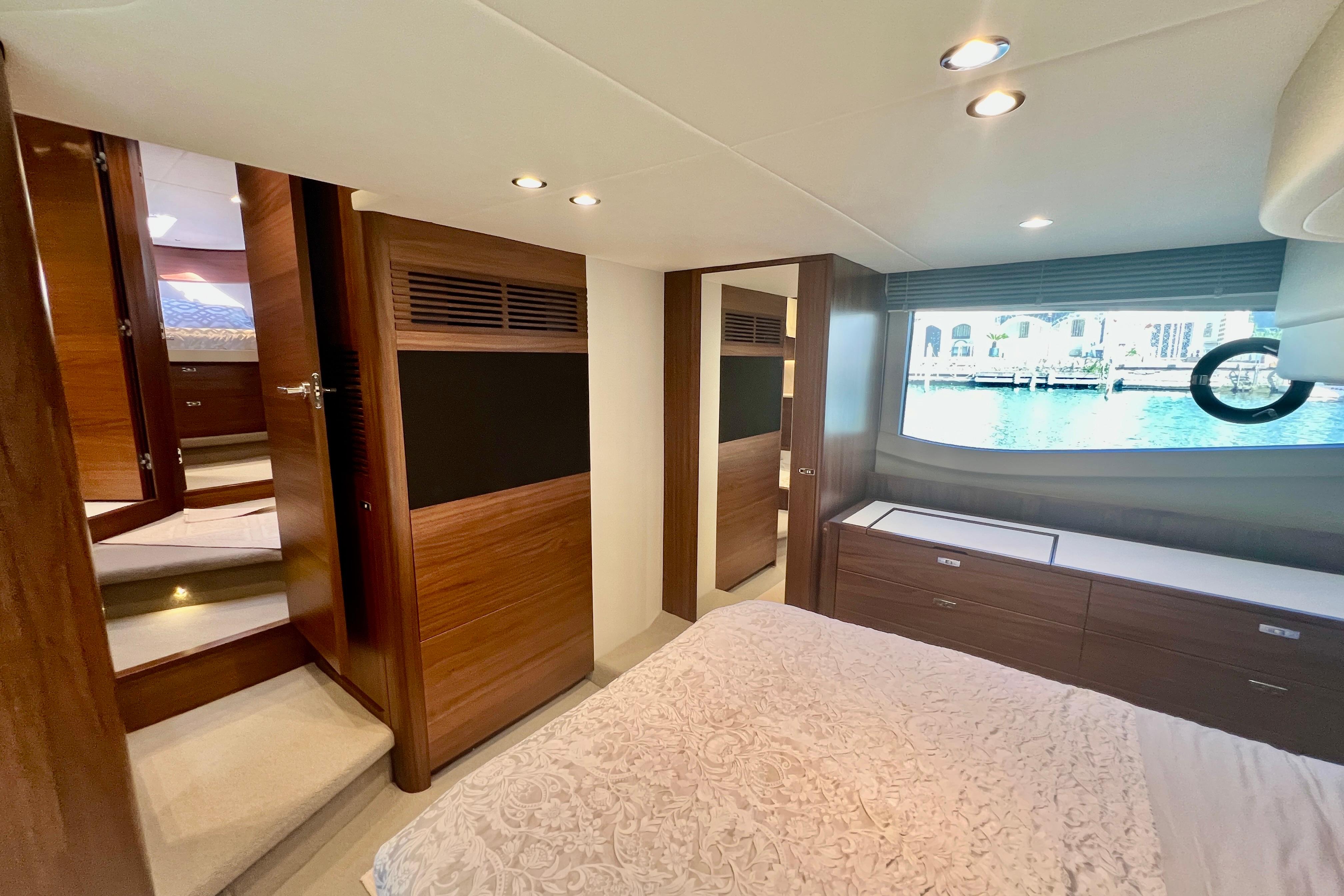 Una cabina principal tipo suite a toda la manga, con baño privado, grandes ventanales panorámicos y zona de tocador.