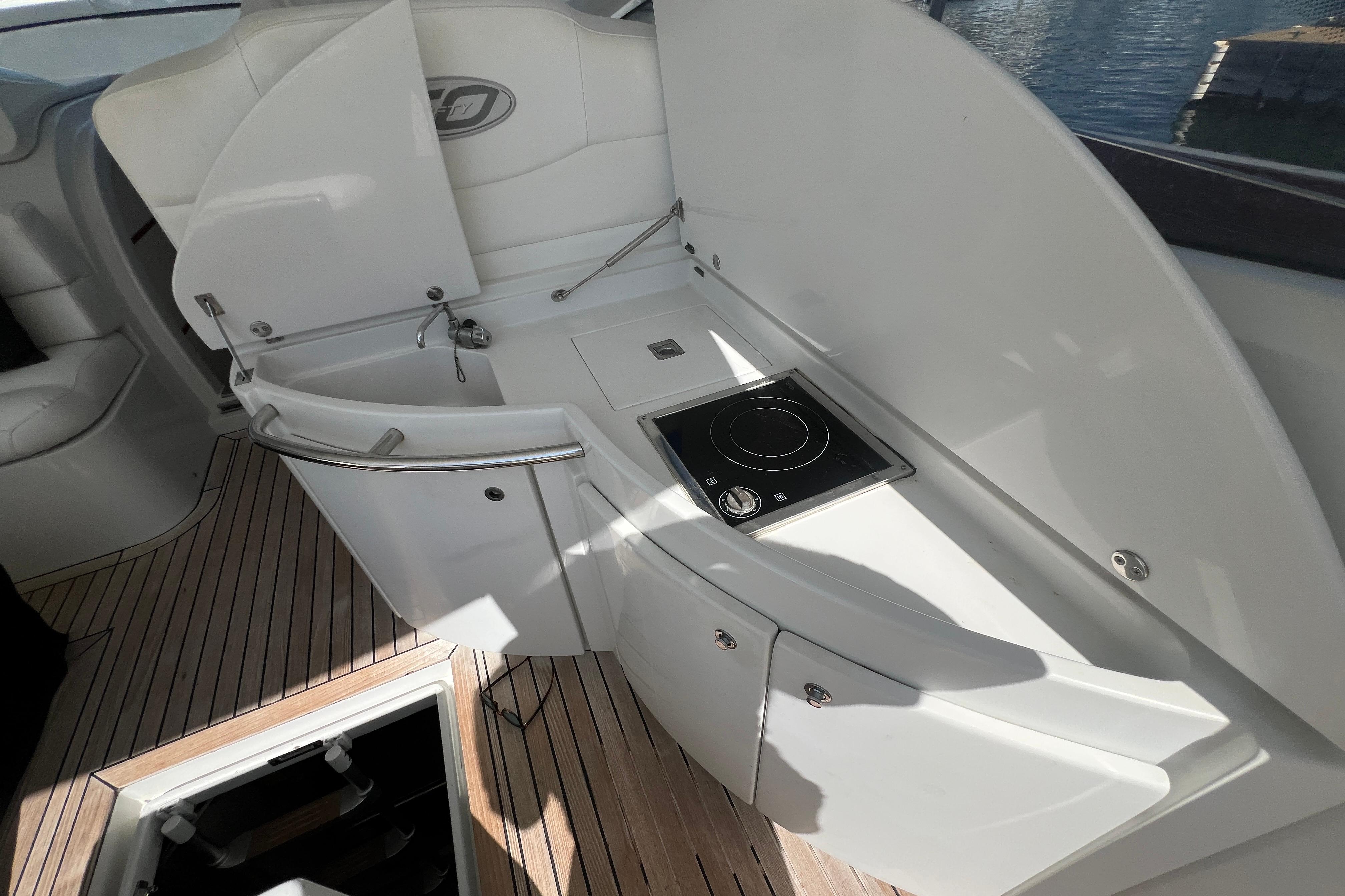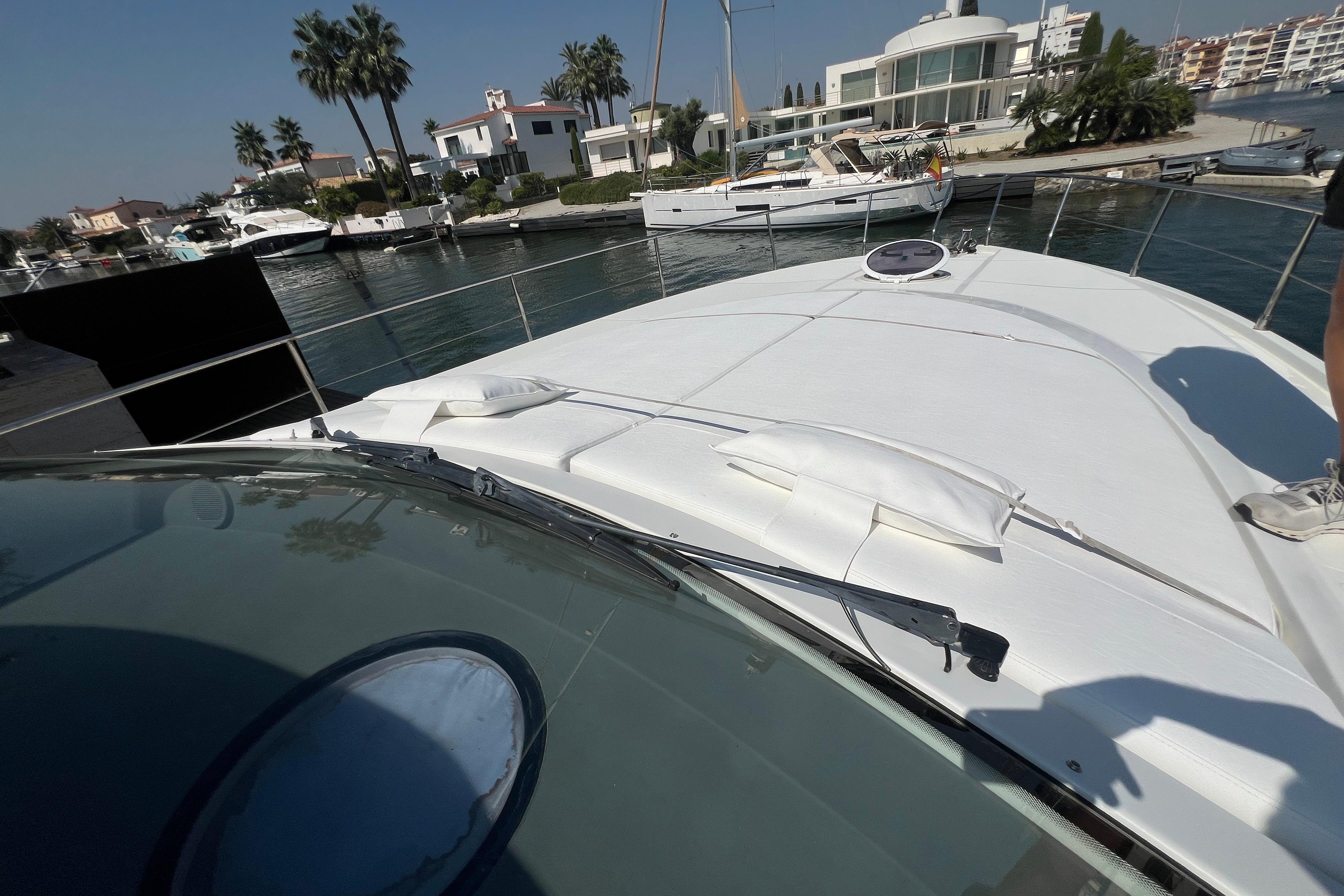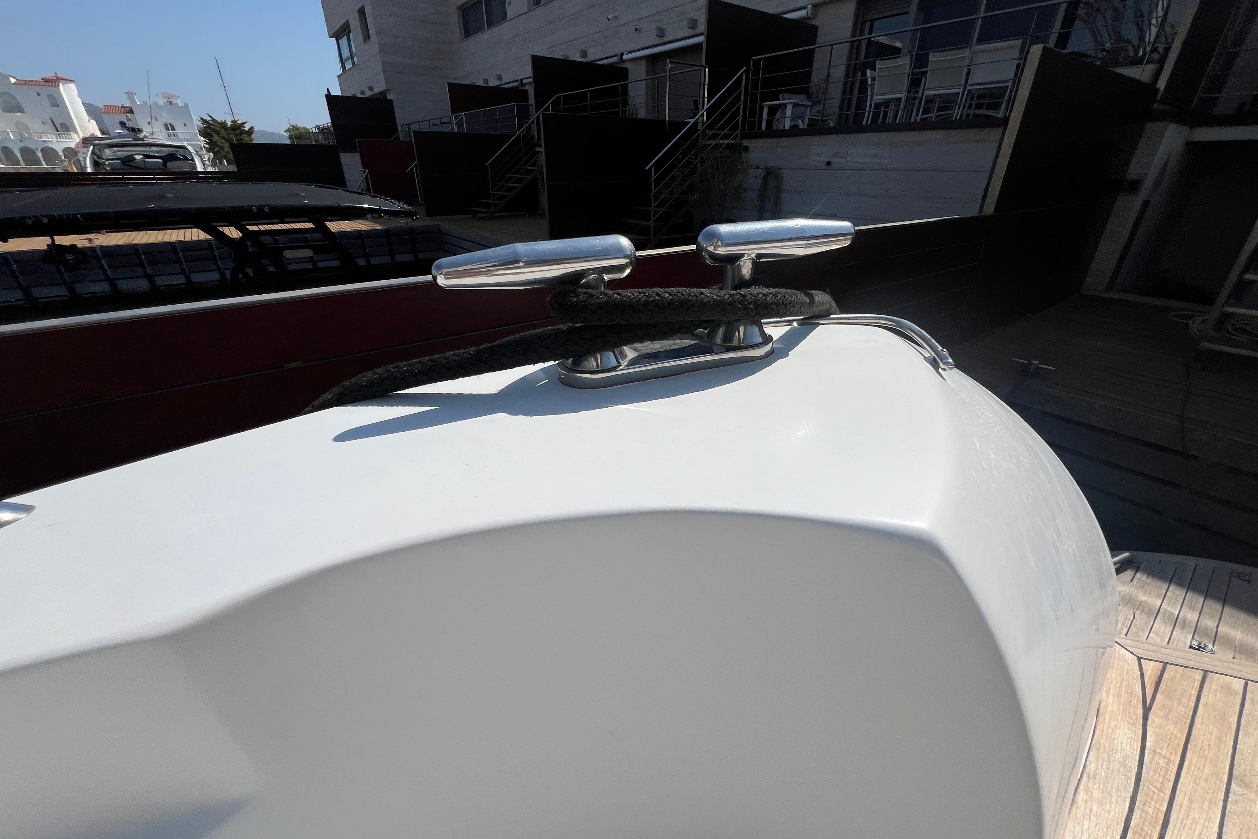 Su distribución interior incluye dos camarotes; principal en proa con baño en suite y otro con dos camas en popas, un salón amplio y luminoso y una cocina totalmente equipada. En el exterior, destaca la bañera con dinette, solárium en proa y popa, y plataforma de baño integrada, ideales para el ocio y el relax.