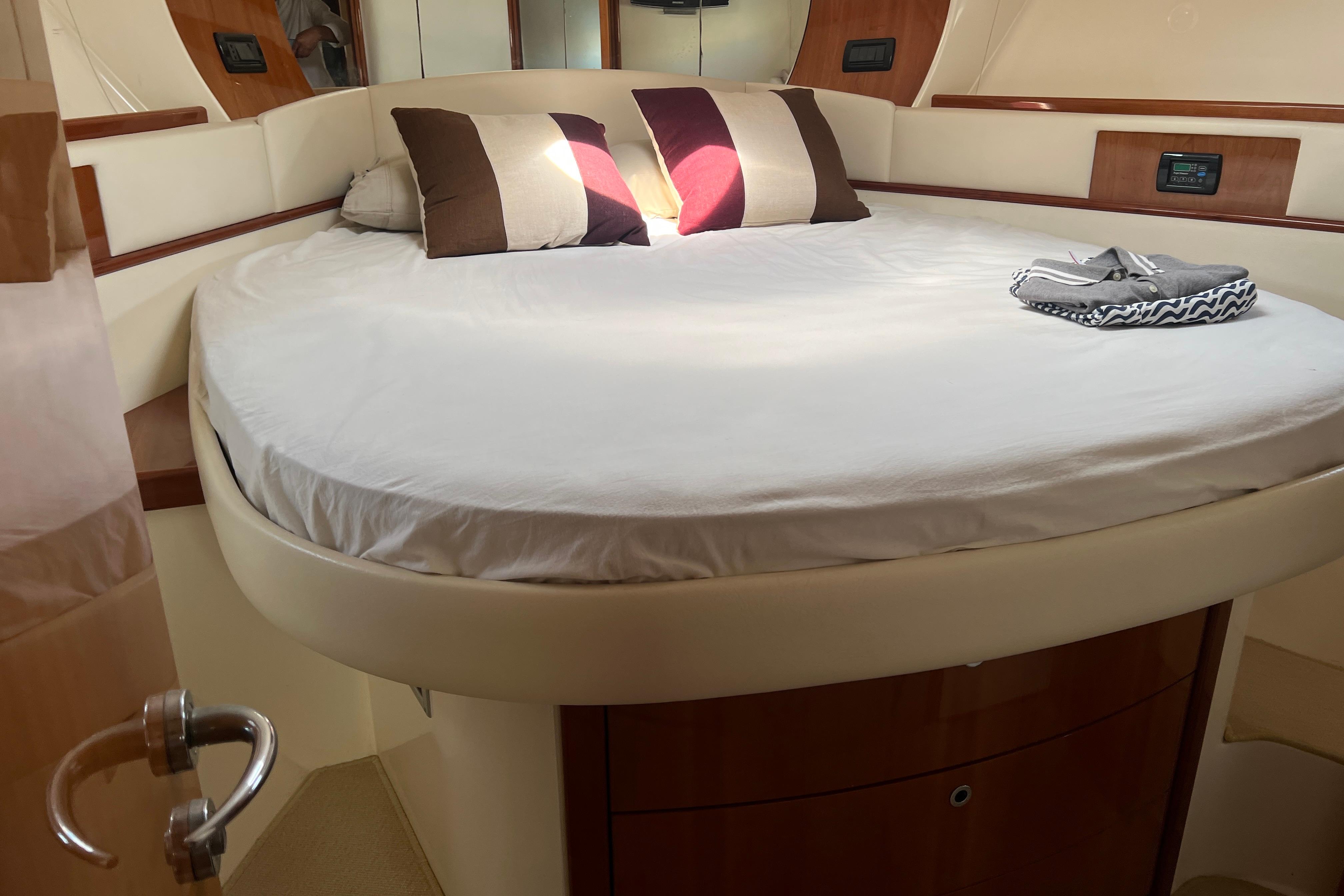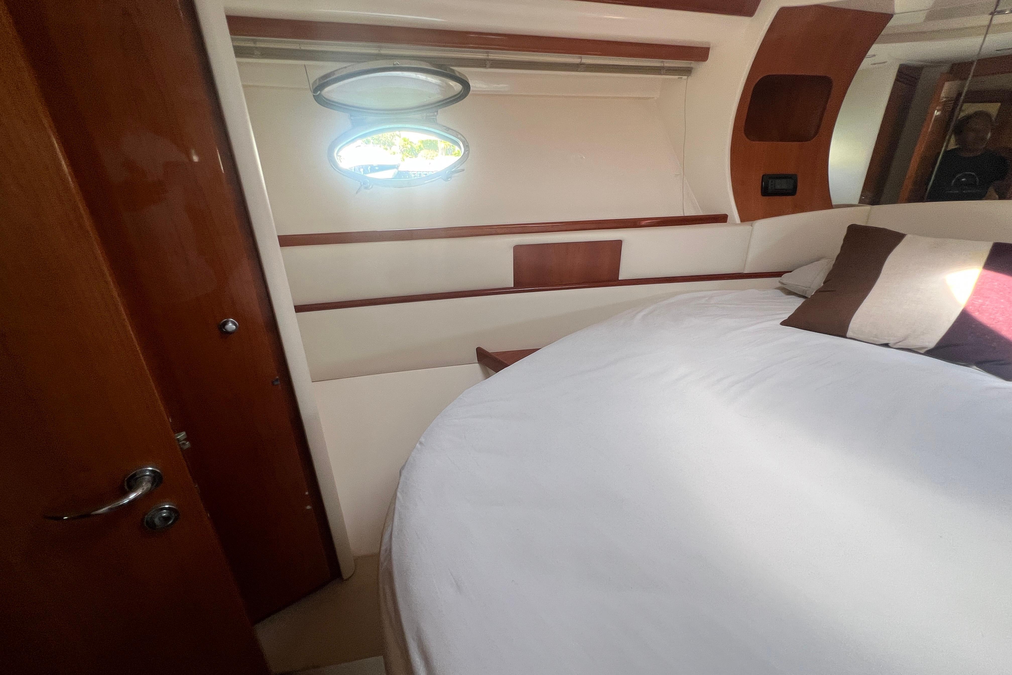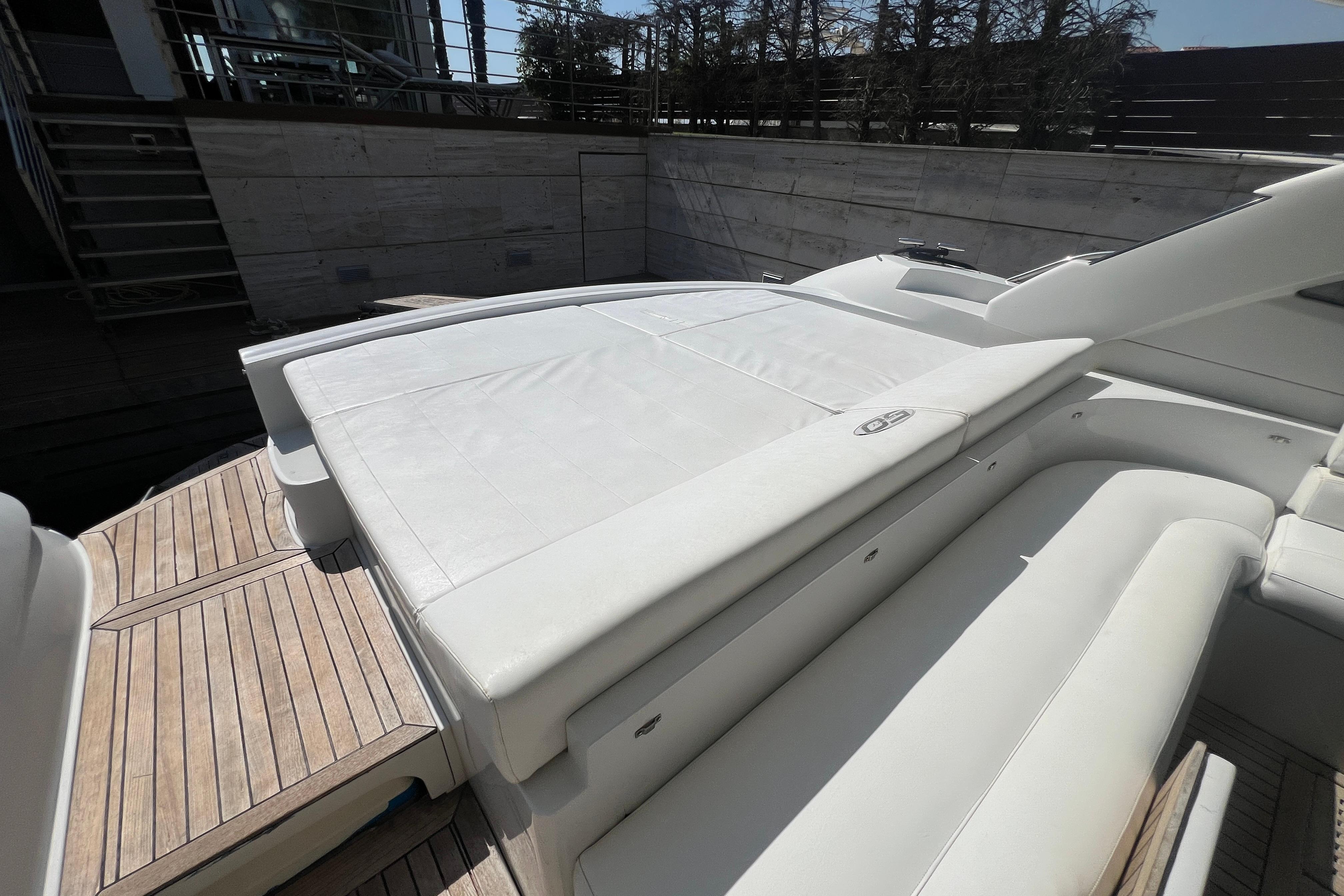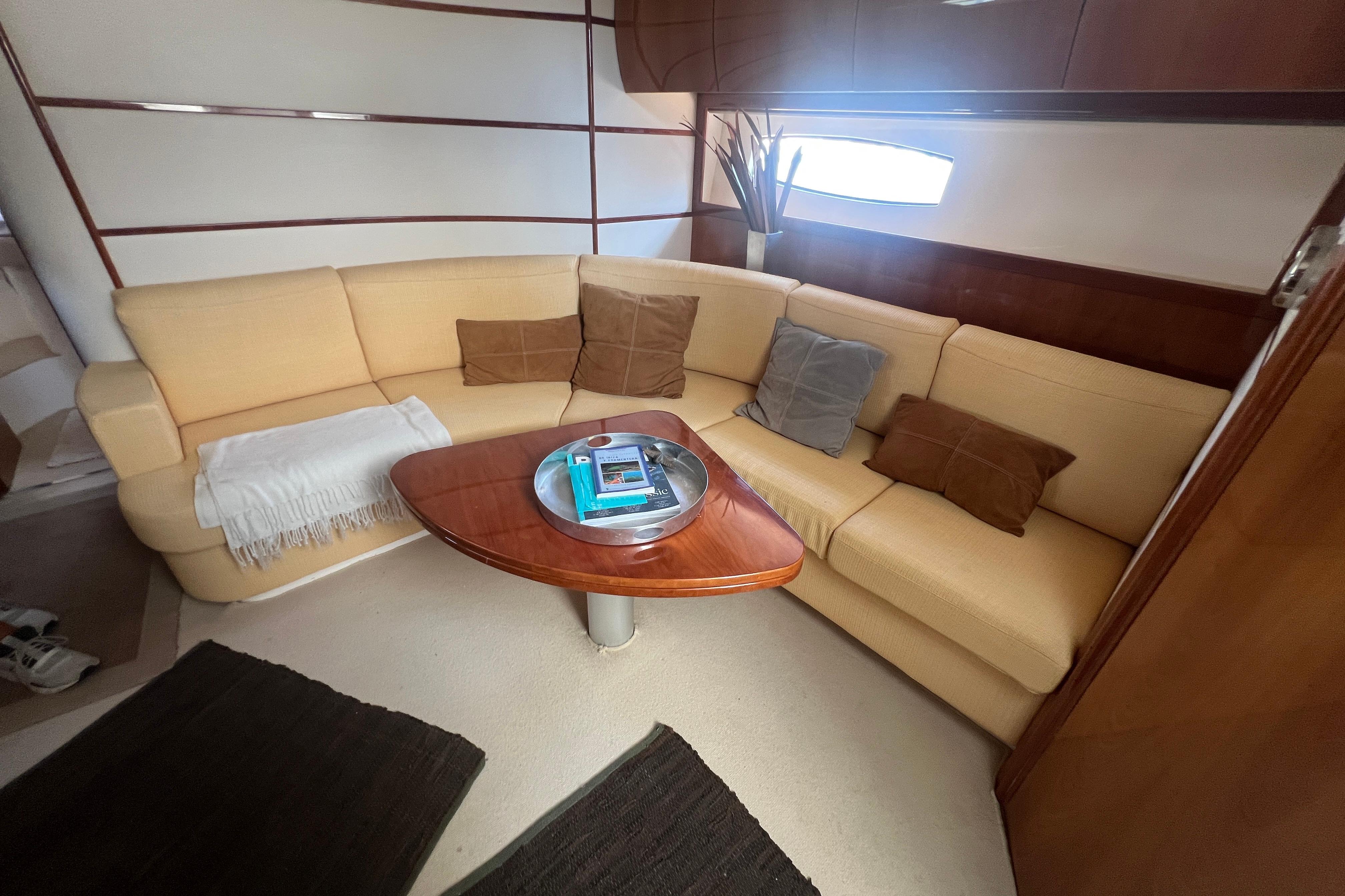 Su distribución interior incluye dos camarotes; principal en proa con baño en suite y otro con dos camas en popas, un salón amplio y luminoso y una cocina totalmente equipada. En el exterior, destaca la bañera con dinette, solárium en proa y popa, y plataforma de baño integrada, ideales para el ocio y el relax.